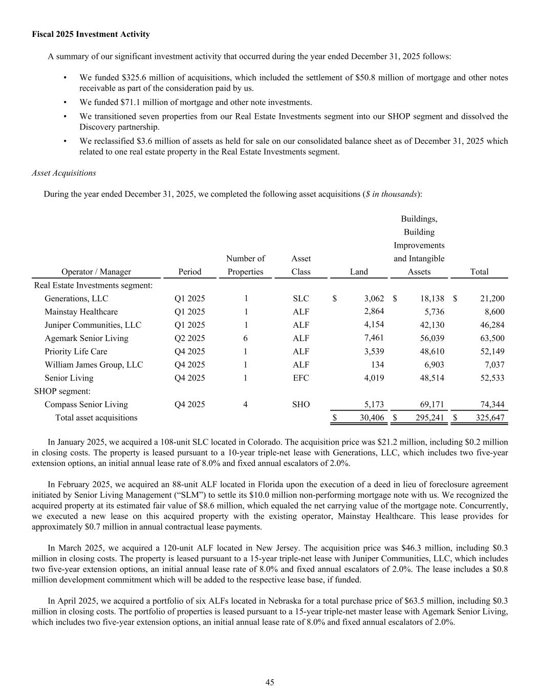 A summary of our significant investment activity that occurred during the year ended December 31, 2025 follows: • We funded $325.6 million of acquisitions, which included the settlement of $50.8 million of mortgage and other notes receivable as part of the consideration paid by us. • We funded $71.1 million of mortgage and other note investments. • We transitioned seven properties from our Real Estate Investments segment into our SHOP segment and dissolved the Discovery partnership. • We reclassified $3.6 million of assets as held for sale on our consolidated balance sheet as of December 31, 2025 which related to one real estate property in the Real Estate Investments segment. Asset Acquisitions During the year ended December 31, 2025, we completed the following asset acquisitions ($ in thousands): Buildings, Building Improvements Number of Asset and Intangible Operator / Manager Period Properties Class Land Assets Total Real Estate Investments segment: Generations, LLC Q1 2025 1 SLC $ 3,062 $ 18,138 $ 21,200 Mainstay Healthcare Q1 2025 1 ALF 2,864 5,736 8,600 Juniper Communities, LLC Q1 2025 1 ALF 4,154 42,130 46,284 Agemark Senior Living Q2 2025 6 ALF 7,461 56,039 63,500 Priority Life Care Q4 2025 1 ALF 3,539 48,610 52,149 William James Group, LLC Q4 2025 1 ALF 134 6,903 7,037 Senior Living Q4 2025 1 EFC 4,019 48,514 52,533 SHOP segment: Compass Senior Living Q4 2025 4 SHO 5,173 69,171 74,344 Total asset acquisitions $ 30,406 $ 295,241 $ 325,647 In January 2025, we acquired a 108-unit SLC located in Colorado. The acquisition price was $21.2 million, including $0.2 million in closing costs. The property is leased pursuant to a 10-year triple-net lease with Generations, LLC, which includes two five-year extension options, an initial annual lease rate of 8.0% and fixed annual escalators of 2.0%. In February 2025, we acquired an 88-unit ALF located in Florida upon the execution of a deed in lieu of foreclosure agreement initiated by Senior Living Management (“SLM”) to settle its $10.0 million non-performing mortgage note with us. We recognized the acquired property at its estimated fair value of $8.6 million, which equaled the net carrying value of the mortgage note. Concurrently, we executed a new lease on this acquired property with the existing operator, Mainstay Healthcare. This lease provides for approximately $0.7 million in annual contractual lease payments. In March 2025, we acquired a 120-unit ALF located in New Jersey. The acquisition price was $46.3 million, including $0.3 million in closing costs. The property is leased pursuant to a 15-year triple-net lease with Juniper Communities, LLC, which includes two five-year extension options, an initial annual lease rate of 8.0% and fixed annual escalators of 2.0%. The lease includes a $0.8 million development commitment which will be added to the respective lease base, if funded. In April 2025, we acquired a portfolio of six ALFs located in Nebraska for a total purchase price of $63.5 million, including $0.3 million in closing costs. The portfolio of properties is leased pursuant to a 15-year triple-net master lease with Agemark Senior Living, which includes two five-year extension options, an initial annual lease rate of 8.0% and fixed annual escalators of 2.0%. Fiscal 2025 Investment Activity 45