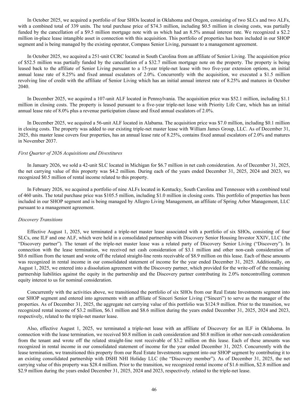 In June 2024, we acquired a 110-unit ALF located in Wisconsin. The acquisition price of $32.1 million, including $0.1 million in closing costs, was partially funded by the cancellation of a construction loan with us which had an outstanding balance of $22.2 million, including accrued interest. The property was added to our existing triple-net master lease with Encore Senior Living for a term of 15 years at an initial annual lease rate of 8.25% and fixed annual escalators of 2.2%. In October 2024, we acquired a portfolio of 10 ALFs located in North Carolina for a total purchase price of $121.0 million, excluding $0.3 million in closing costs. The properties are leased pursuant to a 15-year triple-net master lease, which includes two five-year extension options, an initial annual lease rate of 8.25% and fixed annual escalators of 2.0%. The master lease also provides for a $10.0 million lease incentive which will be added to the respective lease base if funded. In December 2024, we acquired an ALF located in Georgia. The acquisition price was $6.9 million, including $0.1 million in closing costs. The property was added to our existing 10-year triple-net master lease with William James Group, LLC, which includes two five-year extension options, an annual lease rate of 8.5% and fixed annual escalators of 2.0%. First Quarter of 2026 Acquisitions In February 2026, we acquired a portfolio of nine ALFs located in Kentucky, South Carolina and Tennessee with a combined total of 460 units. The total purchase price was $105.5 million, including $1.0 million in closing costs. This portfolio of properties has been included in our SHOP segment and is being managed by Allegro Living Management, an affiliate of Spring Arbor Management, LLC pursuant to a management agreement. Discovery Transitions Effective August 1, 2025, we terminated a triple-net master lease associated with a portfolio of six SHOs, consisting of four SLCs, one ILF and one ALF, which were held in a consolidated partnership with Discovery Senior Housing Investor XXIV, LLC (the “Discovery partner”). The tenant of the triple-net master lease was a related party of Discovery Senior Living (“Discovery”). In connection with the lease termination, we received net cash consideration of $3.1 million and other non-cash consideration of $0.6 million from the tenant and wrote off the related straight-line rents receivable of $8.9 million on this lease. Each of these amounts was recognized in rental income in our consolidated statement of income for the year ended December 31, 2025. Additionally, on August 1, 2025, we entered into a dissolution agreement with the Discovery partner, which provided for the write-off of the remaining partnership liabilities against the equity in the partnership and the Discovery partner contributing its 2.0% noncontrolling common equity interest to us for nominal consideration. Concurrently with the activities above, we transitioned the portfolio of six SHOs from our Real Estate Investments segment into our SHOP segment and entered into agreements with an affiliate of Sinceri Senior Living (“Sinceri”) to serve as the manager of the properties. As of December 31, 2025, the aggregate net carrying value of this portfolio was $124.9 million. Prior to the transition, we recognized rental income of $3.2 million, $6.1 million and $8.6 million during the years ended December 31, 2025, 2024 and 2023, respectively, related to the triple-net master lease. Also, effective August 1, 2025, we terminated a triple-net lease with an affiliate of Discovery related to an ILF in Oklahoma. In connection with the lease termination, we received $0.8 million in cash consideration and $0.8 million in other non-cash consideration from the tenant and wrote off the related straight-line rents receivable of $3.2 million on this lease. Each of these amounts was recognized in rental income in our consolidated statement of income for the year ended December 31, 2025. Concurrently with the lease termination, we transitioned this property from our Real Estate Investments segment into our SHOP segment by contributing it to an existing consolidated partnership with DSHI NHI Holiday LLC (the “Discovery member”). As of December 31, 2025, the net carrying value of this property was $28.4 million. Prior to the transition, we recognized rental income of $1.6 million, $2.8 million and $2.9 million during the years ended December 31, 2025, 2024 and 2023, respectively. related to the triple-net lease. 87