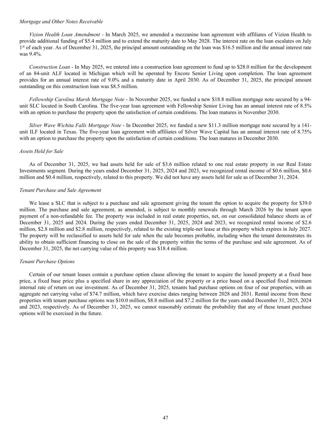 Mortgage and Other Notes Receivable Vizion Health Loan Amendment - In March 2025, we amended a mezzanine loan agreement with affiliates of Vizion Health to provide additional funding of $5.4 million and to extend the maturity date to May 2028. The interest rate on the loan escalates on July 1st of each year. As of December 31, 2025, the principal amount outstanding on the loan was $16.5 million and the annual interest rate was 9.4%. Construction Loan - In May 2025, we entered into a construction loan agreement to fund up to $28.0 million for the development of an 84-unit ALF located in Michigan which will be operated by Encore Senior Living upon completion. The loan agreement provides for an annual interest rate of 9.0% and a maturity date in April 2030. As of December 31, 2025, the principal amount outstanding on this construction loan was $8.5 million. Fellowship Carolina Marsh Mortgage Note - In November 2025, we funded a new $18.8 million mortgage note secured by a 94- unit SLC located in South Carolina. The five-year loan agreement with Fellowship Senior Living has an annual interest rate of 8.5% with an option to purchase the property upon the satisfaction of certain conditions. The loan matures in November 2030. Silver Wave Wichita Falls Mortgage Note - In December 2025, we funded a new $11.3 million mortgage note secured by a 141- unit ILF located in Texas. The five-year loan agreement with affiliates of Silver Wave Capital has an annual interest rate of 8.75% with an option to purchase the property upon the satisfaction of certain conditions. The loan matures in December 2030. Assets Held for Sale As of December 31, 2025, we had assets held for sale of $3.6 million related to one real estate property in our Real Estate Investments segment. During the years ended December 31, 2025, 2024 and 2023, we recognized rental income of $0.6 million, $0.6 million and $0.4 million, respectively, related to this property. We did not have any assets held for sale as of December 31, 2024. Tenant Purchase and Sale Agreement We lease a SLC that is subject to a purchase and sale agreement giving the tenant the option to acquire the property for $39.0 million. The purchase and sale agreement, as amended, is subject to monthly renewals through March 2026 by the tenant upon payment of a non-refundable fee. The property was included in real estate properties, net, on our consolidated balance sheets as of December 31, 2025 and 2024. During the years ended December 31, 2025, 2024 and 2023, we recognized rental income of $2.6 million, $2.8 million and $2.8 million, respectively, related to the existing triple-net lease at this property which expires in July 2027. The property will be reclassified to assets held for sale when the sale becomes probable, including when the tenant demonstrates its ability to obtain sufficient financing to close on the sale of the property within the terms of the purchase and sale agreement. As of December 31, 2025, the net carrying value of this property was $18.4 million. Tenant Purchase Options Certain of our tenant leases contain a purchase option clause allowing the tenant to acquire the leased property at a fixed base price, a fixed base price plus a specified share in any appreciation of the property or a price based on a specified fixed minimum internal rate of return on our investment. As of December 31, 2025, tenants had purchase options on four of our properties, with an aggregate net carrying value of $74.7 million, which have exercise dates ranging between 2028 and 2031. Rental income from these properties with tenant purchase options was $10.0 million, $8.8 million and $7.2 million for the years ended December 31, 2025, 2024 and 2023, respectively. As of December 31, 2025, we cannot reasonably estimate the probability that any of these tenant purchase options will be exercised in the future. 47