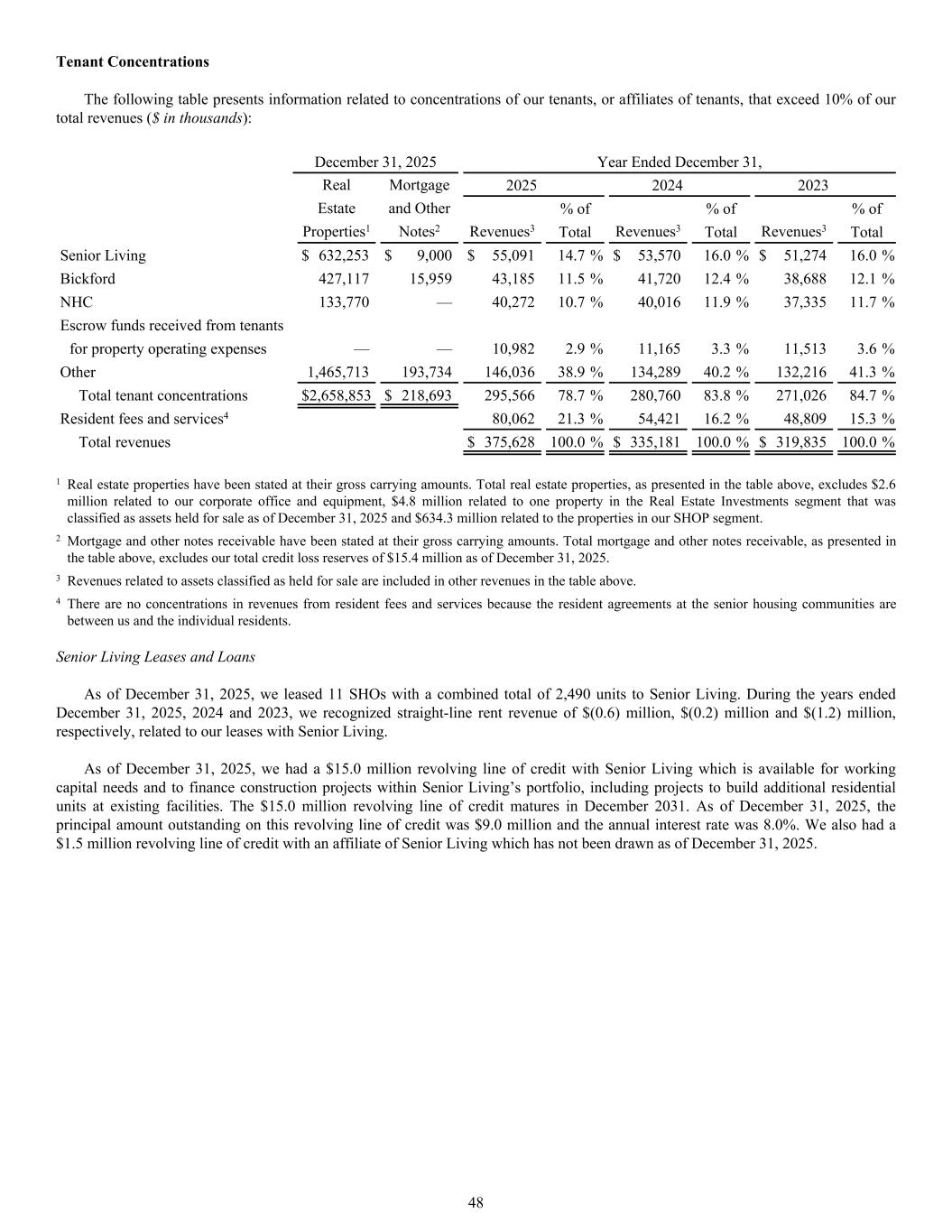 December 31, 2025 Year Ended December 31, Real Mortgage 2025 2024 2023 Estate and Other % of % of % of Properties1 Notes2 Revenues3 Total Revenues3 Total Revenues3 Total Senior Living $ 632,253 $ 9,000 $ 55,091 14.7 % $ 53,570 16.0 % $ 51,274 16.0 % Bickford 427,117 15,959 43,185 11.5 % 41,720 12.4 % 38,688 12.1 % NHC 133,770 — 40,272 10.7 % 40,016 11.9 % 37,335 11.7 % Escrow funds received from tenants for property operating expenses — — 10,982 2.9 % 11,165 3.3 % 11,513 3.6 % Other 1,465,713 193,734 146,036 38.9 % 134,289 40.2 % 132,216 41.3 % Total tenant concentrations $ 2,658,853 $ 218,693 295,566 78.7 % 280,760 83.8 % 271,026 84.7 % Resident fees and services4 80,062 21.3 % 54,421 16.2 % 48,809 15.3 % Total revenues $ 375,628 100.0 % $ 335,181 100.0 % $ 319,835 100.0 % 1 Real estate properties have been stated at their gross carrying amounts. Total real estate properties, as presented in the table above, excludes $2.6 million related to our corporate office and equipment, $4.8 million related to one property in the Real Estate Investments segment that was classified as assets held for sale as of December 31, 2025 and $634.3 million related to the properties in our SHOP segment. 2 Mortgage and other notes receivable have been stated at their gross carrying amounts. Total mortgage and other notes receivable, as presented in the table above, excludes our total credit loss reserves of $15.4 million as of December 31, 2025. 3 Revenues related to assets classified as held for sale are included in other revenues in the table above. 4 There are no concentrations in revenues from resident fees and services because the resident agreements at the senior housing communities are between us and the individual residents. Senior Living Leases and Loans As of December 31, 2025, we leased 11 SHOs with a combined total of 2,490 units to Senior Living. During the years ended December 31, 2025, 2024 and 2023, we recognized straight-line rent revenue of $(0.6) million, $(0.2) million and $(1.2) million, respectively, related to our leases with Senior Living. As of December 31, 2025, we had a $15.0 million revolving line of credit with Senior Living which is available for working capital needs and to finance construction projects within Senior Living’s portfolio, including projects to build additional residential units at existing facilities. The $15.0 million revolving line of credit matures in December 2031. As of December 31, 2025, the principal amount outstanding on this revolving line of credit was $9.0 million and the annual interest rate was 8.0%. We also had a $1.5 million revolving line of credit with an affiliate of Senior Living which has not been drawn as of December 31, 2025. Tenant Concentrations The following table presents information related to concentrations of our tenants, or affiliates of tenants, that exceed 10% of our total revenues ($ in thousands): 48
