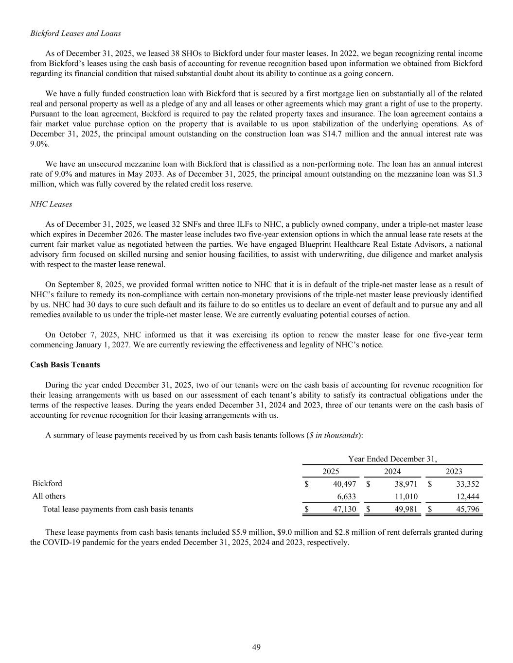 A summary of lease payments received by us from cash basis tenants follows ($ in thousands): Year Ended December 31, 2025 2024 2023 Bickford $ 40,497 $ 38,971 $ 33,352 All others 6,633 11,010 12,444 Total lease payments from cash basis tenants $ 47,130 $ 49,981 $ 45,796 These lease payments from cash basis tenants included $5.9 million, $9.0 million and $2.8 million of rent deferrals granted during the COVID-19 pandemic for the years ended December 31, 2025, 2024 and 2023, respectively. Bickford Leases and Loans As of December 31, 2025, we leased 38 SHOs to Bickford under four master leases. In 2022, we began recognizing rental income from Bickford’s leases using the cash basis of accounting for revenue recognition based upon information we obtained from Bickford regarding its financial condition that raised substantial doubt about its ability to continue as a going concern. We have a fully funded construction loan with Bickford that is secured by a first mortgage lien on substantially all of the related real and personal property as well as a pledge of any and all leases or other agreements which may grant a right of use to the property. Pursuant to the loan agreement, Bickford is required to pay the related property taxes and insurance. The loan agreement contains a fair market value purchase option on the property that is available to us upon stabilization of the underlying operations. As of December 31, 2025, the principal amount outstanding on the construction loan was $14.7 million and the annual interest rate was 9.0%. We have an unsecured mezzanine loan with Bickford that is classified as a non-performing note. The loan has an annual interest rate of 9.0% and matures in May 2033. As of December 31, 2025, the principal amount outstanding on the mezzanine loan was $1.3 million, which was fully covered by the related credit loss reserve. NHC Leases As of December 31, 2025, we leased 32 SNFs and three ILFs to NHC, a publicly owned company, under a triple-net master lease which expires in December 2026. The master lease includes two five-year extension options in which the annual lease rate resets at the current fair market value as negotiated between the parties. We have engaged Blueprint Healthcare Real Estate Advisors, a national advisory firm focused on skilled nursing and senior housing facilities, to assist with underwriting, due diligence and market analysis with respect to the master lease renewal. On September 8, 2025, we provided formal written notice to NHC that it is in default of the triple-net master lease as a result of NHC’s failure to remedy its non-compliance with certain non-monetary provisions of the triple-net master lease previously identified by us. NHC had 30 days to cure such default and its failure to do so entitles us to declare an event of default and to pursue any and all remedies available to us under the triple-net master lease. We are currently evaluating potential courses of action. On October 7, 2025, NHC informed us that it was exercising its option to renew the master lease for one five-year term commencing January 1, 2027. We are currently reviewing the effectiveness and legality of NHC’s notice. Cash Basis Tenants During the year ended December 31, 2025, two of our tenants were on the cash basis of accounting for revenue recognition for their leasing arrangements with us based on our assessment of each tenant’s ability to satisfy its contractual obligations under the terms of the respective leases. During the years ended December 31, 2024 and 2023, three of our tenants were on the cash basis of accounting for revenue recognition for their leasing arrangements with us. 49