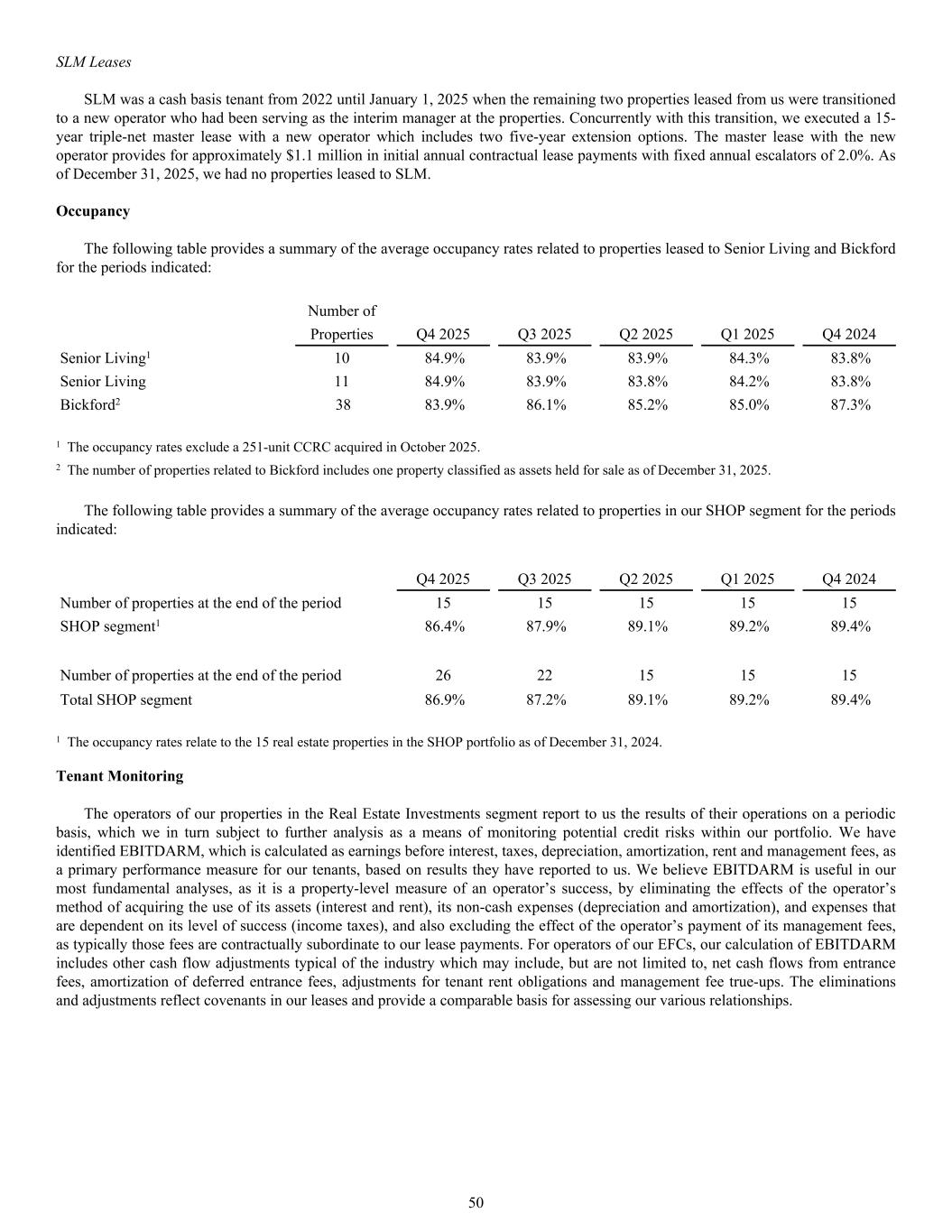Number of Properties Q4 2025 Q3 2025 Q2 2025 Q1 2025 Q4 2024 Senior Living1 10 84.9% 83.9% 83.9% 84.3% 83.8% Senior Living 11 84.9% 83.9% 83.8% 84.2% 83.8% Bickford2 38 83.9% 86.1% 85.2% 85.0% 87.3% 1 The occupancy rates exclude a 251-unit CCRC acquired in October 2025. 2 The number of properties related to Bickford includes one property classified as assets held for sale as of December 31, 2025. The following table provides a summary of the average occupancy rates related to properties in our SHOP segment for the periods indicated: Q4 2025 Q3 2025 Q2 2025 Q1 2025 Q4 2024 Number of properties at the end of the period 15 15 15 15 15 SHOP segment1 86.4% 87.9% 89.1% 89.2% 89.4% Number of properties at the end of the period 26 22 15 15 15 Total SHOP segment 86.9% 87.2% 89.1% 89.2% 89.4% 1 The occupancy rates relate to the 15 real estate properties in the SHOP portfolio as of December 31, 2024. Tenant Monitoring The operators of our properties in the Real Estate Investments segment report to us the results of their operations on a periodic basis, which we in turn subject to further analysis as a means of monitoring potential credit risks within our portfolio. We have identified EBITDARM, which is calculated as earnings before interest, taxes, depreciation, amortization, rent and management fees, as a primary performance measure for our tenants, based on results they have reported to us. We believe EBITDARM is useful in our most fundamental analyses, as it is a property-level measure of an operator’s success, by eliminating the effects of the operator’s method of acquiring the use of its assets (interest and rent), its non-cash expenses (depreciation and amortization), and expenses that are dependent on its level of success (income taxes), and also excluding the effect of the operator’s payment of its management fees, as typically those fees are contractually subordinate to our lease payments. For operators of our EFCs, our calculation of EBITDARM includes other cash flow adjustments typical of the industry which may include, but are not limited to, net cash flows from entrance fees, amortization of deferred entrance fees, adjustments for tenant rent obligations and management fee true-ups. The eliminations and adjustments reflect covenants in our leases and provide a comparable basis for assessing our various relationships. SLM Leases SLM was a cash basis tenant from 2022 until January 1, 2025 when the remaining two properties leased from us were transitioned to a new operator who had been serving as the interim manager at the properties. Concurrently with this transition, we executed a 15- year triple-net master lease with a new operator which includes two five-year extension options. The master lease with the new operator provides for approximately $1.1 million in initial annual contractual lease payments with fixed annual escalators of 2.0%. As of December 31, 2025, we had no properties leased to SLM. Occupancy The following table provides a summary of the average occupancy rates related to properties leased to Senior Living and Bickford for the periods indicated: 50