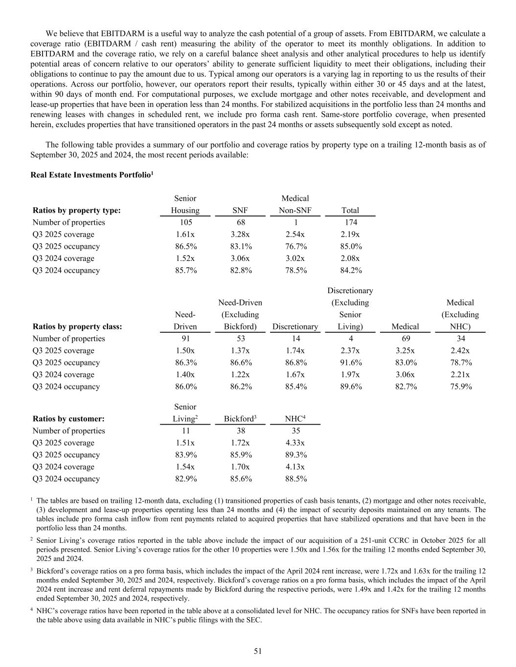 Senior Medical Ratios by property type: Housing SNF Non-SNF Total Number of properties 105 68 1 174 Q3 2025 coverage 1.61x 3.28x 2.54x 2.19x Q3 2025 occupancy 86.5% 83.1% 76.7% 85.0% Q3 2024 coverage 1.52x 3.06x 3.02x 2.08x Q3 2024 occupancy 85.7% 82.8% 78.5% 84.2% Discretionary Need-Driven (Excluding Medical Need- (Excluding Senior (Excluding Ratios by property class: Driven Bickford) Discretionary Living) Medical NHC) Number of properties 91 53 14 4 69 34 Q3 2025 coverage 1.50x 1.37x 1.74x 2.37x 3.25x 2.42x Q3 2025 occupancy 86.3% 86.6% 86.8% 91.6% 83.0% 78.7% Q3 2024 coverage 1.40x 1.22x 1.67x 1.97x 3.06x 2.21x Q3 2024 occupancy 86.0% 86.2% 85.4% 89.6% 82.7% 75.9% Senior Ratios by customer: Living2 Bickford3 NHC4 Number of properties 11 38 35 Q3 2025 coverage 1.51x 1.72x 4.33x Q3 2025 occupancy 83.9% 85.9% 89.3% Q3 2024 coverage 1.54x 1.70x 4.13x Q3 2024 occupancy 82.9% 85.6% 88.5% 1 The tables are based on trailing 12-month data, excluding (1) transitioned properties of cash basis tenants, (2) mortgage and other notes receivable, (3) development and lease-up properties operating less than 24 months and (4) the impact of security deposits maintained on any tenants. The tables include pro forma cash inflow from rent payments related to acquired properties that have stabilized operations and that have been in the portfolio less than 24 months. 2 Senior Living’s coverage ratios reported in the table above include the impact of our acquisition of a 251-unit CCRC in October 2025 for all periods presented. Senior Living’s coverage ratios for the other 10 properties were 1.50x and 1.56x for the trailing 12 months ended September 30, 2025 and 2024. 3 Bickford’s coverage ratios on a pro forma basis, which includes the impact of the April 2024 rent increase, were 1.72x and 1.63x for the trailing 12 months ended September 30, 2025 and 2024, respectively. Bickford’s coverage ratios on a pro forma basis, which includes the impact of the April 2024 rent increase and rent deferral repayments made by Bickford during the respective periods, were 1.49x and 1.42x for the trailing 12 months ended September 30, 2025 and 2024, respectively. 4 NHC’s coverage ratios have been reported in the table above at a consolidated level for NHC. The occupancy ratios for SNFs have been reported in the table above using data available in NHC’s public filings with the SEC. We believe that EBITDARM is a useful way to analyze the cash potential of a group of assets. From EBITDARM, we calculate a coverage ratio (EBITDARM / cash rent) measuring the ability of the operator to meet its monthly obligations. In addition to EBITDARM and the coverage ratio, we rely on a careful balance sheet analysis and other analytical procedures to help us identify potential areas of concern relative to our operators’ ability to generate sufficient liquidity to meet their obligations, including their obligations to continue to pay the amount due to us. Typical among our operators is a varying lag in reporting to us the results of their operations. Across our portfolio, however, our operators report their results, typically within either 30 or 45 days and at the latest, within 90 days of month end. For computational purposes, we exclude mortgage and other notes receivable, and development and lease-up properties that have been in operation less than 24 months. For stabilized acquisitions in the portfolio less than 24 months and renewing leases with changes in scheduled rent, we include pro forma cash rent. Same-store portfolio coverage, when presented herein, excludes properties that have transitioned operators in the past 24 months or assets subsequently sold except as noted. The following table provides a summary of our portfolio and coverage ratios by property type on a trailing 12-month basis as of September 30, 2025 and 2024, the most recent periods available: Real Estate Investments Portfolio1 51