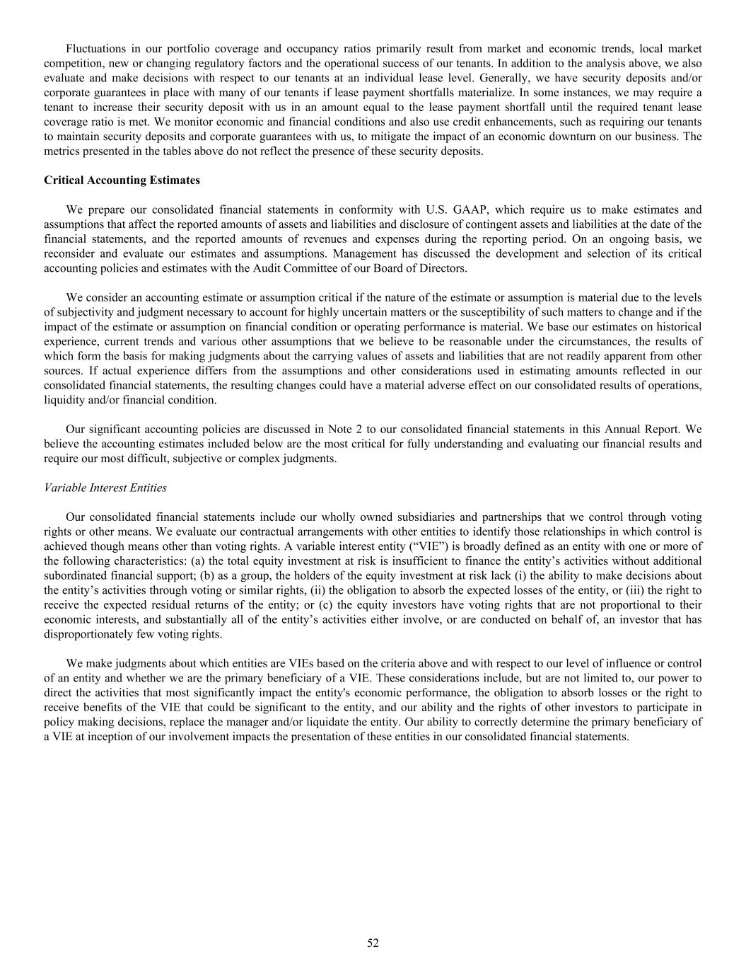 Fluctuations in our portfolio coverage and occupancy ratios primarily result from market and economic trends, local market competition, new or changing regulatory factors and the operational success of our tenants. In addition to the analysis above, we also evaluate and make decisions with respect to our tenants at an individual lease level. Generally, we have security deposits and/or corporate guarantees in place with many of our tenants if lease payment shortfalls materialize. In some instances, we may require a tenant to increase their security deposit with us in an amount equal to the lease payment shortfall until the required tenant lease coverage ratio is met. We monitor economic and financial conditions and also use credit enhancements, such as requiring our tenants to maintain security deposits and corporate guarantees with us, to mitigate the impact of an economic downturn on our business. The metrics presented in the tables above do not reflect the presence of these security deposits. Critical Accounting Estimates We prepare our consolidated financial statements in conformity with U.S. GAAP, which require us to make estimates and assumptions that affect the reported amounts of assets and liabilities and disclosure of contingent assets and liabilities at the date of the financial statements, and the reported amounts of revenues and expenses during the reporting period. On an ongoing basis, we reconsider and evaluate our estimates and assumptions. Management has discussed the development and selection of its critical accounting policies and estimates with the Audit Committee of our Board of Directors. We consider an accounting estimate or assumption critical if the nature of the estimate or assumption is material due to the levels of subjectivity and judgment necessary to account for highly uncertain matters or the susceptibility of such matters to change and if the impact of the estimate or assumption on financial condition or operating performance is material. We base our estimates on historical experience, current trends and various other assumptions that we believe to be reasonable under the circumstances, the results of which form the basis for making judgments about the carrying values of assets and liabilities that are not readily apparent from other sources. If actual experience differs from the assumptions and other considerations used in estimating amounts reflected in our consolidated financial statements, the resulting changes could have a material adverse effect on our consolidated results of operations, liquidity and/or financial condition. Our significant accounting policies are discussed in Note 2 to our consolidated financial statements in this Annual Report. We believe the accounting estimates included below are the most critical for fully understanding and evaluating our financial results and require our most difficult, subjective or complex judgments. Variable Interest Entities Our consolidated financial statements include our wholly owned subsidiaries and partnerships that we control through voting rights or other means. We evaluate our contractual arrangements with other entities to identify those relationships in which control is achieved though means other than voting rights. A variable interest entity (“VIE”) is broadly defined as an entity with one or more of the following characteristics: (a) the total equity investment at risk is insufficient to finance the entity’s activities without additional subordinated financial support; (b) as a group, the holders of the equity investment at risk lack (i) the ability to make decisions about the entity’s activities through voting or similar rights, (ii) the obligation to absorb the expected losses of the entity, or (iii) the right to receive the expected residual returns of the entity; or (c) the equity investors have voting rights that are not proportional to their economic interests, and substantially all of the entity’s activities either involve, or are conducted on behalf of, an investor that has disproportionately few voting rights. We make judgments about which entities are VIEs based on the criteria above and with respect to our level of influence or control of an entity and whether we are the primary beneficiary of a VIE. These considerations include, but are not limited to, our power to direct the activities that most significantly impact the entity's economic performance, the obligation to absorb losses or the right to receive benefits of the VIE that could be significant to the entity, and our ability and the rights of other investors to participate in policy making decisions, replace the manager and/or liquidate the entity. Our ability to correctly determine the primary beneficiary of a VIE at inception of our involvement impacts the presentation of these entities in our consolidated financial statements. 52