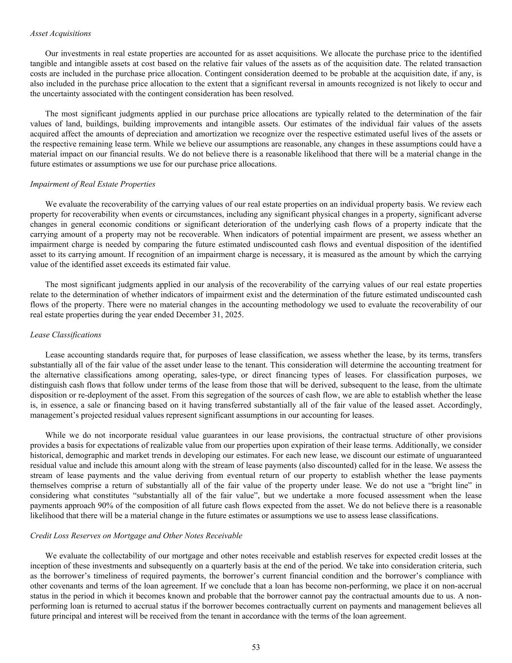future principal and interest will be received from the tenant in accordance with the terms of the loan agreement. Asset Acquisitions Our investments in real estate properties are accounted for as asset acquisitions. We allocate the purchase price to the identified tangible and intangible assets at cost based on the relative fair values of the assets as of the acquisition date. The related transaction costs are included in the purchase price allocation. Contingent consideration deemed to be probable at the acquisition date, if any, is also included in the purchase price allocation to the extent that a significant reversal in amounts recognized is not likely to occur and the uncertainty associated with the contingent consideration has been resolved. The most significant judgments applied in our purchase price allocations are typically related to the determination of the fair values of land, buildings, building improvements and intangible assets. Our estimates of the individual fair values of the assets acquired affect the amounts of depreciation and amortization we recognize over the respective estimated useful lives of the assets or the respective remaining lease term. While we believe our assumptions are reasonable, any changes in these assumptions could have a material impact on our financial results. We do not believe there is a reasonable likelihood that there will be a material change in the future estimates or assumptions we use for our purchase price allocations. Impairment of Real Estate Properties We evaluate the recoverability of the carrying values of our real estate properties on an individual property basis. We review each property for recoverability when events or circumstances, including any significant physical changes in a property, significant adverse changes in general economic conditions or significant deterioration of the underlying cash flows of a property indicate that the carrying amount of a property may not be recoverable. When indicators of potential impairment are present, we assess whether an impairment charge is needed by comparing the future estimated undiscounted cash flows and eventual disposition of the identified asset to its carrying amount. If recognition of an impairment charge is necessary, it is measured as the amount by which the carrying value of the identified asset exceeds its estimated fair value. The most significant judgments applied in our analysis of the recoverability of the carrying values of our real estate properties relate to the determination of whether indicators of impairment exist and the determination of the future estimated undiscounted cash flows of the property. There were no material changes in the accounting methodology we used to evaluate the recoverability of our real estate properties during the year ended December 31, 2025. Lease Classifications Lease accounting standards require that, for purposes of lease classification, we assess whether the lease, by its terms, transfers substantially all of the fair value of the asset under lease to the tenant. This consideration will determine the accounting treatment for the alternative classifications among operating, sales-type, or direct financing types of leases. For classification purposes, we distinguish cash flows that follow under terms of the lease from those that will be derived, subsequent to the lease, from the ultimate disposition or re-deployment of the asset. From this segregation of the sources of cash flow, we are able to establish whether the lease is, in essence, a sale or financing based on it having transferred substantially all of the fair value of the leased asset. Accordingly, management’s projected residual values represent significant assumptions in our accounting for leases. While we do not incorporate residual value guarantees in our lease provisions, the contractual structure of other provisions provides a basis for expectations of realizable value from our properties upon expiration of their lease terms. Additionally, we consider historical, demographic and market trends in developing our estimates. For each new lease, we discount our estimate of unguaranteed residual value and include this amount along with the stream of lease payments (also discounted) called for in the lease. We assess the stream of lease payments and the value deriving from eventual return of our property to establish whether the lease payments themselves comprise a return of substantially all of the fair value of the property under lease. We do not use a “bright line” in considering what constitutes “substantially all of the fair value”, but we undertake a more focused assessment when the lease payments approach 90% of the composition of all future cash flows expected from the asset. We do not believe there is a reasonable likelihood that there will be a material change in the future estimates or assumptions we use to assess lease classifications. Credit Loss Reserves on Mortgage and Other Notes Receivable We evaluate the collectability of our mortgage and other notes receivable and establish reserves for expected credit losses at the inception of these investments and subsequently on a quarterly basis at the end of the period. We take into consideration criteria, such as the borrower’s timeliness of required payments, the borrower’s current financial condition and the borrower’s compliance with other covenants and terms of the loan agreement. If we conclude that a loan has become non-performing, we place it on non-accrual status in the period in which it becomes known and probable that the borrower cannot pay the contractual amounts due to us. A non- performing loan is returned to accrual status if the borrower becomes contractually current on payments and management believes all 53