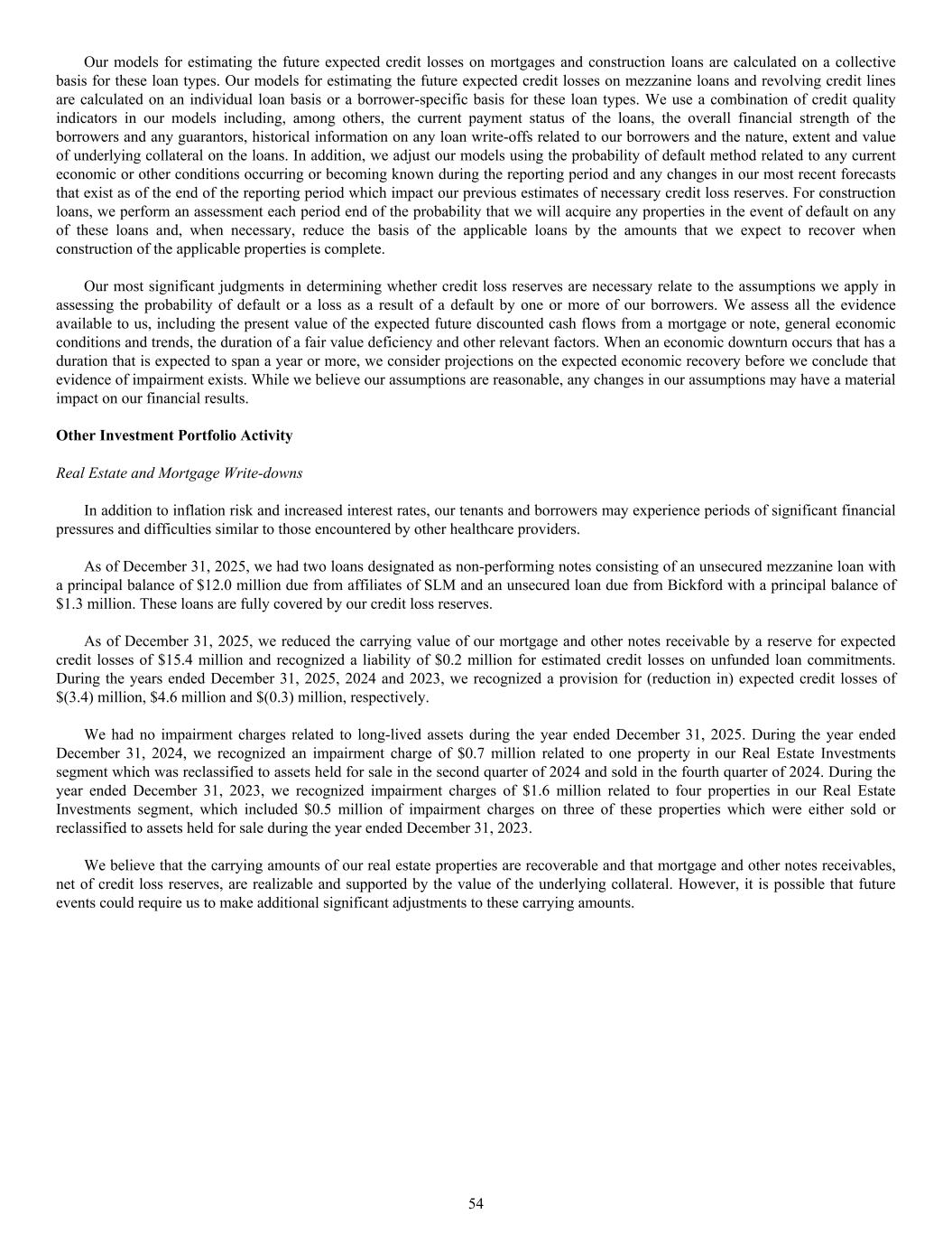 Our models for estimating the future expected credit losses on mortgages and construction loans are calculated on a collective basis for these loan types. Our models for estimating the future expected credit losses on mezzanine loans and revolving credit lines are calculated on an individual loan basis or a borrower-specific basis for these loan types. We use a combination of credit quality indicators in our models including, among others, the current payment status of the loans, the overall financial strength of the borrowers and any guarantors, historical information on any loan write-offs related to our borrowers and the nature, extent and value of underlying collateral on the loans. In addition, we adjust our models using the probability of default method related to any current economic or other conditions occurring or becoming known during the reporting period and any changes in our most recent forecasts that exist as of the end of the reporting period which impact our previous estimates of necessary credit loss reserves. For construction loans, we perform an assessment each period end of the probability that we will acquire any properties in the event of default on any of these loans and, when necessary, reduce the basis of the applicable loans by the amounts that we expect to recover when construction of the applicable properties is complete. Our most significant judgments in determining whether credit loss reserves are necessary relate to the assumptions we apply in assessing the probability of default or a loss as a result of a default by one or more of our borrowers. We assess all the evidence available to us, including the present value of the expected future discounted cash flows from a mortgage or note, general economic conditions and trends, the duration of a fair value deficiency and other relevant factors. When an economic downturn occurs that has a duration that is expected to span a year or more, we consider projections on the expected economic recovery before we conclude that evidence of impairment exists. While we believe our assumptions are reasonable, any changes in our assumptions may have a material impact on our financial results. Other Investment Portfolio Activity Real Estate and Mortgage Write-downs In addition to inflation risk and increased interest rates, our tenants and borrowers may experience periods of significant financial pressures and difficulties similar to those encountered by other healthcare providers. As of December 31, 2025, we had two loans designated as non-performing notes consisting of an unsecured mezzanine loan with a principal balance of $12.0 million due from affiliates of SLM and an unsecured loan due from Bickford with a principal balance of $1.3 million. These loans are fully covered by our credit loss reserves. As of December 31, 2025, we reduced the carrying value of our mortgage and other notes receivable by a reserve for expected credit losses of $15.4 million and recognized a liability of $0.2 million for estimated credit losses on unfunded loan commitments. During the years ended December 31, 2025, 2024 and 2023, we recognized a provision for (reduction in) expected credit losses of $(3.4) million, $4.6 million and $(0.3) million, respectively. We had no impairment charges related to long-lived assets during the year ended December 31, 2025. During the year ended December 31, 2024, we recognized an impairment charge of $0.7 million related to one property in our Real Estate Investments segment which was reclassified to assets held for sale in the second quarter of 2024 and sold in the fourth quarter of 2024. During the year ended December 31, 2023, we recognized impairment charges of $1.6 million related to four properties in our Real Estate Investments segment, which included $0.5 million of impairment charges on three of these properties which were either sold or reclassified to assets held for sale during the year ended December 31, 2023. We believe that the carrying amounts of our real estate properties are recoverable and that mortgage and other notes receivables, net of credit loss reserves, are realizable and supported by the value of the underlying collateral. However, it is possible that future events could require us to make additional significant adjustments to these carrying amounts. 54