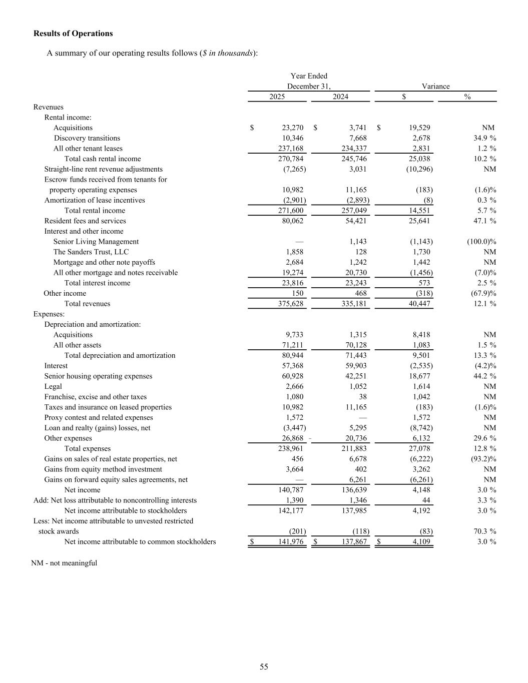 A summary of our operating results follows ($ in thousands): Year Ended December 31, Variance 2025 2024 $ % Revenues Rental income: Acquisitions $ 23,270 $ 3,741 $ 19,529 NM Discovery transitions 10,346 7,668 2,678 34.9 % All other tenant leases 237,168 234,337 2,831 1.2 % Total cash rental income 270,784 245,746 25,038 10.2 % Straight-line rent revenue adjustments (7,265) 3,031 (10,296) NM Escrow funds received from tenants for property operating expenses 10,982 11,165 (183) (1.6) % Amortization of lease incentives (2,901) (2,893) (8) 0.3 % Total rental income 271,600 257,049 14,551 5.7 % Resident fees and services 80,062 54,421 25,641 47.1 % Interest and other income Senior Living Management — 1,143 (1,143) (100.0) % The Sanders Trust, LLC 1,858 128 1,730 NM Mortgage and other note payoffs 2,684 1,242 1,442 NM All other mortgage and notes receivable 19,274 20,730 (1,456) (7.0) % Total interest income 23,816 23,243 573 2.5 % Other income 150 468 (318) (67.9) % Total revenues 375,628 335,181 40,447 12.1 % Expenses: Depreciation and amortization: Acquisitions 9,733 1,315 8,418 NM All other assets 71,211 70,128 1,083 1.5 % Total depreciation and amortization 80,944 71,443 9,501 13.3 % Interest 57,368 59,903 (2,535) (4.2) % Senior housing operating expenses 60,928 42,251 18,677 44.2 % Legal 2,666 1,052 1,614 NM Franchise, excise and other taxes 1,080 38 1,042 NM Taxes and insurance on leased properties 10,982 11,165 (183) (1.6) % Proxy contest and related expenses 1,572 — 1,572 NM Loan and realty (gains) losses, net (3,447) 5,295 (8,742) NM Other expenses 26,868 — 20,736 6,132 29.6 % Total expenses 238,961 211,883 27,078 12.8 % Gains on sales of real estate properties, net 456 6,678 (6,222) (93.2) % Gains from equity method investment 3,664 402 3,262 NM Gains on forward equity sales agreements, net — 6,261 (6,261) NM Net income 140,787 136,639 4,148 3.0 % Add: Net loss attributable to noncontrolling interests 1,390 1,346 44 3.3 % Net income attributable to stockholders 142,177 137,985 4,192 3.0 % Less: Net income attributable to unvested restricted stock awards (201) (118) (83) 70.3 % Net income attributable to common stockholders $ 141,976 $ 137,867 $ 4,109 3.0 % NM - not meaningful Results of Operations 55