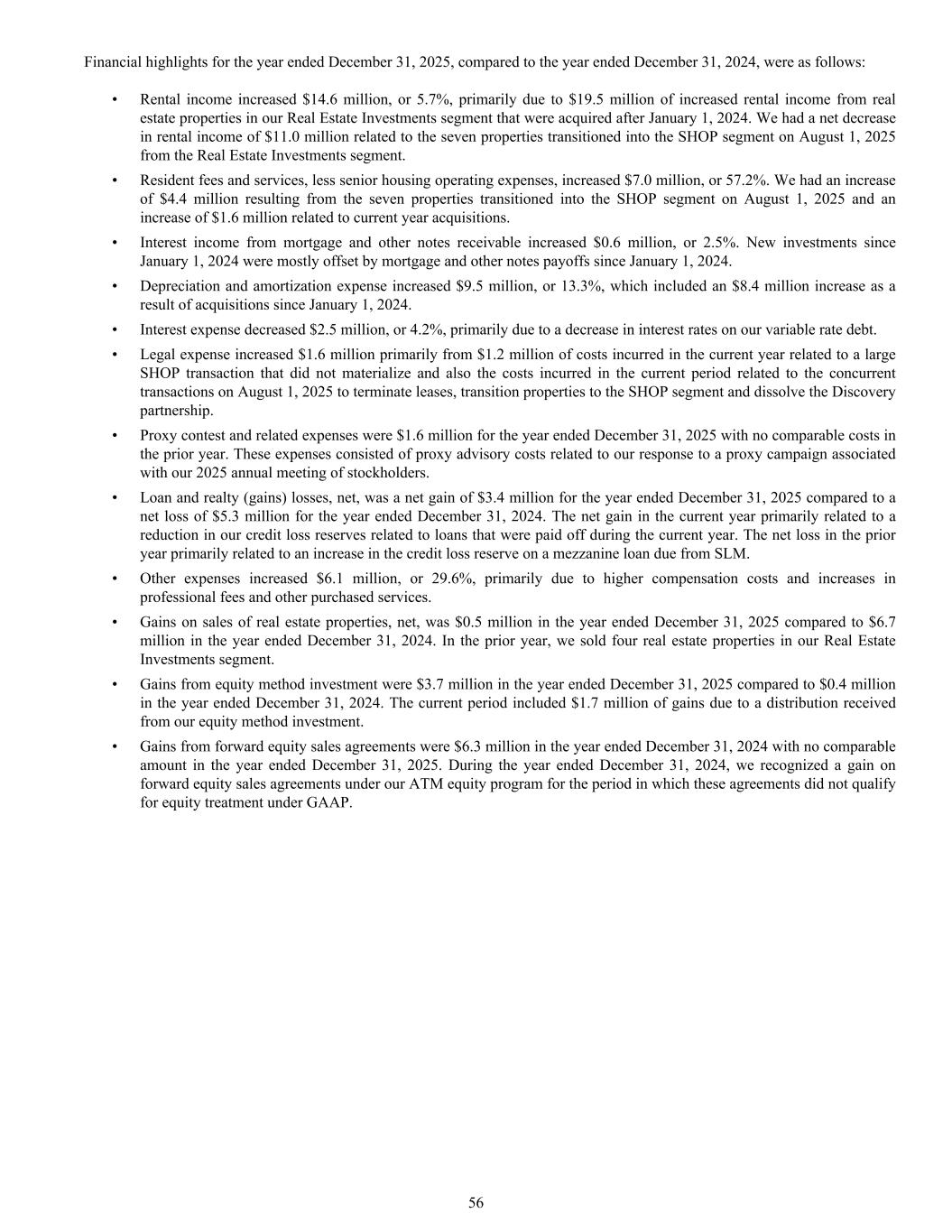 Financial highlights for the year ended December 31, 2025, compared to the year ended December 31, 2024, were as follows: • Rental income increased $14.6 million, or 5.7%, primarily due to $19.5 million of increased rental income from real estate properties in our Real Estate Investments segment that were acquired after January 1, 2024. We had a net decrease in rental income of $11.0 million related to the seven properties transitioned into the SHOP segment on August 1, 2025 from the Real Estate Investments segment. • Resident fees and services, less senior housing operating expenses, increased $7.0 million, or 57.2%. We had an increase of $4.4 million resulting from the seven properties transitioned into the SHOP segment on August 1, 2025 and an increase of $1.6 million related to current year acquisitions. • Interest income from mortgage and other notes receivable increased $0.6 million, or 2.5%. New investments since January 1, 2024 were mostly offset by mortgage and other notes payoffs since January 1, 2024. • Depreciation and amortization expense increased $9.5 million, or 13.3%, which included an $8.4 million increase as a result of acquisitions since January 1, 2024. • Interest expense decreased $2.5 million, or 4.2%, primarily due to a decrease in interest rates on our variable rate debt. • Legal expense increased $1.6 million primarily from $1.2 million of costs incurred in the current year related to a large SHOP transaction that did not materialize and also the costs incurred in the current period related to the concurrent transactions on August 1, 2025 to terminate leases, transition properties to the SHOP segment and dissolve the Discovery partnership. • Proxy contest and related expenses were $1.6 million for the year ended December 31, 2025 with no comparable costs in the prior year. These expenses consisted of proxy advisory costs related to our response to a proxy campaign associated with our 2025 annual meeting of stockholders. • Loan and realty (gains) losses, net, was a net gain of $3.4 million for the year ended December 31, 2025 compared to a net loss of $5.3 million for the year ended December 31, 2024. The net gain in the current year primarily related to a reduction in our credit loss reserves related to loans that were paid off during the current year. The net loss in the prior year primarily related to an increase in the credit loss reserve on a mezzanine loan due from SLM. • Other expenses increased $6.1 million, or 29.6%, primarily due to higher compensation costs and increases in professional fees and other purchased services. • Gains on sales of real estate properties, net, was $0.5 million in the year ended December 31, 2025 compared to $6.7 million in the year ended December 31, 2024. In the prior year, we sold four real estate properties in our Real Estate Investments segment. • Gains from equity method investment were $3.7 million in the year ended December 31, 2025 compared to $0.4 million in the year ended December 31, 2024. The current period included $1.7 million of gains due to a distribution received from our equity method investment. • Gains from forward equity sales agreements were $6.3 million in the year ended December 31, 2024 with no comparable amount in the year ended December 31, 2025. During the year ended December 31, 2024, we recognized a gain on forward equity sales agreements under our ATM equity program for the period in which these agreements did not qualify for equity treatment under GAAP. 56