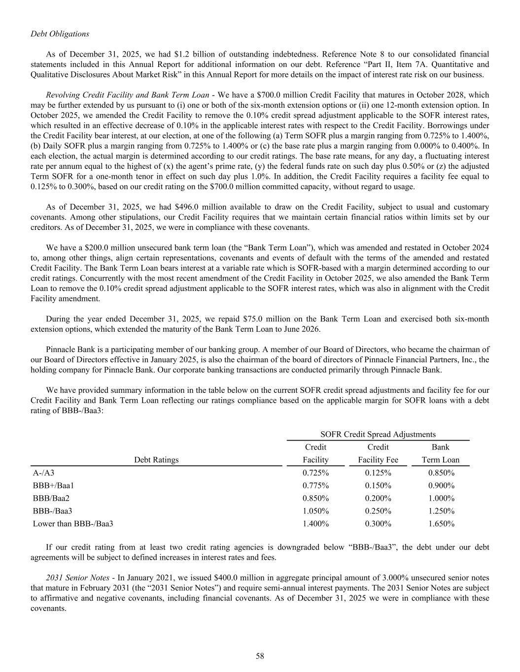 SOFR Credit Spread Adjustments Credit Credit Bank Debt Ratings Facility Facility Fee Term Loan A-/A3 0.725% 0.125% 0.850% BBB+/Baa1 0.775% 0.150% 0.900% BBB/Baa2 0.850% 0.200% 1.000% BBB-/Baa3 1.050% 0.250% 1.250% Lower than BBB-/Baa3 1.400% 0.300% 1.650% If our credit rating from at least two credit rating agencies is downgraded below “BBB-/Baa3”, the debt under our debt agreements will be subject to defined increases in interest rates and fees. 2031 Senior Notes - In January 2021, we issued $400.0 million in aggregate principal amount of 3.000% unsecured senior notes that mature in February 2031 (the “2031 Senior Notes”) and require semi-annual interest payments. The 2031 Senior Notes are subject to affirmative and negative covenants, including financial covenants. As of December 31, 2025 we were in compliance with these covenants. Debt Obligations As of December 31, 2025, we had $1.2 billion of outstanding indebtedness. Reference Note 8 to our consolidated financial statements included in this Annual Report for additional information on our debt. Reference “Part II, Item 7A. Quantitative and Qualitative Disclosures About Market Risk” in this Annual Report for more details on the impact of interest rate risk on our business. Revolving Credit Facility and Bank Term Loan - We have a $700.0 million Credit Facility that matures in October 2028, which may be further extended by us pursuant to (i) one or both of the six-month extension options or (ii) one 12-month extension option. In October 2025, we amended the Credit Facility to remove the 0.10% credit spread adjustment applicable to the SOFR interest rates, which resulted in an effective decrease of 0.10% in the applicable interest rates with respect to the Credit Facility. Borrowings under the Credit Facility bear interest, at our election, at one of the following (a) Term SOFR plus a margin ranging from 0.725% to 1.400%, (b) Daily SOFR plus a margin ranging from 0.725% to 1.400% or (c) the base rate plus a margin ranging from 0.000% to 0.400%. In each election, the actual margin is determined according to our credit ratings. The base rate means, for any day, a fluctuating interest rate per annum equal to the highest of (x) the agent’s prime rate, (y) the federal funds rate on such day plus 0.50% or (z) the adjusted Term SOFR for a one-month tenor in effect on such day plus 1.0%. In addition, the Credit Facility requires a facility fee equal to 0.125% to 0.300%, based on our credit rating on the $700.0 million committed capacity, without regard to usage. As of December 31, 2025, we had $496.0 million available to draw on the Credit Facility, subject to usual and customary covenants. Among other stipulations, our Credit Facility requires that we maintain certain financial ratios within limits set by our creditors. As of December 31, 2025, we were in compliance with these covenants. We have a $200.0 million unsecured bank term loan (the “Bank Term Loan”), which was amended and restated in October 2024 to, among other things, align certain representations, covenants and events of default with the terms of the amended and restated Credit Facility. The Bank Term Loan bears interest at a variable rate which is SOFR-based with a margin determined according to our credit ratings. Concurrently with the most recent amendment of the Credit Facility in October 2025, we also amended the Bank Term Loan to remove the 0.10% credit spread adjustment applicable to the SOFR interest rates, which was also in alignment with the Credit Facility amendment. During the year ended December 31, 2025, we repaid $75.0 million on the Bank Term Loan and exercised both six-month extension options, which extended the maturity of the Bank Term Loan to June 2026. Pinnacle Bank is a participating member of our banking group. A member of our Board of Directors, who became the chairman of our Board of Directors effective in January 2025, is also the chairman of the board of directors of Pinnacle Financial Partners, Inc., the holding company for Pinnacle Bank. Our corporate banking transactions are conducted primarily through Pinnacle Bank. We have provided summary information in the table below on the current SOFR credit spread adjustments and facility fee for our Credit Facility and Bank Term Loan reflecting our ratings compliance based on the applicable margin for SOFR loans with a debt rating of BBB-/Baa3: 58