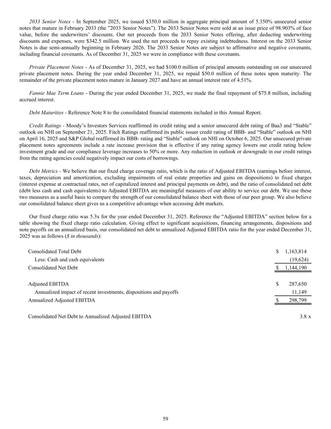 Consolidated Total Debt $ 1,163,814 Less: Cash and cash equivalents (19,624) Consolidated Net Debt $ 1,144,190 Adjusted EBITDA $ 287,650 Annualized impact of recent investments, dispositions and payoffs 11,149 Annualized Adjusted EBITDA $ 298,799 Consolidated Net Debt to Annualized Adjusted EBITDA 3.8 x 2033 Senior Notes - In September 2025, we issued $350.0 million in aggregate principal amount of 5.350% unsecured senior notes that mature in February 2033 (the ”2033 Senior Notes”). The 2033 Senior Notes were sold at an issue price of 98.903% of face value, before the underwriters’ discounts. Our net proceeds from the 2033 Senior Notes offering, after deducting underwriting discounts and expenses, were $342.5 million. We used the net proceeds to repay existing indebtedness. Interest on the 2033 Senior Notes is due semi-annually beginning in February 2026. The 2033 Senior Notes are subject to affirmative and negative covenants, including financial covenants. As of December 31, 2025 we were in compliance with these covenants. Private Placement Notes - As of December 31, 2025, we had $100.0 million of principal amounts outstanding on our unsecured private placement notes. During the year ended December 31, 2025, we repaid $50.0 million of these notes upon maturity. The remainder of the private placement notes mature in January 2027 and have an annual interest rate of 4.51%. Fannie Mae Term Loans - During the year ended December 31, 2025, we made the final repayment of $75.8 million, including accrued interest. Debt Maturities - Reference Note 8 to the consolidated financial statements included in this Annual Report. Credit Ratings - Moody’s Investors Services reaffirmed its credit rating and a senior unsecured debt rating of Baa3 and “Stable” outlook on NHI on September 21, 2025. Fitch Ratings reaffirmed its public issuer credit rating of BBB- and “Stable” outlook on NHI on April 16, 2025 and S&P Global reaffirmed its BBB- rating and “Stable” outlook on NHI on October 6, 2025. Our unsecured private placement notes agreements include a rate increase provision that is effective if any rating agency lowers our credit rating below investment grade and our compliance leverage increases to 50% or more. Any reduction in outlook or downgrade in our credit ratings from the rating agencies could negatively impact our costs of borrowings. Debt Metrics - We believe that our fixed charge coverage ratio, which is the ratio of Adjusted EBITDA (earnings before interest, taxes, depreciation and amortization, excluding impairments of real estate properties and gains on dispositions) to fixed charges (interest expense at contractual rates, net of capitalized interest and principal payments on debt), and the ratio of consolidated net debt (debt less cash and cash equivalents) to Adjusted EBITDA are meaningful measures of our ability to service our debt. We use these two measures as a useful basis to compare the strength of our consolidated balance sheet with those of our peer group. We also believe our consolidated balance sheet gives us a competitive advantage when accessing debt markets. Our fixed charge ratio was 5.3x for the year ended December 31, 2025. Reference the “Adjusted EBITDA” section below for a table showing the fixed charge ratio calculation. Giving effect to significant acquisitions, financing arrangements, dispositions and note payoffs on an annualized basis, our consolidated net debt to annualized Adjusted EBITDA ratio for the year ended December 31, 2025 was as follows ($ in thousands): 59