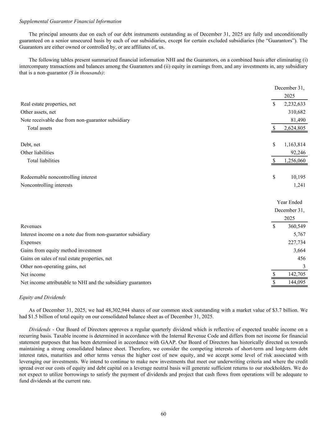 December 31, 2025 Real estate properties, net $ 2,232,633 Other assets, net 310,682 Note receivable due from non-guarantor subsidiary 81,490 Total assets $ 2,624,805 Debt, net $ 1,163,814 Other liabilities 92,246 Total liabilities $ 1,256,060 Redeemable noncontrolling interest $ 10,195 Noncontrolling interests 1,241 Year Ended December 31, 2025 Revenues $ 360,549 Interest income on a note due from non-guarantor subsidiary 5,767 Expenses 227,734 Gains from equity method investment 3,664 Gains on sales of real estate properties, net 456 Other non-operating gains, net 3 Net income $ 142,705 Net income attributable to NHI and the subsidiary guarantors $ 144,095 Equity and Dividends As of December 31, 2025, we had 48,302,944 shares of our common stock outstanding with a market value of $3.7 billion. We had $1.5 billion of total equity on our consolidated balance sheet as of December 31, 2025. Dividends - Our Board of Directors approves a regular quarterly dividend which is reflective of expected taxable income on a recurring basis. Taxable income is determined in accordance with the Internal Revenue Code and differs from net income for financial statement purposes that has been determined in accordance with GAAP. Our Board of Directors has historically directed us towards maintaining a strong consolidated balance sheet. Therefore, we consider the competing interests of short-term and long-term debt interest rates, maturities and other terms versus the higher cost of new equity, and we accept some level of risk associated with leveraging our investments. We intend to continue to make new investments that meet our underwriting criteria and where the credit spread over our costs of equity and debt capital on a leverage neutral basis will generate sufficient returns to our stockholders. We do not expect to utilize borrowings to satisfy the payment of dividends and project that cash flows from operations will be adequate to fund dividends at the current rate. Supplemental Guarantor Financial Information The principal amounts due on each of our debt instruments outstanding as of December 31, 2025 are fully and unconditionally guaranteed on a senior unsecured basis by each of our subsidiaries, except for certain excluded subsidiaries (the “Guarantors”). The Guarantors are either owned or controlled by, or are affiliates of, us. The following tables present summarized financial information NHI and the Guarantors, on a combined basis after eliminating (i) intercompany transactions and balances among the Guarantors and (ii) equity in earnings from, and any investments in, any subsidiary that is a non-guarantor ($ in thousands): 60