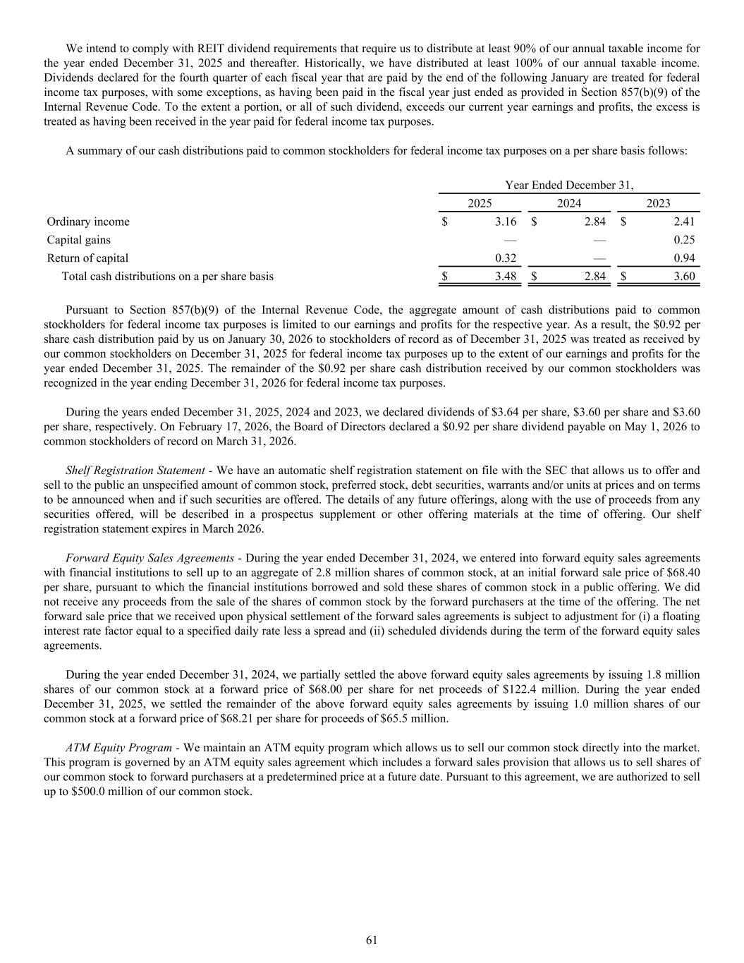 Year Ended December 31, 2025 2024 2023 Ordinary income $ 3.16 $ 2.84 $ 2.41 Capital gains — — 0.25 Return of capital 0.32 — 0.94 Total cash distributions on a per share basis $ 3.48 $ 2.84 $ 3.60 Pursuant to Section 857(b)(9) of the Internal Revenue Code, the aggregate amount of cash distributions paid to common stockholders for federal income tax purposes is limited to our earnings and profits for the respective year. As a result, the $0.92 per share cash distribution paid by us on January 30, 2026 to stockholders of record as of December 31, 2025 was treated as received by our common stockholders on December 31, 2025 for federal income tax purposes up to the extent of our earnings and profits for the year ended December 31, 2025. The remainder of the $0.92 per share cash distribution received by our common stockholders was recognized in the year ending December 31, 2026 for federal income tax purposes. During the years ended December 31, 2025, 2024 and 2023, we declared dividends of $3.64 per share, $3.60 per share and $3.60 per share, respectively. On February 17, 2026, the Board of Directors declared a $0.92 per share dividend payable on May 1, 2026 to common stockholders of record on March 31, 2026. Shelf Registration Statement - We have an automatic shelf registration statement on file with the SEC that allows us to offer and sell to the public an unspecified amount of common stock, preferred stock, debt securities, warrants and/or units at prices and on terms to be announced when and if such securities are offered. The details of any future offerings, along with the use of proceeds from any securities offered, will be described in a prospectus supplement or other offering materials at the time of offering. Our shelf registration statement expires in March 2026. Forward Equity Sales Agreements - During the year ended December 31, 2024, we entered into forward equity sales agreements with financial institutions to sell up to an aggregate of 2.8 million shares of common stock, at an initial forward sale price of $68.40 per share, pursuant to which the financial institutions borrowed and sold these shares of common stock in a public offering. We did not receive any proceeds from the sale of the shares of common stock by the forward purchasers at the time of the offering. The net forward sale price that we received upon physical settlement of the forward sales agreements is subject to adjustment for (i) a floating interest rate factor equal to a specified daily rate less a spread and (ii) scheduled dividends during the term of the forward equity sales agreements. During the year ended December 31, 2024, we partially settled the above forward equity sales agreements by issuing 1.8 million shares of our common stock at a forward price of $68.00 per share for net proceeds of $122.4 million. During the year ended December 31, 2025, we settled the remainder of the above forward equity sales agreements by issuing 1.0 million shares of our common stock at a forward price of $68.21 per share for proceeds of $65.5 million. ATM Equity Program - We maintain an ATM equity program which allows us to sell our common stock directly into the market. This program is governed by an ATM equity sales agreement which includes a forward sales provision that allows us to sell shares of our common stock to forward purchasers at a predetermined price at a future date. Pursuant to this agreement, we are authorized to sell up to $500.0 million of our common stock. We intend to comply with REIT dividend requirements that require us to distribute at least 90% of our annual taxable income for the year ended December 31, 2025 and thereafter. Historically, we have distributed at least 100% of our annual taxable income. Dividends declared for the fourth quarter of each fiscal year that are paid by the end of the following January are treated for federal income tax purposes, with some exceptions, as having been paid in the fiscal year just ended as provided in Section 857(b)(9) of the Internal Revenue Code. To the extent a portion, or all of such dividend, exceeds our current year earnings and profits, the excess is treated as having been received in the year paid for federal income tax purposes. A summary of our cash distributions paid to common stockholders for federal income tax purposes on a per share basis follows: 61
