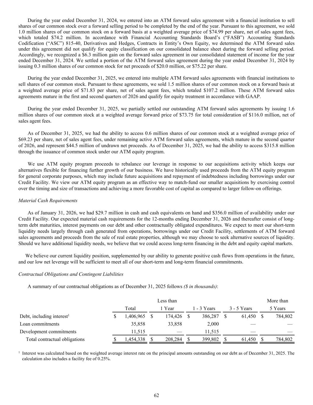 A summary of our contractual obligations as of December 31, 2025 follows ($ in thousands): Less than More than Total 1 Year 1 - 3 Years 3 - 5 Years 5 Years Debt, including interest1 $ 1,406,965 $ 174,426 $ 386,287 $ 61,450 $ 784,802 Loan commitments 35,858 33,858 2,000 — — Development commitments 11,515 — 11,515 — — Total contractual obligations $ 1,454,338 $ 208,284 $ 399,802 $ 61,450 $ 784,802 1 Interest was calculated based on the weighted average interest rate on the principal amounts outstanding on our debt as of December 31, 2025. The calculation also includes a facility fee of 0.25%. During the year ended December 31, 2024, we entered into an ATM forward sales agreement with a financial institution to sell shares of our common stock over a forward selling period to be completed by the end of the year. Pursuant to this agreement, we sold 1.0 million shares of our common stock on a forward basis at a weighted average price of $74.99 per share, net of sales agent fees, which totaled $74.2 million. In accordance with Financial Accounting Standards Board’s (“FASB”) Accounting Standards Codification (“ASC”) 815-40, Derivatives and Hedges, Contracts in Entity’s Own Equity, we determined the ATM forward sales under this agreement did not qualify for equity classification on our consolidated balance sheet during the forward selling period. Accordingly, we recognized a $6.3 million gain on the forward sales agreement in our consolidated statement of income for the year ended December 31, 2024. We settled a portion of the ATM forward sales agreement during the year ended December 31, 2024 by issuing 0.3 million shares of our common stock for net proceeds of $20.0 million, or $75.22 per share. During the year ended December 31, 2025, we entered into multiple ATM forward sales agreements with financial institutions to sell shares of our common stock. Pursuant to these agreements, we sold 1.5 million shares of our common stock on a forward basis at a weighted average price of $71.83 per share, net of sales agent fees, which totaled $107.2 million. These ATM forward sales agreements mature in the first and second quarters of 2026 and qualify for equity treatment in accordance with GAAP. During the year ended December 31, 2025, we partially settled our outstanding ATM forward sales agreements by issuing 1.6 million shares of our common stock at a weighted average forward price of $73.75 for total consideration of $116.0 million, net of sales agent fees. As of December 31, 2025, we had the ability to access 0.6 million shares of our common stock at a weighted average price of $69.23 per share, net of sales agent fees, under remaining active ATM forward sales agreements, which mature in the second quarter of 2026, and represent $44.5 million of undrawn net proceeds. As of December 31, 2025, we had the ability to access $315.8 million through the issuance of common stock under our ATM equity program. We use ATM equity program proceeds to rebalance our leverage in response to our acquisitions activity which keeps our alternatives flexible for financing further growth of our business. We have historically used proceeds from the ATM equity program for general corporate purposes, which may include future acquisitions and repayment of indebtedness including borrowings under our Credit Facility. We view our ATM equity program as an effective way to match-fund our smaller acquisitions by exercising control over the timing and size of transactions and achieving a more favorable cost of capital as compared to larger follow-on offerings. Material Cash Requirements As of January 31, 2026, we had $29.7 million in cash and cash equivalents on hand and $356.0 million of availability under our Credit Facility. Our expected material cash requirements for the 12-months ending December 31, 2026 and thereafter consist of long- term debt maturities, interest payments on our debt and other contractually obligated expenditures. We expect to meet our short-term liquidity needs largely through cash generated from operations, borrowings under our Credit Facility, settlements of ATM forward sales agreements and proceeds from the sale of real estate properties, although we may choose to seek alternative sources of liquidity. Should we have additional liquidity needs, we believe that we could access long-term financing in the debt and equity capital markets. We believe our current liquidity position, supplemented by our ability to generate positive cash flows from operations in the future, and our low net leverage will be sufficient to meet all of our short-term and long-term financial commitments. Contractual Obligations and Contingent Liabilities 62