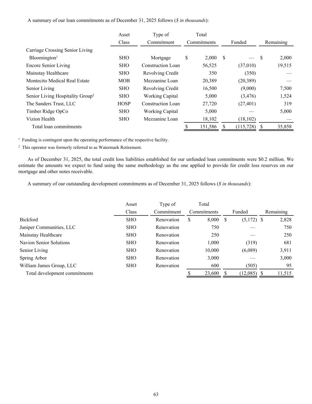 A summary of our loan commitments as of December 31, 2025 follows ($ in thousands): Asset Type of Total Class Commitment Commitments Funded Remaining Carriage Crossing Senior Living Bloomington1 SHO Mortgage $ 2,000 $ — $ 2,000 Encore Senior Living SHO Construction Loan 56,525 (37,010) 19,515 Mainstay Healthcare SHO Revolving Credit 350 (350) — Montecito Medical Real Estate MOB Mezzanine Loan 20,389 (20,389) — Senior Living SHO Revolving Credit 16,500 (9,000) 7,500 Senior Living Hospitality Group2 SHO Working Capital 5,000 (3,476) 1,524 The Sanders Trust, LLC HOSP Construction Loan 27,720 (27,401) 319 Timber Ridge OpCo SHO Working Capital 5,000 — 5,000 Vizion Health SHO Mezzanine Loan 18,102 (18,102) — Total loan commitments $ 151,586 $ (115,728) $ 35,858 1 Funding is contingent upon the operating performance of the respective facility. 2 This operator was formerly referred to as Watermark Retirement. As of December 31, 2025, the total credit loss liabilities established for our unfunded loan commitments were $0.2 million. We estimate the amounts we expect to fund using the same methodology as the one applied to provide for credit loss reserves on our mortgage and other notes receivable. A summary of our outstanding development commitments as of December 31, 2025 follows ($ in thousands): Asset Type of Total Class Commitment Commitments Funded Remaining Bickford SHO Renovation $ 8,000 $ (5,172) $ 2,828 Juniper Communities, LLC SHO Renovation 750 — 750 Mainstay Healthcare SHO Renovation 250 — 250 Navion Senior Solutions SHO Renovation 1,000 (319) 681 Senior Living SHO Renovation 10,000 (6,089) 3,911 Spring Arbor SHO Renovation 3,000 — 3,000 William James Group, LLC SHO Renovation 600 (505) 95 Total development commitments $ 23,600 $ (12,085) $ 11,515 63