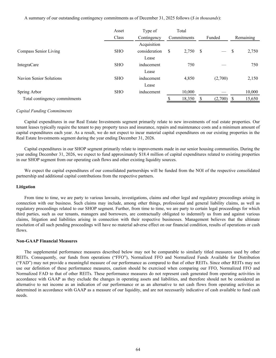 A summary of our outstanding contingency commitments as of December 31, 2025 follows ($ in thousands): Asset Type of Total Class Contingency Commitments Funded Remaining Acquisition Compass Senior Living SHO consideration $ 2,750 $ — $ 2,750 Lease IntegraCare SHO inducement 750 — 750 Lease Navion Senior Solutions SHO inducement 4,850 (2,700) 2,150 Lease Spring Arbor SHO inducement 10,000 — 10,000 Total contingency commitments $ 18,350 $ (2,700) $ 15,650 Capital Funding Commitments Capital expenditures in our Real Estate Investments segment primarily relate to new investments of real estate properties. Our tenant leases typically require the tenant to pay property taxes and insurance, repairs and maintenance costs and a minimum amount of capital expenditures each year. As a result, we do not expect to incur material capital expenditures on our existing properties in the Real Estate Investments segment during the year ending December 31, 2026. Capital expenditures in our SHOP segment primarily relate to improvements made in our senior housing communities. During the year ending December 31, 2026, we expect to fund approximately $18.4 million of capital expenditures related to existing properties in our SHOP segment from our operating cash flows and other existing liquidity sources. We expect the capital expenditures of our consolidated partnerships will be funded from the NOI of the respective consolidated partnership and additional capital contributions from the respective partners. Litigation From time to time, we are party to various lawsuits, investigations, claims and other legal and regulatory proceedings arising in connection with our business. Such claims may include, among other things, professional and general liability claims, as well as regulatory proceedings related to our SHOP segment. Further, from time to time, we are party to certain legal proceedings for which third parties, such as our tenants, managers and borrowers, are contractually obligated to indemnify us from and against various claims, litigation and liabilities arising in connection with their respective businesses. Management believes that the ultimate resolution of all such pending proceedings will have no material adverse effect on our financial condition, results of operations or cash flows. Non-GAAP Financial Measures The supplemental performance measures described below may not be comparable to similarly titled measures used by other REITs. Consequently, our funds from operations (“FFO”), Normalized FFO and Normalized Funds Available for Distribution (“FAD”) may not provide a meaningful measure of our performance as compared to that of other REITs. Since other REITs may not use our definition of these performance measures, caution should be exercised when comparing our FFO, Normalized FFO and Normalized FAD to that of other REITs. These performance measures do not represent cash generated from operating activities in accordance with GAAP as they exclude the changes in operating assets and liabilities, and therefore should not be considered an alternative to net income as an indication of our performance or as an alternative to net cash flows from operating activities as determined in accordance with GAAP as a measure of our liquidity, and are not necessarily indicative of cash available to fund cash needs. 64