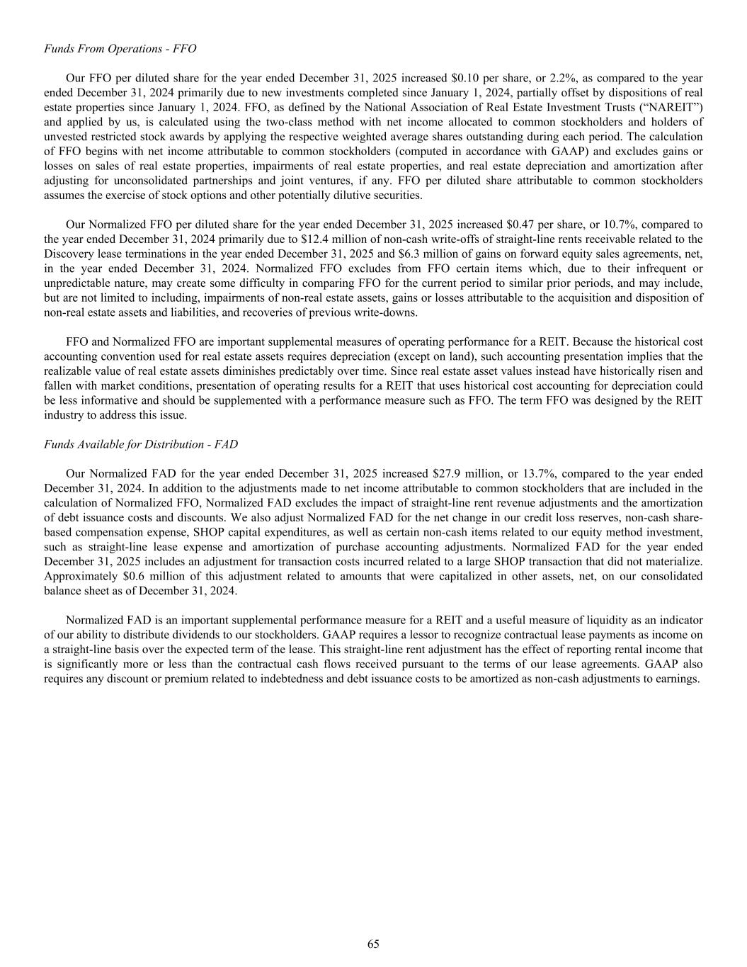 Funds From Operations - FFO Our FFO per diluted share for the year ended December 31, 2025 increased $0.10 per share, or 2.2%, as compared to the year ended December 31, 2024 primarily due to new investments completed since January 1, 2024, partially offset by dispositions of real estate properties since January 1, 2024. FFO, as defined by the National Association of Real Estate Investment Trusts (“NAREIT”) and applied by us, is calculated using the two-class method with net income allocated to common stockholders and holders of unvested restricted stock awards by applying the respective weighted average shares outstanding during each period. The calculation of FFO begins with net income attributable to common stockholders (computed in accordance with GAAP) and excludes gains or losses on sales of real estate properties, impairments of real estate properties, and real estate depreciation and amortization after adjusting for unconsolidated partnerships and joint ventures, if any. FFO per diluted share attributable to common stockholders assumes the exercise of stock options and other potentially dilutive securities. Our Normalized FFO per diluted share for the year ended December 31, 2025 increased $0.47 per share, or 10.7%, compared to the year ended December 31, 2024 primarily due to $12.4 million of non-cash write-offs of straight-line rents receivable related to the Discovery lease terminations in the year ended December 31, 2025 and $6.3 million of gains on forward equity sales agreements, net, in the year ended December 31, 2024. Normalized FFO excludes from FFO certain items which, due to their infrequent or unpredictable nature, may create some difficulty in comparing FFO for the current period to similar prior periods, and may include, but are not limited to including, impairments of non-real estate assets, gains or losses attributable to the acquisition and disposition of non-real estate assets and liabilities, and recoveries of previous write-downs. FFO and Normalized FFO are important supplemental measures of operating performance for a REIT. Because the historical cost accounting convention used for real estate assets requires depreciation (except on land), such accounting presentation implies that the realizable value of real estate assets diminishes predictably over time. Since real estate asset values instead have historically risen and fallen with market conditions, presentation of operating results for a REIT that uses historical cost accounting for depreciation could be less informative and should be supplemented with a performance measure such as FFO. The term FFO was designed by the REIT industry to address this issue. Funds Available for Distribution - FAD Our Normalized FAD for the year ended December 31, 2025 increased $27.9 million, or 13.7%, compared to the year ended December 31, 2024. In addition to the adjustments made to net income attributable to common stockholders that are included in the calculation of Normalized FFO, Normalized FAD excludes the impact of straight-line rent revenue adjustments and the amortization of debt issuance costs and discounts. We also adjust Normalized FAD for the net change in our credit loss reserves, non-cash share- based compensation expense, SHOP capital expenditures, as well as certain non-cash items related to our equity method investment, such as straight-line lease expense and amortization of purchase accounting adjustments. Normalized FAD for the year ended December 31, 2025 includes an adjustment for transaction costs incurred related to a large SHOP transaction that did not materialize. Approximately $0.6 million of this adjustment related to amounts that were capitalized in other assets, net, on our consolidated balance sheet as of December 31, 2024. Normalized FAD is an important supplemental performance measure for a REIT and a useful measure of liquidity as an indicator of our ability to distribute dividends to our stockholders. GAAP requires a lessor to recognize contractual lease payments as income on a straight-line basis over the expected term of the lease. This straight-line rent adjustment has the effect of reporting rental income that is significantly more or less than the contractual cash flows received pursuant to the terms of our lease agreements. GAAP also requires any discount or premium related to indebtedness and debt issuance costs to be amortized as non-cash adjustments to earnings. 65