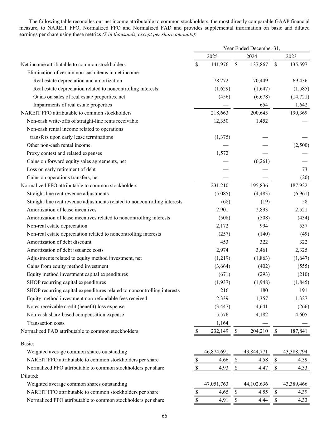 Year Ended December 31, 2025 2024 2023 Net income attributable to common stockholders $ 141,976 $ 137,867 $ 135,597 Elimination of certain non-cash items in net income: Real estate depreciation and amortization 78,772 70,449 69,436 Real estate depreciation related to noncontrolling interests (1,629) (1,647) (1,585) Gains on sales of real estate properties, net (456) (6,678) (14,721) Impairments of real estate properties — 654 1,642 NAREIT FFO attributable to common stockholders 218,663 200,645 190,369 Non-cash write-offs of straight-line rents receivable 12,350 1,452 — Non-cash rental income related to operations transfers upon early lease terminations (1,375) — — Other non-cash rental income — — (2,500) Proxy contest and related expenses 1,572 — — Gains on forward equity sales agreements, net — (6,261) — Loss on early retirement of debt — — 73 Gains on operations transfers, net — — (20) Normalized FFO attributable to common stockholders 231,210 195,836 187,922 Straight-line rent revenue adjustments (5,085) (4,483) (6,961) Straight-line rent revenue adjustments related to noncontrolling interests (68) (19) 58 Amortization of lease incentives 2,901 2,893 2,521 Amortization of lease incentives related to noncontrolling interests (508) (508) (434) Non-real estate depreciation 2,172 994 537 Non-real estate depreciation related to noncontrolling interests (257) (140) (49) Amortization of debt discount 453 322 322 Amortization of debt issuance costs 2,974 3,461 2,325 Adjustments related to equity method investment, net (1,219) (1,863) (1,647) Gains from equity method investment (3,664) (402) (555) Equity method investment capital expenditures (671) (293) (210) SHOP recurring capital expenditures (1,937) (1,948) (1,845) SHOP recurring capital expenditures related to noncontrolling interests 216 180 191 Equity method investment non-refundable fees received 2,339 1,357 1,327 Notes receivable credit (benefit) loss expense (3,447) 4,641 (266) Non-cash share-based compensation expense 5,576 4,182 4,605 Transaction costs 1,164 — — Normalized FAD attributable to common stockholders $ 232,149 $ 204,210 $ 187,841 Basic: Weighted average common shares outstanding 46,874,691 43,844,771 43,388,794 NAREIT FFO attributable to common stockholders per share $ 4.66 $ 4.58 $ 4.39 Normalized FFO attributable to common stockholders per share $ 4.93 $ 4.47 $ 4.33 Diluted: Weighted average common shares outstanding 47,051,763 44,102,636 43,389,466 NAREIT FFO attributable to common stockholders per share $ 4.65 $ 4.55 $ 4.39 Normalized FFO attributable to common stockholders per share $ 4.91 $ 4.44 $ 4.33 The following table reconciles our net income attributable to common stockholders, the most directly comparable GAAP financial measure, to NAREIT FFO, Normalized FFO and Normalized FAD and provides supplemental information on basic and diluted earnings per share using these metrics ($ in thousands, except per share amounts): 66