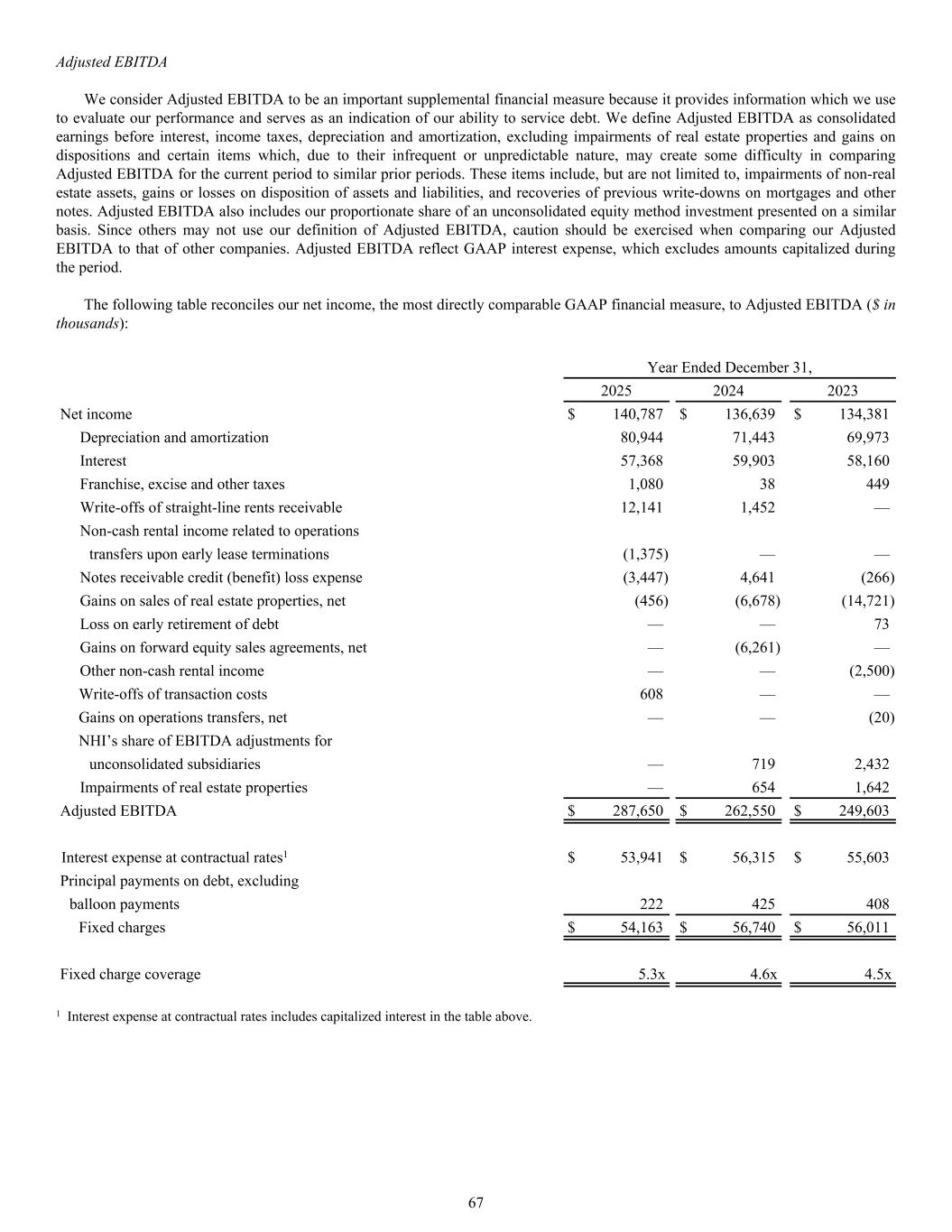 Year Ended December 31, 2025 2024 2023 Net income $ 140,787 $ 136,639 $ 134,381 Depreciation and amortization 80,944 71,443 69,973 Interest 57,368 59,903 58,160 Franchise, excise and other taxes 1,080 38 449 Write-offs of straight-line rents receivable 12,141 1,452 — Non-cash rental income related to operations transfers upon early lease terminations (1,375) — — Notes receivable credit (benefit) loss expense (3,447) 4,641 (266) Gains on sales of real estate properties, net (456) (6,678) (14,721) Loss on early retirement of debt — — 73 Gains on forward equity sales agreements, net — (6,261) — Other non-cash rental income — — (2,500) Write-offs of transaction costs 608 — — Gains on operations transfers, net — — (20) NHI’s share of EBITDA adjustments for unconsolidated subsidiaries — 719 2,432 Impairments of real estate properties — 654 1,642 Adjusted EBITDA $ 287,650 $ 262,550 $ 249,603 Interest expense at contractual rates1 $ 53,941 $ 56,315 $ 55,603 Principal payments on debt, excluding balloon payments 222 425 408 Fixed charges $ 54,163 $ 56,740 $ 56,011 Fixed charge coverage 5.3x 4.6x 4.5x 1 Interest expense at contractual rates includes capitalized interest in the table above. Adjusted EBITDA We consider Adjusted EBITDA to be an important supplemental financial measure because it provides information which we use to evaluate our performance and serves as an indication of our ability to service debt. We define Adjusted EBITDA as consolidated earnings before interest, income taxes, depreciation and amortization, excluding impairments of real estate properties and gains on dispositions and certain items which, due to their infrequent or unpredictable nature, may create some difficulty in comparing Adjusted EBITDA for the current period to similar prior periods. These items include, but are not limited to, impairments of non-real estate assets, gains or losses on disposition of assets and liabilities, and recoveries of previous write-downs on mortgages and other notes. Adjusted EBITDA also includes our proportionate share of an unconsolidated equity method investment presented on a similar basis. Since others may not use our definition of Adjusted EBITDA, caution should be exercised when comparing our Adjusted EBITDA to that of other companies. Adjusted EBITDA reflect GAAP interest expense, which excludes amounts capitalized during the period. The following table reconciles our net income, the most directly comparable GAAP financial measure, to Adjusted EBITDA ($ in thousands): 67