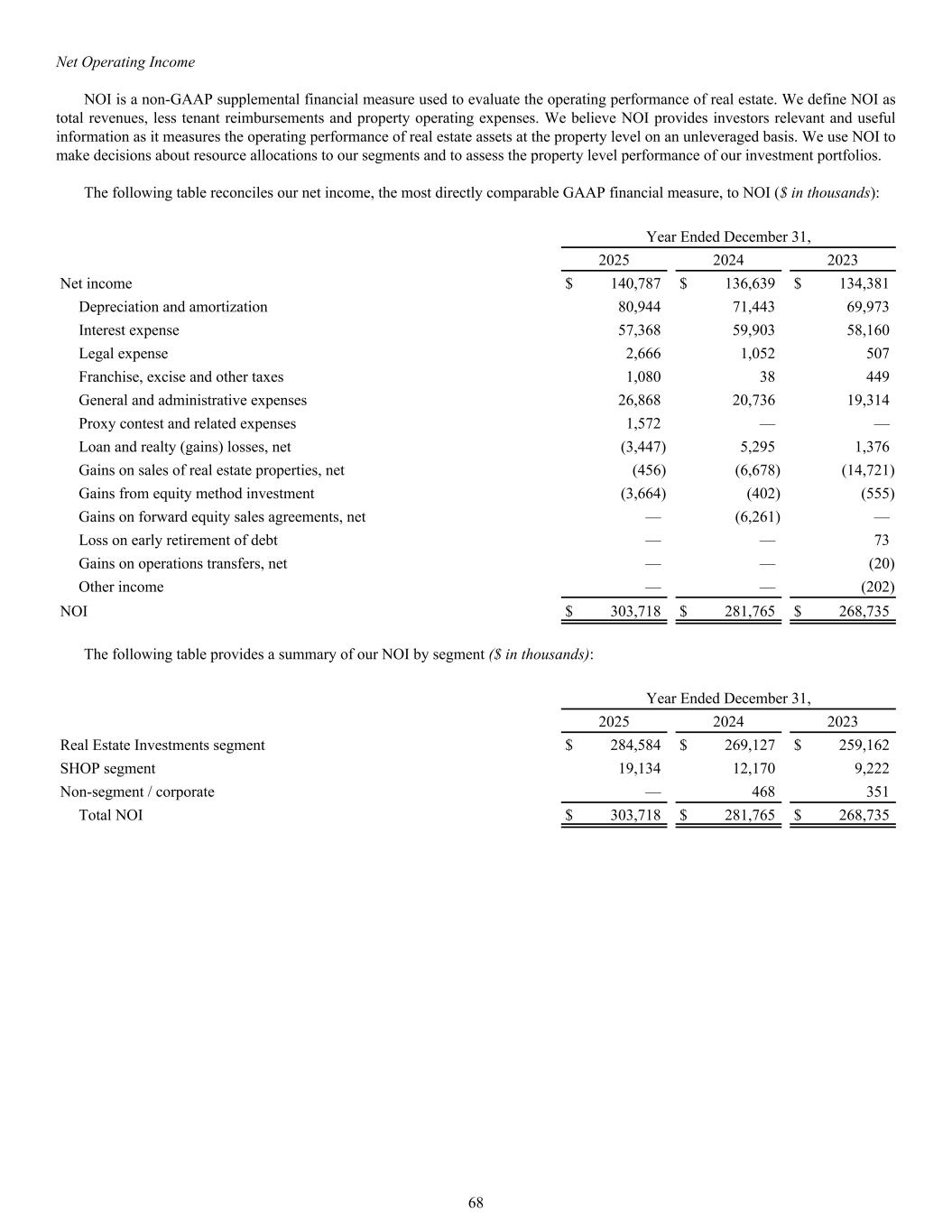 Year Ended December 31, 2025 2024 2023 Net income $ 140,787 $ 136,639 $ 134,381 Depreciation and amortization 80,944 71,443 69,973 Interest expense 57,368 59,903 58,160 Legal expense 2,666 1,052 507 Franchise, excise and other taxes 1,080 38 449 General and administrative expenses 26,868 20,736 19,314 Proxy contest and related expenses 1,572 — — Loan and realty (gains) losses, net (3,447) 5,295 1,376 Gains on sales of real estate properties, net (456) (6,678) (14,721) Gains from equity method investment (3,664) (402) (555) Gains on forward equity sales agreements, net — (6,261) — Loss on early retirement of debt — — 73 Gains on operations transfers, net — — (20) Other income — — (202) NOI $ 303,718 $ 281,765 $ 268,735 The following table provides a summary of our NOI by segment ($ in thousands): Year Ended December 31, 2025 2024 2023 Real Estate Investments segment $ 284,584 $ 269,127 $ 259,162 SHOP segment 19,134 12,170 9,222 Non-segment / corporate — 468 351 Total NOI $ 303,718 $ 281,765 $ 268,735 Net Operating Income NOI is a non-GAAP supplemental financial measure used to evaluate the operating performance of real estate. We define NOI as total revenues, less tenant reimbursements and property operating expenses. We believe NOI provides investors relevant and useful information as it measures the operating performance of real estate assets at the property level on an unleveraged basis. We use NOI to make decisions about resource allocations to our segments and to assess the property level performance of our investment portfolios. The following table reconciles our net income, the most directly comparable GAAP financial measure, to NOI ($ in thousands): 68