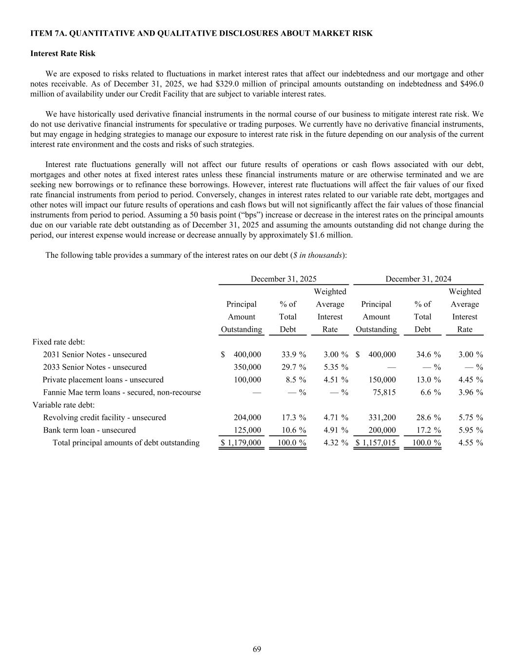 The following table provides a summary of the interest rates on our debt ($ in thousands): December 31, 2025 December 31, 2024 Weighted Weighted Principal % of Average Principal % of Average Amount Total Interest Amount Total Interest Outstanding Debt Rate Outstanding Debt Rate Fixed rate debt: 2031 Senior Notes - unsecured $ 400,000 33.9 % 3.00 % $ 400,000 34.6 % 3.00 % 2033 Senior Notes - unsecured 350,000 29.7 % 5.35 % — — % — % Private placement loans - unsecured 100,000 8.5 % 4.51 % 150,000 13.0 % 4.45 % Fannie Mae term loans - secured, non-recourse — — % — % 75,815 6.6 % 3.96 % Variable rate debt: Revolving credit facility - unsecured 204,000 17.3 % 4.71 % 331,200 28.6 % 5.75 % Bank term loan - unsecured 125,000 10.6 % 4.91 % 200,000 17.2 % 5.95 % Total principal amounts of debt outstanding $ 1,179,000 100.0 % 4.32 % $ 1,157,015 100.0 % 4.55 % ITEM 7A. QUANTITATIVE AND QUALITATIVE DISCLOSURES ABOUT MARKET RISK Interest Rate Risk We are exposed to risks related to fluctuations in market interest rates that affect our indebtedness and our mortgage and other notes receivable. As of December 31, 2025, we had $329.0 million of principal amounts outstanding on indebtedness and $496.0 million of availability under our Credit Facility that are subject to variable interest rates. We have historically used derivative financial instruments in the normal course of our business to mitigate interest rate risk. We do not use derivative financial instruments for speculative or trading purposes. We currently have no derivative financial instruments, but may engage in hedging strategies to manage our exposure to interest rate risk in the future depending on our analysis of the current interest rate environment and the costs and risks of such strategies. Interest rate fluctuations generally will not affect our future results of operations or cash flows associated with our debt, mortgages and other notes at fixed interest rates unless these financial instruments mature or are otherwise terminated and we are seeking new borrowings or to refinance these borrowings. However, interest rate fluctuations will affect the fair values of our fixed rate financial instruments from period to period. Conversely, changes in interest rates related to our variable rate debt, mortgages and other notes will impact our future results of operations and cash flows but will not significantly affect the fair values of those financial instruments from period to period. Assuming a 50 basis point (“bps”) increase or decrease in the interest rates on the principal amounts due on our variable rate debt outstanding as of December 31, 2025 and assuming the amounts outstanding did not change during the period, our interest expense would increase or decrease annually by approximately $1.6 million. 69