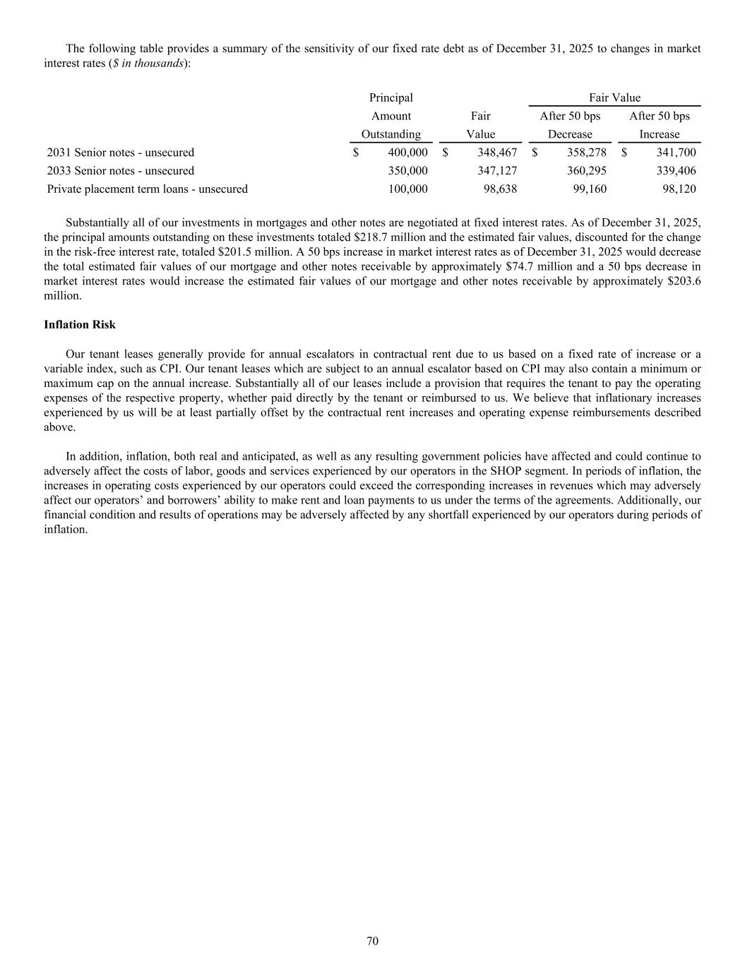 Principal Fair Value Amount Fair After 50 bps After 50 bps Outstanding Value Decrease Increase 2031 Senior notes - unsecured $ 400,000 $ 348,467 $ 358,278 $ 341,700 2033 Senior notes - unsecured 350,000 347,127 360,295 339,406 Private placement term loans - unsecured 100,000 98,638 99,160 98,120 Substantially all of our investments in mortgages and other notes are negotiated at fixed interest rates. As of December 31, 2025, the principal amounts outstanding on these investments totaled $218.7 million and the estimated fair values, discounted for the change in the risk-free interest rate, totaled $201.5 million. A 50 bps increase in market interest rates as of December 31, 2025 would decrease the total estimated fair values of our mortgage and other notes receivable by approximately $74.7 million and a 50 bps decrease in market interest rates would increase the estimated fair values of our mortgage and other notes receivable by approximately $203.6 million. Inflation Risk Our tenant leases generally provide for annual escalators in contractual rent due to us based on a fixed rate of increase or a variable index, such as CPI. Our tenant leases which are subject to an annual escalator based on CPI may also contain a minimum or maximum cap on the annual increase. Substantially all of our leases include a provision that requires the tenant to pay the operating expenses of the respective property, whether paid directly by the tenant or reimbursed to us. We believe that inflationary increases experienced by us will be at least partially offset by the contractual rent increases and operating expense reimbursements described above. In addition, inflation, both real and anticipated, as well as any resulting government policies have affected and could continue to adversely affect the costs of labor, goods and services experienced by our operators in the SHOP segment. In periods of inflation, the increases in operating costs experienced by our operators could exceed the corresponding increases in revenues which may adversely affect our operators’ and borrowers’ ability to make rent and loan payments to us under the terms of the agreements. Additionally, our financial condition and results of operations may be adversely affected by any shortfall experienced by our operators during periods of inflation. The following table provides a summary of the sensitivity of our fixed rate debt as of December 31, 2025 to changes in market interest rates ($ in thousands): 70