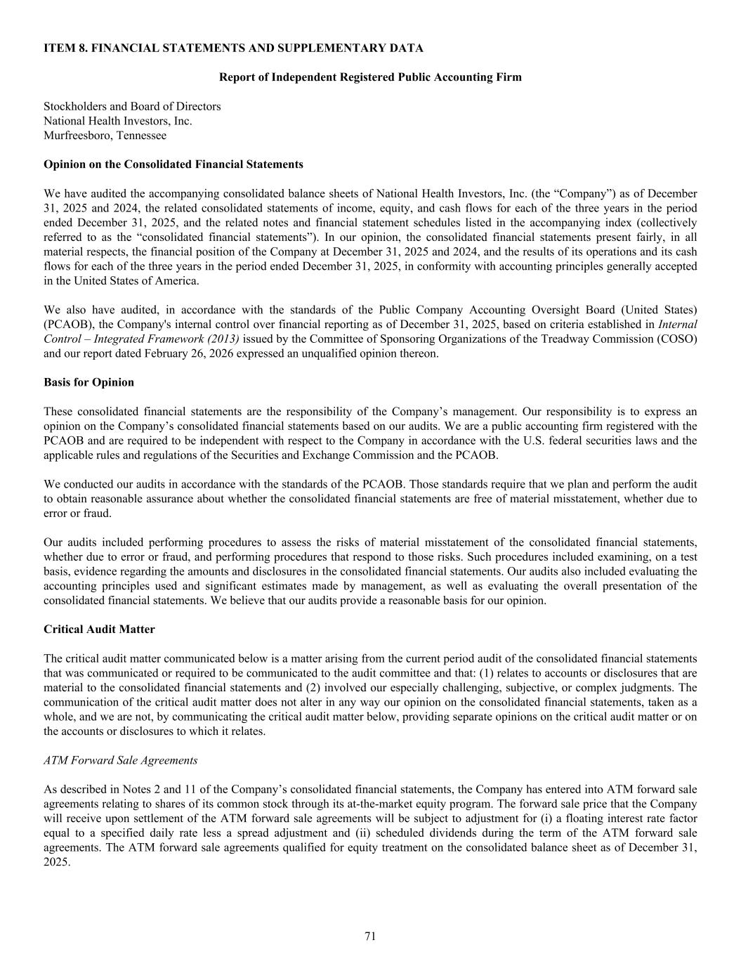 ITEM 8. FINANCIAL STATEMENTS AND SUPPLEMENTARY DATA Report of Independent Registered Public Accounting Firm Stockholders and Board of Directors National Health Investors, Inc. Murfreesboro, Tennessee Opinion on the Consolidated Financial Statements We have audited the accompanying consolidated balance sheets of National Health Investors, Inc. (the “Company”) as of December 31, 2025 and 2024, the related consolidated statements of income, equity, and cash flows for each of the three years in the period ended December 31, 2025, and the related notes and financial statement schedules listed in the accompanying index (collectively referred to as the “consolidated financial statements”). In our opinion, the consolidated financial statements present fairly, in all material respects, the financial position of the Company at December 31, 2025 and 2024, and the results of its operations and its cash flows for each of the three years in the period ended December 31, 2025, in conformity with accounting principles generally accepted in the United States of America. We also have audited, in accordance with the standards of the Public Company Accounting Oversight Board (United States) (PCAOB), the Company's internal control over financial reporting as of December 31, 2025, based on criteria established in Internal Control – Integrated Framework (2013) issued by the Committee of Sponsoring Organizations of the Treadway Commission (COSO) and our report dated February 26, 2026 expressed an unqualified opinion thereon. Basis for Opinion These consolidated financial statements are the responsibility of the Company’s management. Our responsibility is to express an opinion on the Company’s consolidated financial statements based on our audits. We are a public accounting firm registered with the PCAOB and are required to be independent with respect to the Company in accordance with the U.S. federal securities laws and the applicable rules and regulations of the Securities and Exchange Commission and the PCAOB. We conducted our audits in accordance with the standards of the PCAOB. Those standards require that we plan and perform the audit to obtain reasonable assurance about whether the consolidated financial statements are free of material misstatement, whether due to error or fraud. Our audits included performing procedures to assess the risks of material misstatement of the consolidated financial statements, whether due to error or fraud, and performing procedures that respond to those risks. Such procedures included examining, on a test basis, evidence regarding the amounts and disclosures in the consolidated financial statements. Our audits also included evaluating the accounting principles used and significant estimates made by management, as well as evaluating the overall presentation of the consolidated financial statements. We believe that our audits provide a reasonable basis for our opinion. Critical Audit Matter The critical audit matter communicated below is a matter arising from the current period audit of the consolidated financial statements that was communicated or required to be communicated to the audit committee and that: (1) relates to accounts or disclosures that are material to the consolidated financial statements and (2) involved our especially challenging, subjective, or complex judgments. The communication of the critical audit matter does not alter in any way our opinion on the consolidated financial statements, taken as a whole, and we are not, by communicating the critical audit matter below, providing separate opinions on the critical audit matter or on the accounts or disclosures to which it relates. ATM Forward Sale Agreements As described in Notes 2 and 11 of the Company’s consolidated financial statements, the Company has entered into ATM forward sale agreements relating to shares of its common stock through its at-the-market equity program. The forward sale price that the Company will receive upon settlement of the ATM forward sale agreements will be subject to adjustment for (i) a floating interest rate factor equal to a specified daily rate less a spread adjustment and (ii) scheduled dividends during the term of the ATM forward sale agreements. The ATM forward sale agreements qualified for equity treatment on the consolidated balance sheet as of December 31, 2025. 71