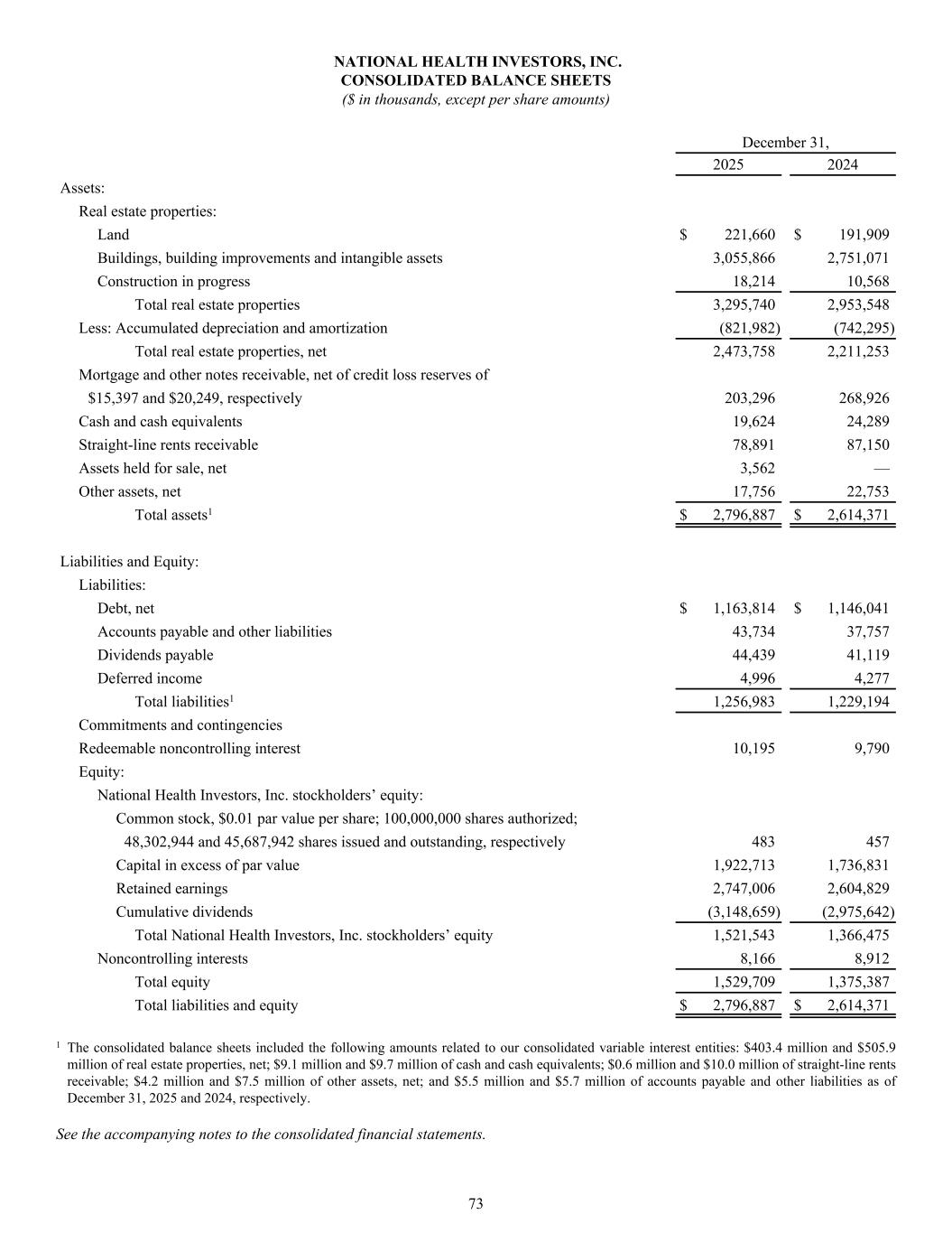 NATIONAL HEALTH INVESTORS, INC. CONSOLIDATED BALANCE SHEETS ($ in thousands, except per share amounts) December 31, 2025 2024 Assets: Real estate properties: Land $ 221,660 $ 191,909 Buildings, building improvements and intangible assets 3,055,866 2,751,071 Construction in progress 18,214 10,568 Total real estate properties 3,295,740 2,953,548 Less: Accumulated depreciation and amortization (821,982) (742,295) Total real estate properties, net 2,473,758 2,211,253 Mortgage and other notes receivable, net of credit loss reserves of $15,397 and $20,249, respectively 203,296 268,926 Cash and cash equivalents 19,624 24,289 Straight-line rents receivable 78,891 87,150 Assets held for sale, net 3,562 — Other assets, net 17,756 22,753 Total assets1 $ 2,796,887 $ 2,614,371 Liabilities and Equity: Liabilities: Debt, net $ 1,163,814 $ 1,146,041 Accounts payable and other liabilities 43,734 37,757 Dividends payable 44,439 41,119 Deferred income 4,996 4,277 Total liabilities1 1,256,983 1,229,194 Commitments and contingencies Redeemable noncontrolling interest 10,195 9,790 Equity: National Health Investors, Inc. stockholders’ equity: Common stock, $0.01 par value per share; 100,000,000 shares authorized; 48,302,944 and 45,687,942 shares issued and outstanding, respectively 483 457 Capital in excess of par value 1,922,713 1,736,831 Retained earnings 2,747,006 2,604,829 Cumulative dividends (3,148,659) (2,975,642) Total National Health Investors, Inc. stockholders’ equity 1,521,543 1,366,475 Noncontrolling interests 8,166 8,912 Total equity 1,529,709 1,375,387 Total liabilities and equity $ 2,796,887 $ 2,614,371 1 The consolidated balance sheets included the following amounts related to our consolidated variable interest entities: $403.4 million and $505.9 million of real estate properties, net; $9.1 million and $9.7 million of cash and cash equivalents; $0.6 million and $10.0 million of straight-line rents receivable; $4.2 million and $7.5 million of other assets, net; and $5.5 million and $5.7 million of accounts payable and other liabilities as of December 31, 2025 and 2024, respectively. See the accompanying notes to the consolidated financial statements. 73