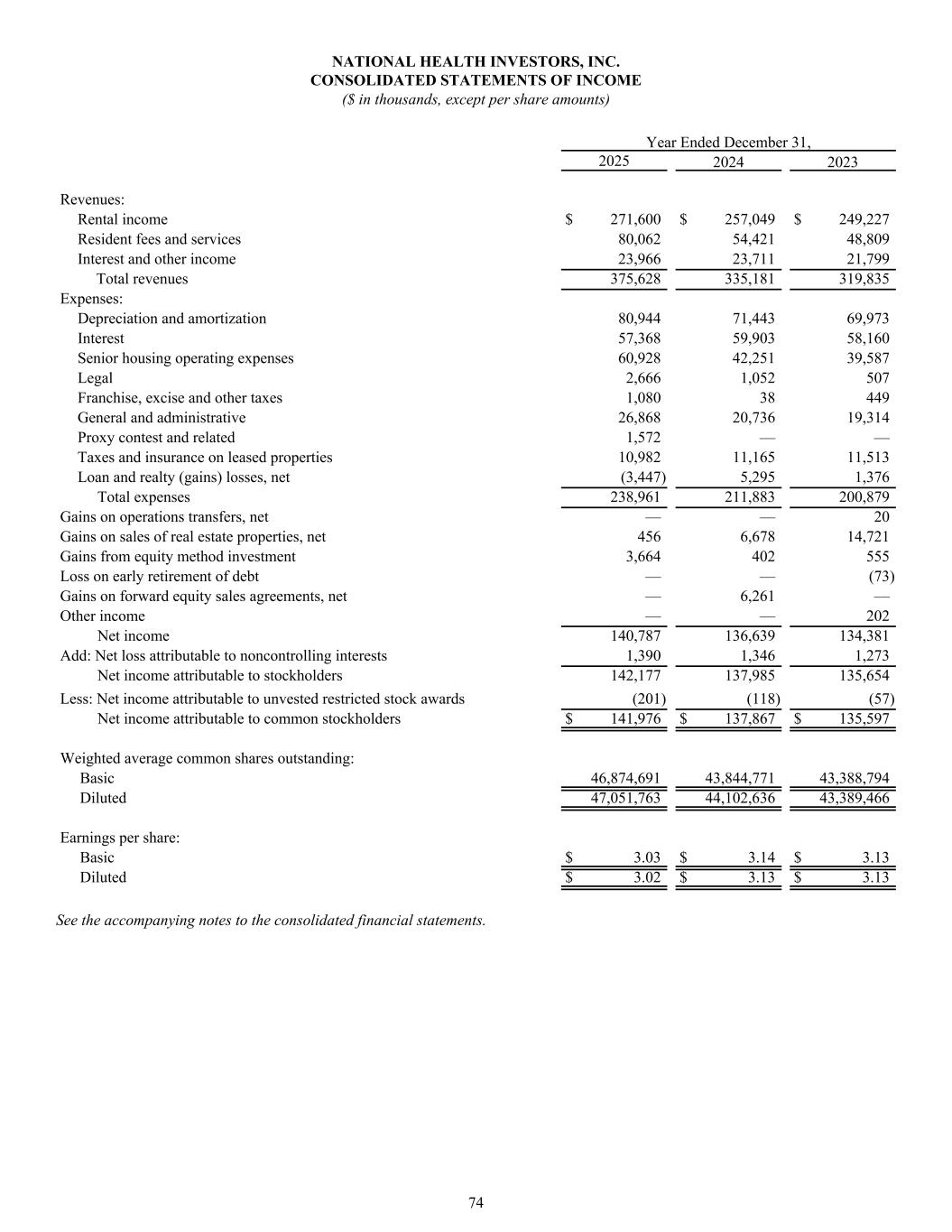 NATIONAL HEALTH INVESTORS, INC. CONSOLIDATED STATEMENTS OF INCOME ($ in thousands, except per share amounts) Year Ended December 31, 2025 2024 2023 Revenues: Rental income $ 271,600 $ 257,049 $ 249,227 Resident fees and services 80,062 54,421 48,809 Interest and other income 23,966 23,711 21,799 Total revenues 375,628 335,181 319,835 Expenses: Depreciation and amortization 80,944 71,443 69,973 Interest 57,368 59,903 58,160 Senior housing operating expenses 60,928 42,251 39,587 Legal 2,666 1,052 507 Franchise, excise and other taxes 1,080 38 449 General and administrative 26,868 20,736 19,314 Proxy contest and related 1,572 — — Taxes and insurance on leased properties 10,982 11,165 11,513 Loan and realty (gains) losses, net (3,447) 5,295 1,376 Total expenses 238,961 211,883 200,879 Gains on operations transfers, net — — 20 Gains on sales of real estate properties, net 456 6,678 14,721 Gains from equity method investment 3,664 402 555 Loss on early retirement of debt — — (73) Gains on forward equity sales agreements, net — 6,261 — Other income — — 202 Net income 140,787 136,639 134,381 Add: Net loss attributable to noncontrolling interests 1,390 1,346 1,273 Net income attributable to stockholders 142,177 137,985 135,654 Less: Net income attributable to unvested restricted stock awards (201) (118) (57) Net income attributable to common stockholders $ 141,976 $ 137,867 $ 135,597 Weighted average common shares outstanding: Basic 46,874,691 43,844,771 43,388,794 Diluted 47,051,763 44,102,636 43,389,466 Earnings per share: Basic $ 3.03 $ 3.14 $ 3.13 Diluted $ 3.02 $ 3.13 $ 3.13 See the accompanying notes to the consolidated financial statements. 74