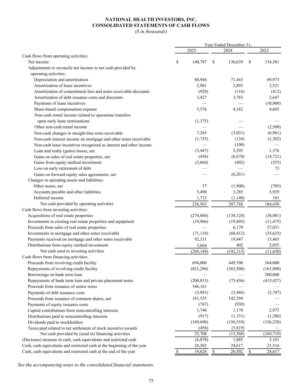 NATIONAL HEALTH INVESTORS, INC. CONSOLIDATED STATEMENTS OF CASH FLOWS ($ in thousands) Year Ended December 31, 2025 2024 2023 Cash flows from operating activities: Net income $ 140,787 $ 136,639 $ 134,381 Adjustments to reconcile net income to net cash provided by operating activities: Depreciation and amortization 80,944 71,443 69,973 Amortization of lease incentives 2,901 2,893 2,521 Amortization of commitment fees and notes receivable discounts (920) (116) (412) Amortization of debt issuance costs and discounts 3,427 3,783 2,647 Payments of lease incentives — — (10,000) Share-based compensation expense 5,576 4,182 4,605 Non-cash rental income related to operations transfers upon early lease terminations (1,375) — — Other non-cash rental income — — (2,500) Non-cash changes in straight-line rents receivable 7,265 (3,031) (6,961) Non-cash interest income on mortgage and other notes receivable (1,735) (124) (1,302) Non-cash lease incentives recognized as interest and other income — (100) — Loan and realty (gains) losses, net (3,447) 5,295 1,376 Gains on sales of real estate properties, net (456) (6,678) (14,721) Gains from equity method investment (3,664) (402) (555) Loss on early retirement of debt — — 73 Gains on forward equity sales agreements, net — (6,261) — Changes in operating assets and liabilities: Other assets, net 57 (1,900) (705) Accounts payable and other liabilities 5,490 3,285 5,929 Deferred income 1,713 (1,140) 101 Net cash provided by operating activities 236,563 207,768 184,450 Cash flows from investing activities: Acquisitions of real estate properties (274,068) (138,128) (38,081) Investments in existing real estate properties and equipment (19,966) (19,803) (11,475) Proceeds from sales of real estate properties — 6,179 57,031 Investments in mortgage and other notes receivable (71,110) (60,412) (35,625) Payments received on mortgage and other notes receivable 92,331 19,447 13,465 Distributions from equity method investment 3,664 402 3,055 Net cash used in investing activities (269,149) (192,315) (11,630) Cash flows from financing activities: Proceeds from revolving credit facility 694,000 449,700 364,000 Repayments of revolving credit facility (821,200) (363,500) (161,000) Borrowings on bank term loan — — 200,000 Repayments of bank term loan and private placement notes (200,815) (75,436) (415,427) Proceeds from issuance of senior notes 346,161 — — Payments of debt issuance costs (3,881) (3,486) (2,747) Proceeds from issuance of common shares, net 181,533 142,394 — Payments of equity issuance costs (767) (930) — Capital contributions from noncontrolling interests 1,746 1,170 2,973 Distributions paid to noncontrolling interests (917) (1,151) (1,280) Dividends paid to stockholders (169,696) (156,510) (156,238) Taxes paid related to net settlement of stock incentive awards (456) (5,819) — Net cash provided by (used in) financing activities 25,708 (13,568) (169,719) (Decrease) increase in cash, cash equivalents and restricted cash (6,878) 1,885 3,101 Cash, cash equivalents and restricted cash at the beginning of the year 26,502 24,617 21,516 Cash, cash equivalents and restricted cash at the end of the year $ 19,624 $ 26,502 $ 24,617 See the accompanying notes to the consolidated financial statements. 75