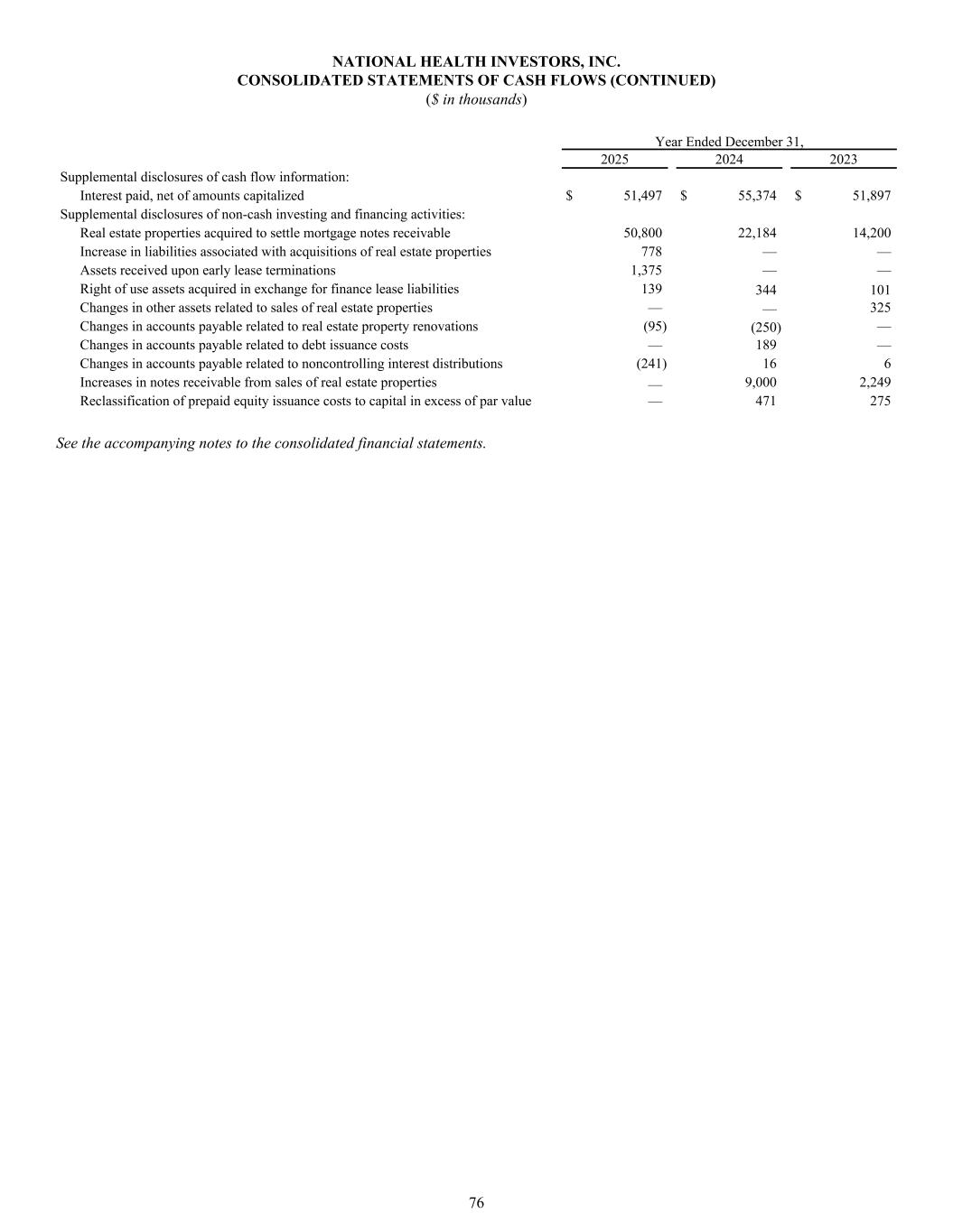 NATIONAL HEALTH INVESTORS, INC. CONSOLIDATED STATEMENTS OF CASH FLOWS (CONTINUED) ($ in thousands) Year Ended December 31, 2025 2024 2023 Supplemental disclosures of cash flow information: Interest paid, net of amounts capitalized $ 51,497 $ 55,374 $ 51,897 Supplemental disclosures of non-cash investing and financing activities: Real estate properties acquired to settle mortgage notes receivable 50,800 22,184 14,200 Increase in liabilities associated with acquisitions of real estate properties 778 — — Assets received upon early lease terminations 1,375 — — Right of use assets acquired in exchange for finance lease liabilities 139 344 101 Changes in other assets related to sales of real estate properties — — 325 Changes in accounts payable related to real estate property renovations (95) (250) — Changes in accounts payable related to debt issuance costs — 189 — Changes in accounts payable related to noncontrolling interest distributions (241) 16 6 Increases in notes receivable from sales of real estate properties — 9,000 2,249 Reclassification of prepaid equity issuance costs to capital in excess of par value — 471 275 See the accompanying notes to the consolidated financial statements. 76