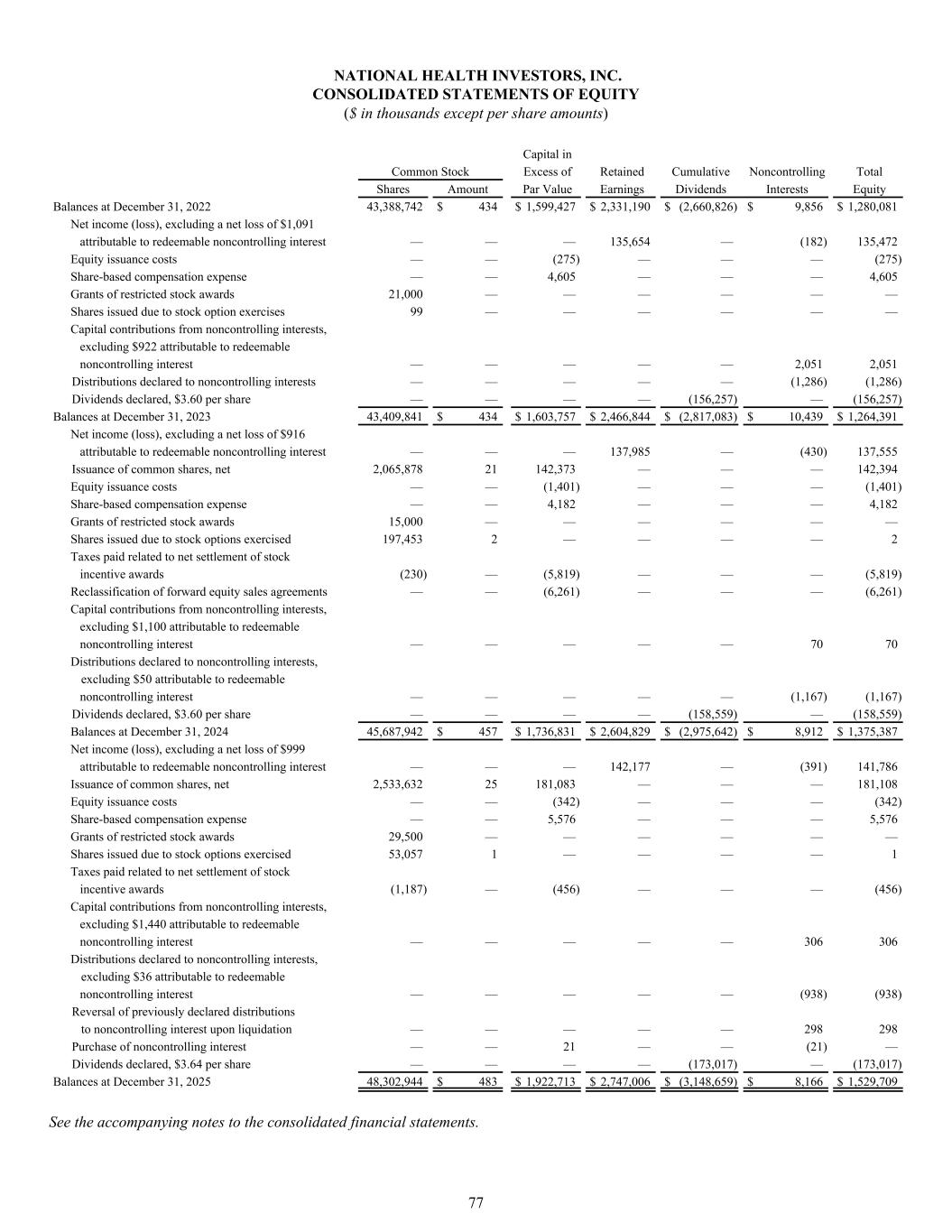 NATIONAL HEALTH INVESTORS, INC. CONSOLIDATED STATEMENTS OF EQUITY ($ in thousands except per share amounts) Capital in Common Stock Excess of Retained Cumulative Noncontrolling Total Shares Amount Par Value Earnings Dividends Interests Equity Balances at December 31, 2022 43,388,742 $ 434 $ 1,599,427 $ 2,331,190 $ (2,660,826) $ 9,856 $ 1,280,081 Net income (loss), excluding a net loss of $1,091 attributable to redeemable noncontrolling interest — — — 135,654 — (182) 135,472 Equity issuance costs — — (275) — — — (275) Share-based compensation expense — — 4,605 — — — 4,605 Grants of restricted stock awards 21,000 — — — — — — Shares issued due to stock option exercises 99 — — — — — — Capital contributions from noncontrolling interests, excluding $922 attributable to redeemable noncontrolling interest — — — — — 2,051 2,051 Distributions declared to noncontrolling interests — — — — — (1,286) (1,286) Dividends declared, $3.60 per share — — — — (156,257) — (156,257) Balances at December 31, 2023 43,409,841 $ 434 $ 1,603,757 $ 2,466,844 $ (2,817,083) $ 10,439 $ 1,264,391 Net income (loss), excluding a net loss of $916 attributable to redeemable noncontrolling interest — — — 137,985 — (430) 137,555 Issuance of common shares, net 2,065,878 21 142,373 — — — 142,394 Equity issuance costs — — (1,401) — — — (1,401) Share-based compensation expense — — 4,182 — — — 4,182 Grants of restricted stock awards 15,000 — — — — — — Shares issued due to stock options exercised 197,453 2 — — — — 2 Taxes paid related to net settlement of stock incentive awards (230) — (5,819) — — — (5,819) Reclassification of forward equity sales agreements — — (6,261) — — — (6,261) Capital contributions from noncontrolling interests, excluding $1,100 attributable to redeemable noncontrolling interest — — — — — 70 70 Distributions declared to noncontrolling interests, excluding $50 attributable to redeemable noncontrolling interest — — — — — (1,167) (1,167) Dividends declared, $3.60 per share — — — — (158,559) — (158,559) Balances at December 31, 2024 45,687,942 $ 457 $ 1,736,831 $ 2,604,829 $ (2,975,642) $ 8,912 $ 1,375,387 Net income (loss), excluding a net loss of $999 attributable to redeemable noncontrolling interest — — — 142,177 — (391) 141,786 Issuance of common shares, net 2,533,632 25 181,083 — — — 181,108 Equity issuance costs — — (342) — — — (342) Share-based compensation expense — — 5,576 — — — 5,576 Grants of restricted stock awards 29,500 — — — — — — Shares issued due to stock options exercised 53,057 1 — — — — 1 Taxes paid related to net settlement of stock incentive awards (1,187) — (456) — — — (456) Capital contributions from noncontrolling interests, excluding $1,440 attributable to redeemable noncontrolling interest — — — — — 306 306 Distributions declared to noncontrolling interests, excluding $36 attributable to redeemable noncontrolling interest — — — — — (938) (938) Reversal of previously declared distributions to noncontrolling interest upon liquidation — — — — — 298 298 Purchase of noncontrolling interest — — 21 — — (21) — Dividends declared, $3.64 per share — — — — (173,017) — (173,017) Balances at December 31, 2025 48,302,944 $ 483 $ 1,922,713 $ 2,747,006 $ (3,148,659) $ 8,166 $ 1,529,709 See the accompanying notes to the consolidated financial statements. 77