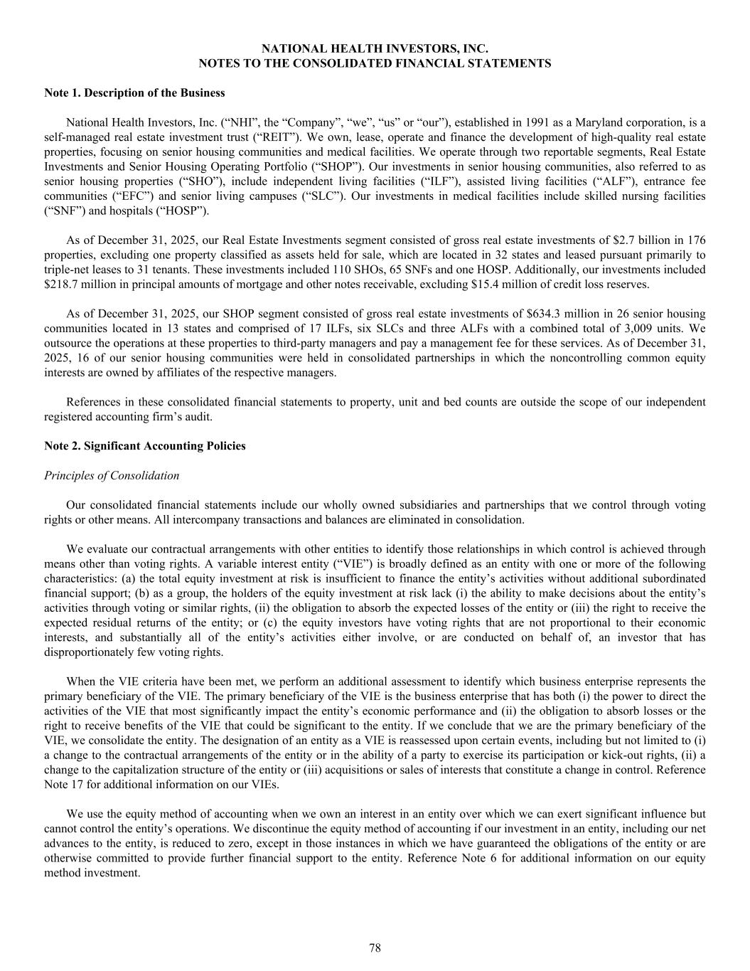 NATIONAL HEALTH INVESTORS, INC. NOTES TO THE CONSOLIDATED FINANCIAL STATEMENTS Note 1. Description of the Business National Health Investors, Inc. (“NHI”, the “Company”, “we”, “us” or “our”), established in 1991 as a Maryland corporation, is a self-managed real estate investment trust (“REIT”). We own, lease, operate and finance the development of high-quality real estate properties, focusing on senior housing communities and medical facilities. We operate through two reportable segments, Real Estate Investments and Senior Housing Operating Portfolio (“SHOP”). Our investments in senior housing communities, also referred to as senior housing properties (“SHO”), include independent living facilities (“ILF”), assisted living facilities (“ALF”), entrance fee communities (“EFC”) and senior living campuses (“SLC”). Our investments in medical facilities include skilled nursing facilities (“SNF”) and hospitals (“HOSP”). As of December 31, 2025, our Real Estate Investments segment consisted of gross real estate investments of $2.7 billion in 176 properties, excluding one property classified as assets held for sale, which are located in 32 states and leased pursuant primarily to triple-net leases to 31 tenants. These investments included 110 SHOs, 65 SNFs and one HOSP. Additionally, our investments included $218.7 million in principal amounts of mortgage and other notes receivable, excluding $15.4 million of credit loss reserves. As of December 31, 2025, our SHOP segment consisted of gross real estate investments of $634.3 million in 26 senior housing communities located in 13 states and comprised of 17 ILFs, six SLCs and three ALFs with a combined total of 3,009 units. We outsource the operations at these properties to third-party managers and pay a management fee for these services. As of December 31, 2025, 16 of our senior housing communities were held in consolidated partnerships in which the noncontrolling common equity interests are owned by affiliates of the respective managers. References in these consolidated financial statements to property, unit and bed counts are outside the scope of our independent registered accounting firm’s audit. Note 2. Significant Accounting Policies Principles of Consolidation Our consolidated financial statements include our wholly owned subsidiaries and partnerships that we control through voting rights or other means. All intercompany transactions and balances are eliminated in consolidation. We evaluate our contractual arrangements with other entities to identify those relationships in which control is achieved through means other than voting rights. A variable interest entity (“VIE”) is broadly defined as an entity with one or more of the following characteristics: (a) the total equity investment at risk is insufficient to finance the entity’s activities without additional subordinated financial support; (b) as a group, the holders of the equity investment at risk lack (i) the ability to make decisions about the entity’s activities through voting or similar rights, (ii) the obligation to absorb the expected losses of the entity or (iii) the right to receive the expected residual returns of the entity; or (c) the equity investors have voting rights that are not proportional to their economic interests, and substantially all of the entity’s activities either involve, or are conducted on behalf of, an investor that has disproportionately few voting rights. When the VIE criteria have been met, we perform an additional assessment to identify which business enterprise represents the primary beneficiary of the VIE. The primary beneficiary of the VIE is the business enterprise that has both (i) the power to direct the activities of the VIE that most significantly impact the entity’s economic performance and (ii) the obligation to absorb losses or the right to receive benefits of the VIE that could be significant to the entity. If we conclude that we are the primary beneficiary of the VIE, we consolidate the entity. The designation of an entity as a VIE is reassessed upon certain events, including but not limited to (i) a change to the contractual arrangements of the entity or in the ability of a party to exercise its participation or kick-out rights, (ii) a change to the capitalization structure of the entity or (iii) acquisitions or sales of interests that constitute a change in control. Reference Note 17 for additional information on our VIEs. We use the equity method of accounting when we own an interest in an entity over which we can exert significant influence but cannot control the entity’s operations. We discontinue the equity method of accounting if our investment in an entity, including our net advances to the entity, is reduced to zero, except in those instances in which we have guaranteed the obligations of the entity or are otherwise committed to provide further financial support to the entity. Reference Note 6 for additional information on our equity method investment. 78