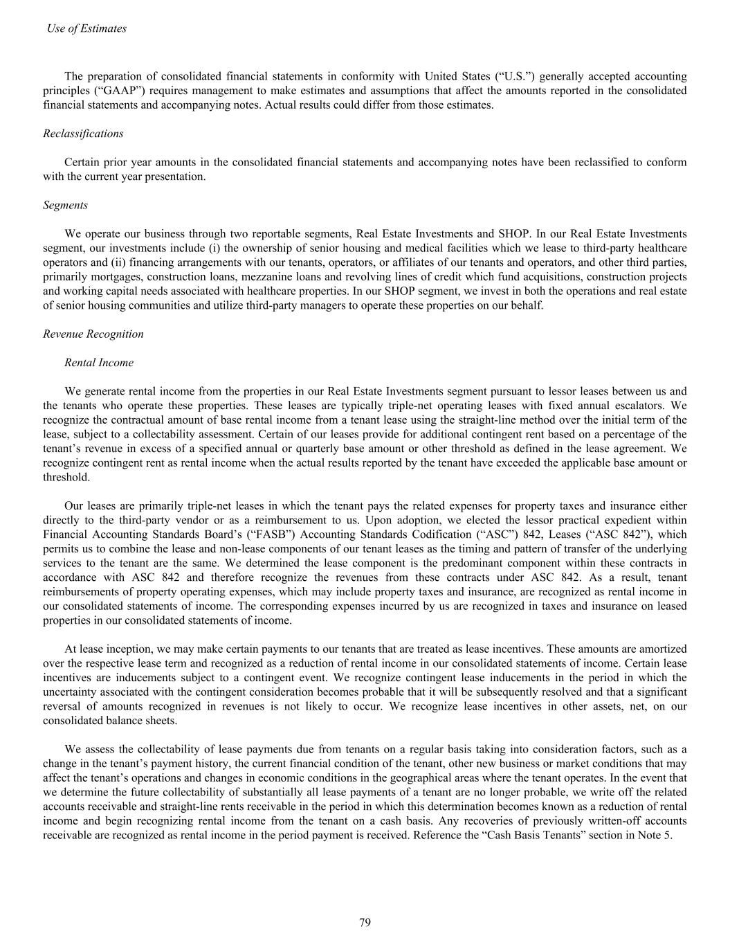 The preparation of consolidated financial statements in conformity with United States (“U.S.”) generally accepted accounting principles (“GAAP”) requires management to make estimates and assumptions that affect the amounts reported in the consolidated financial statements and accompanying notes. Actual results could differ from those estimates. Reclassifications Certain prior year amounts in the consolidated financial statements and accompanying notes have been reclassified to conform with the current year presentation. Segments We operate our business through two reportable segments, Real Estate Investments and SHOP. In our Real Estate Investments segment, our investments include (i) the ownership of senior housing and medical facilities which we lease to third-party healthcare operators and (ii) financing arrangements with our tenants, operators, or affiliates of our tenants and operators, and other third parties, primarily mortgages, construction loans, mezzanine loans and revolving lines of credit which fund acquisitions, construction projects and working capital needs associated with healthcare properties. In our SHOP segment, we invest in both the operations and real estate of senior housing communities and utilize third-party managers to operate these properties on our behalf. Revenue Recognition Rental Income We generate rental income from the properties in our Real Estate Investments segment pursuant to lessor leases between us and the tenants who operate these properties. These leases are typically triple-net operating leases with fixed annual escalators. We recognize the contractual amount of base rental income from a tenant lease using the straight-line method over the initial term of the lease, subject to a collectability assessment. Certain of our leases provide for additional contingent rent based on a percentage of the tenant’s revenue in excess of a specified annual or quarterly base amount or other threshold as defined in the lease agreement. We recognize contingent rent as rental income when the actual results reported by the tenant have exceeded the applicable base amount or threshold. Our leases are primarily triple-net leases in which the tenant pays the related expenses for property taxes and insurance either directly to the third-party vendor or as a reimbursement to us. Upon adoption, we elected the lessor practical expedient within Financial Accounting Standards Board’s (“FASB”) Accounting Standards Codification (“ASC”) 842, Leases (“ASC 842”), which permits us to combine the lease and non-lease components of our tenant leases as the timing and pattern of transfer of the underlying services to the tenant are the same. We determined the lease component is the predominant component within these contracts in accordance with ASC 842 and therefore recognize the revenues from these contracts under ASC 842. As a result, tenant reimbursements of property operating expenses, which may include property taxes and insurance, are recognized as rental income in our consolidated statements of income. The corresponding expenses incurred by us are recognized in taxes and insurance on leased properties in our consolidated statements of income. At lease inception, we may make certain payments to our tenants that are treated as lease incentives. These amounts are amortized over the respective lease term and recognized as a reduction of rental income in our consolidated statements of income. Certain lease incentives are inducements subject to a contingent event. We recognize contingent lease inducements in the period in which the uncertainty associated with the contingent consideration becomes probable that it will be subsequently resolved and that a significant reversal of amounts recognized in revenues is not likely to occur. We recognize lease incentives in other assets, net, on our consolidated balance sheets. We assess the collectability of lease payments due from tenants on a regular basis taking into consideration factors, such as a change in the tenant’s payment history, the current financial condition of the tenant, other new business or market conditions that may affect the tenant’s operations and changes in economic conditions in the geographical areas where the tenant operates. In the event that we determine the future collectability of substantially all lease payments of a tenant are no longer probable, we write off the related accounts receivable and straight-line rents receivable in the period in which this determination becomes known as a reduction of rental income and begin recognizing rental income from the tenant on a cash basis. Any recoveries of previously written-off accounts receivable are recognized as rental income in the period payment is received. Reference the “Cash Basis Tenants” section in Note 5. Use of Estimates 79