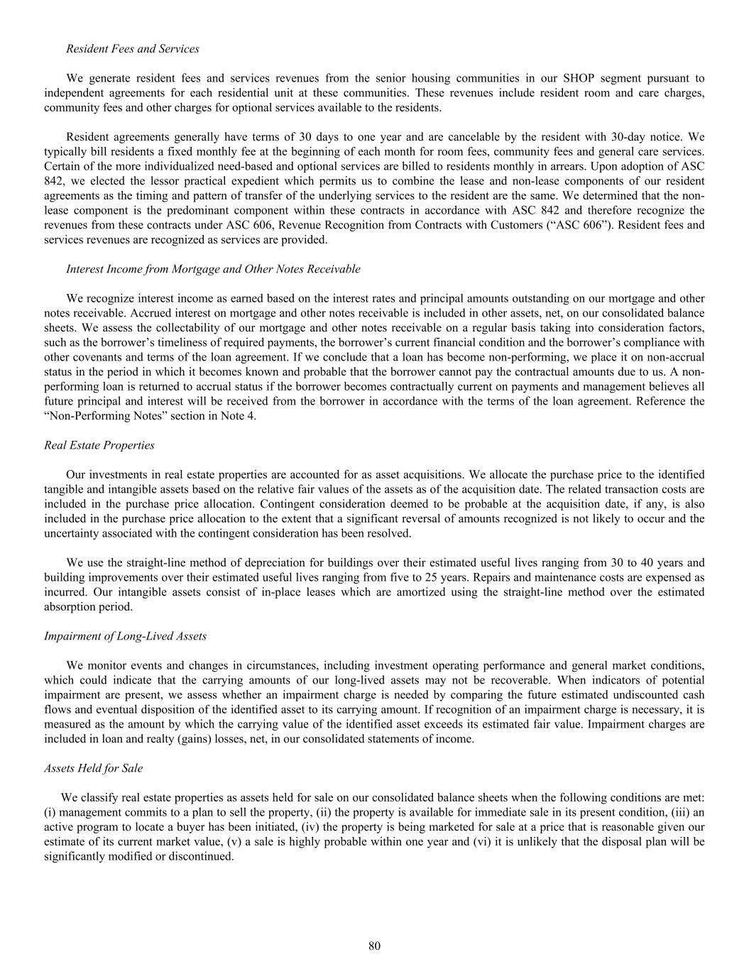 Resident Fees and Services We generate resident fees and services revenues from the senior housing communities in our SHOP segment pursuant to independent agreements for each residential unit at these communities. These revenues include resident room and care charges, community fees and other charges for optional services available to the residents. Resident agreements generally have terms of 30 days to one year and are cancelable by the resident with 30-day notice. We typically bill residents a fixed monthly fee at the beginning of each month for room fees, community fees and general care services. Certain of the more individualized need-based and optional services are billed to residents monthly in arrears. Upon adoption of ASC 842, we elected the lessor practical expedient which permits us to combine the lease and non-lease components of our resident agreements as the timing and pattern of transfer of the underlying services to the resident are the same. We determined that the non- lease component is the predominant component within these contracts in accordance with ASC 842 and therefore recognize the revenues from these contracts under ASC 606, Revenue Recognition from Contracts with Customers (“ASC 606”). Resident fees and services revenues are recognized as services are provided. Interest Income from Mortgage and Other Notes Receivable We recognize interest income as earned based on the interest rates and principal amounts outstanding on our mortgage and other notes receivable. Accrued interest on mortgage and other notes receivable is included in other assets, net, on our consolidated balance sheets. We assess the collectability of our mortgage and other notes receivable on a regular basis taking into consideration factors, such as the borrower’s timeliness of required payments, the borrower’s current financial condition and the borrower’s compliance with other covenants and terms of the loan agreement. If we conclude that a loan has become non-performing, we place it on non-accrual status in the period in which it becomes known and probable that the borrower cannot pay the contractual amounts due to us. A non- performing loan is returned to accrual status if the borrower becomes contractually current on payments and management believes all future principal and interest will be received from the borrower in accordance with the terms of the loan agreement. Reference the “Non-Performing Notes” section in Note 4. Real Estate Properties Our investments in real estate properties are accounted for as asset acquisitions. We allocate the purchase price to the identified tangible and intangible assets based on the relative fair values of the assets as of the acquisition date. The related transaction costs are included in the purchase price allocation. Contingent consideration deemed to be probable at the acquisition date, if any, is also included in the purchase price allocation to the extent that a significant reversal of amounts recognized is not likely to occur and the uncertainty associated with the contingent consideration has been resolved. We use the straight-line method of depreciation for buildings over their estimated useful lives ranging from 30 to 40 years and building improvements over their estimated useful lives ranging from five to 25 years. Repairs and maintenance costs are expensed as incurred. Our intangible assets consist of in-place leases which are amortized using the straight-line method over the estimated absorption period. Impairment of Long-Lived Assets We monitor events and changes in circumstances, including investment operating performance and general market conditions, which could indicate that the carrying amounts of our long-lived assets may not be recoverable. When indicators of potential impairment are present, we assess whether an impairment charge is needed by comparing the future estimated undiscounted cash flows and eventual disposition of the identified asset to its carrying amount. If recognition of an impairment charge is necessary, it is measured as the amount by which the carrying value of the identified asset exceeds its estimated fair value. Impairment charges are included in loan and realty (gains) losses, net, in our consolidated statements of income. Assets Held for Sale We classify real estate properties as assets held for sale on our consolidated balance sheets when the following conditions are met: (i) management commits to a plan to sell the property, (ii) the property is available for immediate sale in its present condition, (iii) an active program to locate a buyer has been initiated, (iv) the property is being marketed for sale at a price that is reasonable given our estimate of its current market value, (v) a sale is highly probable within one year and (vi) it is unlikely that the disposal plan will be significantly modified or discontinued. 80