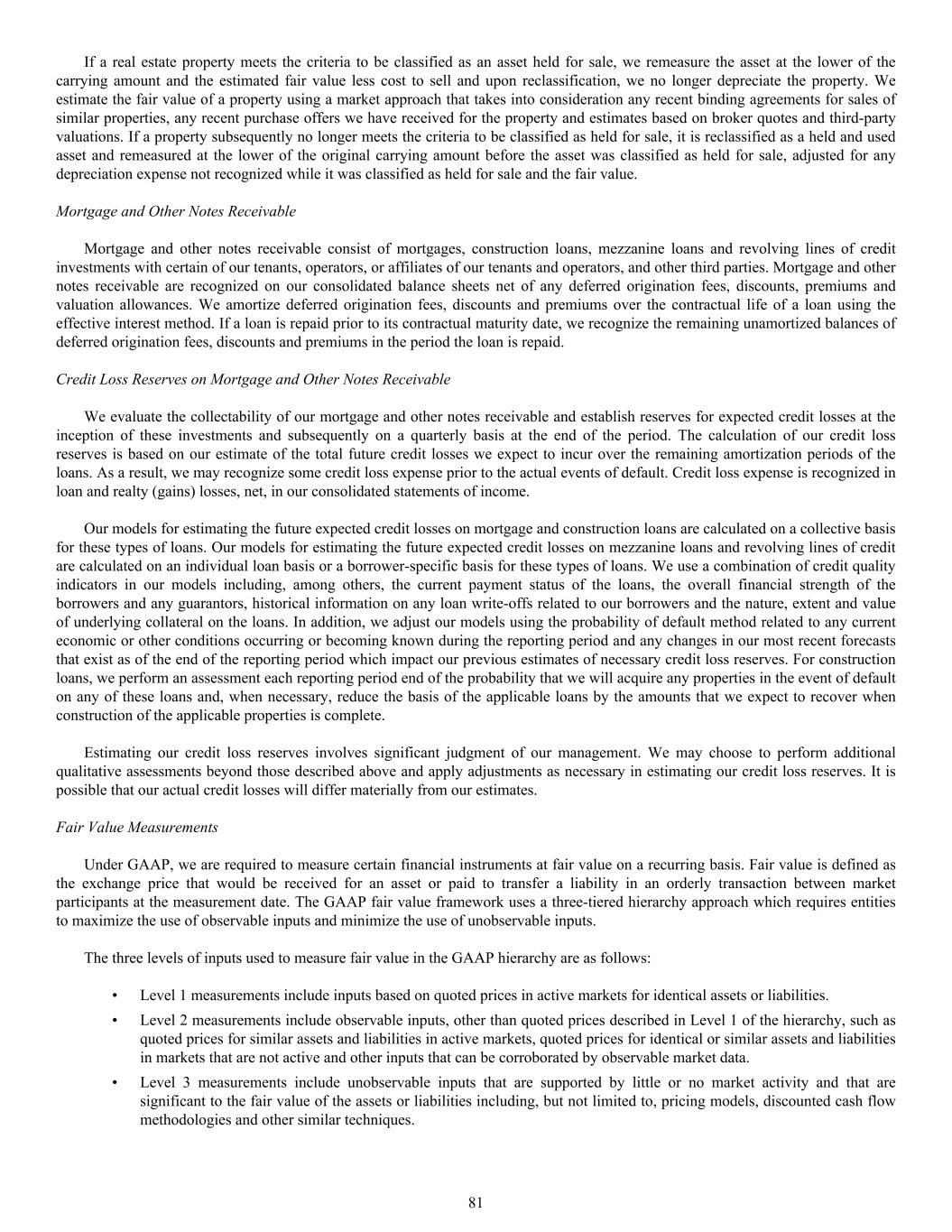 The three levels of inputs used to measure fair value in the GAAP hierarchy are as follows: • Level 1 measurements include inputs based on quoted prices in active markets for identical assets or liabilities. • Level 2 measurements include observable inputs, other than quoted prices described in Level 1 of the hierarchy, such as quoted prices for similar assets and liabilities in active markets, quoted prices for identical or similar assets and liabilities in markets that are not active and other inputs that can be corroborated by observable market data. • Level 3 measurements include unobservable inputs that are supported by little or no market activity and that are significant to the fair value of the assets or liabilities including, but not limited to, pricing models, discounted cash flow methodologies and other similar techniques. If a real estate property meets the criteria to be classified as an asset held for sale, we remeasure the asset at the lower of the carrying amount and the estimated fair value less cost to sell and upon reclassification, we no longer depreciate the property. We estimate the fair value of a property using a market approach that takes into consideration any recent binding agreements for sales of similar properties, any recent purchase offers we have received for the property and estimates based on broker quotes and third-party valuations. If a property subsequently no longer meets the criteria to be classified as held for sale, it is reclassified as a held and used asset and remeasured at the lower of the original carrying amount before the asset was classified as held for sale, adjusted for any depreciation expense not recognized while it was classified as held for sale and the fair value. Mortgage and Other Notes Receivable Mortgage and other notes receivable consist of mortgages, construction loans, mezzanine loans and revolving lines of credit investments with certain of our tenants, operators, or affiliates of our tenants and operators, and other third parties. Mortgage and other notes receivable are recognized on our consolidated balance sheets net of any deferred origination fees, discounts, premiums and valuation allowances. We amortize deferred origination fees, discounts and premiums over the contractual life of a loan using the effective interest method. If a loan is repaid prior to its contractual maturity date, we recognize the remaining unamortized balances of deferred origination fees, discounts and premiums in the period the loan is repaid. Credit Loss Reserves on Mortgage and Other Notes Receivable We evaluate the collectability of our mortgage and other notes receivable and establish reserves for expected credit losses at the inception of these investments and subsequently on a quarterly basis at the end of the period. The calculation of our credit loss reserves is based on our estimate of the total future credit losses we expect to incur over the remaining amortization periods of the loans. As a result, we may recognize some credit loss expense prior to the actual events of default. Credit loss expense is recognized in loan and realty (gains) losses, net, in our consolidated statements of income. Our models for estimating the future expected credit losses on mortgage and construction loans are calculated on a collective basis for these types of loans. Our models for estimating the future expected credit losses on mezzanine loans and revolving lines of credit are calculated on an individual loan basis or a borrower-specific basis for these types of loans. We use a combination of credit quality indicators in our models including, among others, the current payment status of the loans, the overall financial strength of the borrowers and any guarantors, historical information on any loan write-offs related to our borrowers and the nature, extent and value of underlying collateral on the loans. In addition, we adjust our models using the probability of default method related to any current economic or other conditions occurring or becoming known during the reporting period and any changes in our most recent forecasts that exist as of the end of the reporting period which impact our previous estimates of necessary credit loss reserves. For construction loans, we perform an assessment each reporting period end of the probability that we will acquire any properties in the event of default on any of these loans and, when necessary, reduce the basis of the applicable loans by the amounts that we expect to recover when construction of the applicable properties is complete. Estimating our credit loss reserves involves significant judgment of our management. We may choose to perform additional qualitative assessments beyond those described above and apply adjustments as necessary in estimating our credit loss reserves. It is possible that our actual credit losses will differ materially from our estimates. Fair Value Measurements Under GAAP, we are required to measure certain financial instruments at fair value on a recurring basis. Fair value is defined as the exchange price that would be received for an asset or paid to transfer a liability in an orderly transaction between market participants at the measurement date. The GAAP fair value framework uses a three-tiered hierarchy approach which requires entities to maximize the use of observable inputs and minimize the use of unobservable inputs. 81