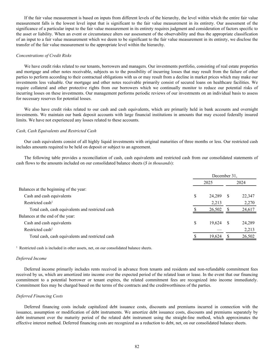 December 31, 2025 2024 Balances at the beginning of the year: Cash and cash equivalents $ 24,289 $ 22,347 Restricted cash1 2,213 2,270 Total cash, cash equivalents and restricted cash $ 26,502 $ 24,617 Balances at the end of the year: Cash and cash equivalents $ 19,624 $ 24,289 Restricted cash1 — 2,213 Total cash, cash equivalents and restricted cash $ 19,624 $ 26,502 1 Restricted cash is included in other assets, net, on our consolidated balance sheets. Deferred Income Deferred income primarily includes rents received in advance from tenants and residents and non-refundable commitment fees received by us, which are amortized into income over the expected period of the related loan or lease. In the event that our financing commitment to a potential borrower or tenant expires, the related commitment fees are recognized into income immediately. Commitment fees may be charged based on the terms of the contracts and the creditworthiness of the parties. Deferred Financing Costs Deferred financing costs include capitalized debt issuance costs, discounts and premiums incurred in connection with the issuance, assumption or modification of debt instruments. We amortize debt issuance costs, discounts and premiums separately by debt instrument over the maturity period of the related debt instrument using the straight-line method, which approximates the effective interest method. Deferred financing costs are recognized as a reduction to debt, net, on our consolidated balance sheets. If the fair value measurement is based on inputs from different levels of the hierarchy, the level within which the entire fair value measurement falls is the lowest level input that is significant to the fair value measurement in its entirety. Our assessment of the significance of a particular input to the fair value measurement in its entirety requires judgment and consideration of factors specific to the asset or liability. When an event or circumstance alters our assessment of the observability and thus the appropriate classification of an input to a fair value measurement which we deem to be significant to the fair value measurement in its entirety, we disclose the transfer of the fair value measurement to the appropriate level within the hierarchy. Concentrations of Credit Risks We have credit risks related to our tenants, borrowers and managers. Our investments portfolio, consisting of real estate properties and mortgage and other notes receivable, subjects us to the possibility of incurring losses that may result from the failure of other parties to perform according to their contractual obligations with us or may result from a decline in market prices which may make our investments less valuable. Our mortgage and other notes receivable primarily consist of secured loans on healthcare facilities. We require collateral and other protective rights from our borrowers which we continually monitor to reduce our potential risks of incurring losses on these investments. Our management performs periodic reviews of our investments on an individual basis to assess for necessary reserves for potential losses. We also have credit risks related to our cash and cash equivalents, which are primarily held in bank accounts and overnight investments. We maintain our bank deposit accounts with large financial institutions in amounts that may exceed federally insured limits. We have not experienced any losses related to these accounts. Cash, Cash Equivalents and Restricted Cash Our cash equivalents consist of all highly liquid investments with original maturities of three months or less. Our restricted cash includes amounts required to be held on deposit or subject to an agreement. The following table provides a reconciliation of cash, cash equivalents and restricted cash from our consolidated statements of cash flows to the amounts included on our consolidated balance sheets ($ in thousands): 82