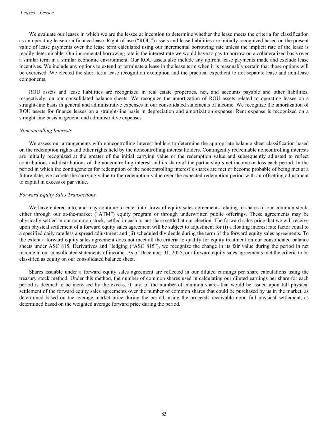 We evaluate our leases in which we are the lessee at inception to determine whether the lease meets the criteria for classification as an operating lease or a finance lease. Right-of-use (“ROU”) assets and lease liabilities are initially recognized based on the present value of lease payments over the lease term calculated using our incremental borrowing rate unless the implicit rate of the lease is readily determinable. Our incremental borrowing rate is the interest rate we would have to pay to borrow on a collateralized basis over a similar term in a similar economic environment. Our ROU assets also include any upfront lease payments made and exclude lease incentives. We include any options to extend or terminate a lease in the lease term when it is reasonably certain that those options will be exercised. We elected the short-term lease recognition exemption and the practical expedient to not separate lease and non-lease components. ROU assets and lease liabilities are recognized in real estate properties, net, and accounts payable and other liabilities, respectively, on our consolidated balance sheets. We recognize the amortization of ROU assets related to operating leases on a straight-line basis in general and administrative expenses in our consolidated statements of income. We recognize the amortization of ROU assets for finance leases on a straight-line basis in depreciation and amortization expense. Rent expense is recognized on a straight-line basis in general and administrative expenses. Noncontrolling Interests We assess our arrangements with noncontrolling interest holders to determine the appropriate balance sheet classification based on the redemption rights and other rights held by the noncontrolling interest holders. Contingently redeemable noncontrolling interests are initially recognized at the greater of the initial carrying value or the redemption value and subsequently adjusted to reflect contributions and distributions of the noncontrolling interest and its share of the partnership’s net income or loss each period. In the period in which the contingencies for redemption of the noncontrolling interest’s shares are met or become probable of being met at a future date, we accrete the carrying value to the redemption value over the expected redemption period with an offsetting adjustment to capital in excess of par value. Forward Equity Sales Transactions We have entered into, and may continue to enter into, forward equity sales agreements relating to shares of our common stock, either through our at-the-market (“ATM”) equity program or through underwritten public offerings. These agreements may be physically settled in our common stock, settled in cash or net share settled at our election. The forward sales price that we will receive upon physical settlement of a forward equity sales agreement will be subject to adjustment for (i) a floating interest rate factor equal to a specified daily rate less a spread adjustment and (ii) scheduled dividends during the term of the forward equity sales agreements. To the extent a forward equity sales agreement does not meet all the criteria to qualify for equity treatment on our consolidated balance sheets under ASC 815, Derivatives and Hedging (“ASC 815”), we recognize the change in its fair value during the period in net income in our consolidated statements of income. As of December 31, 2025, our forward equity sales agreements met the criteria to be classified as equity on our consolidated balance sheet. Shares issuable under a forward equity sales agreement are reflected in our diluted earnings per share calculations using the treasury stock method. Under this method, the number of common shares used in calculating our diluted earnings per share for each period is deemed to be increased by the excess, if any, of the number of common shares that would be issued upon full physical settlement of the forward equity sales agreements over the number of common shares that could be purchased by us in the market, as determined based on the average market price during the period, using the proceeds receivable upon full physical settlement, as determined based on the weighted average forward price during the period. Leases - Lessee 83