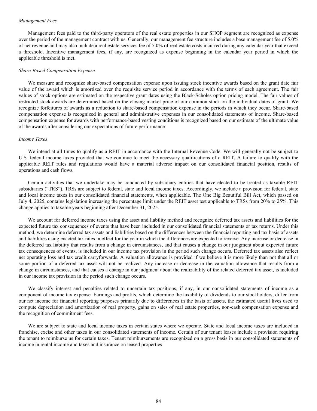 Management Fees Management fees paid to the third-party operators of the real estate properties in our SHOP segment are recognized as expense over the period of the management contract with us. Generally, our management fee structure includes a base management fee of 5.0% of net revenue and may also include a real estate services fee of 5.0% of real estate costs incurred during any calendar year that exceed a threshold. Incentive management fees, if any, are recognized as expense beginning in the calendar year period in which the applicable threshold is met. Share-Based Compensation Expense We measure and recognize share-based compensation expense upon issuing stock incentive awards based on the grant date fair value of the award which is amortized over the requisite service period in accordance with the terms of each agreement. The fair values of stock options are estimated on the respective grant dates using the Black-Scholes option pricing model. The fair values of restricted stock awards are determined based on the closing market price of our common stock on the individual dates of grant. We recognize forfeitures of awards as a reduction to share-based compensation expense in the periods in which they occur. Share-based compensation expense is recognized in general and administrative expenses in our consolidated statements of income. Share-based compensation expense for awards with performance-based vesting conditions is recognized based on our estimate of the ultimate value of the awards after considering our expectations of future performance. Income Taxes We intend at all times to qualify as a REIT in accordance with the Internal Revenue Code. We will generally not be subject to U.S. federal income taxes provided that we continue to meet the necessary qualifications of a REIT. A failure to qualify with the applicable REIT rules and regulations would have a material adverse impact on our consolidated financial position, results of operations and cash flows. Certain activities that we undertake may be conducted by subsidiary entities that have elected to be treated as taxable REIT subsidiaries (“TRS”). TRSs are subject to federal, state and local income taxes. Accordingly, we include a provision for federal, state and local income taxes in our consolidated financial statements, when applicable. The One Big Beautiful Bill Act, which passed on July 4, 2025, contains legislation increasing the percentage limit under the REIT asset test applicable to TRSs from 20% to 25%. This change applies to taxable years beginning after December 31, 2025. We account for deferred income taxes using the asset and liability method and recognize deferred tax assets and liabilities for the expected future tax consequences of events that have been included in our consolidated financial statements or tax returns. Under this method, we determine deferred tax assets and liabilities based on the differences between the financial reporting and tax basis of assets and liabilities using enacted tax rates in effect for the year in which the differences are expected to reverse. Any increase or decrease in the deferred tax liability that results from a change in circumstances, and that causes a change in our judgment about expected future tax consequences of events, is included in our income tax provision in the period such change occurs. Deferred tax assets also reflect net operating loss and tax credit carryforwards. A valuation allowance is provided if we believe it is more likely than not that all or some portion of a deferred tax asset will not be realized. Any increase or decrease in the valuation allowance that results from a change in circumstances, and that causes a change in our judgment about the realizability of the related deferred tax asset, is included in our income tax provision in the period such change occurs. We classify interest and penalties related to uncertain tax positions, if any, in our consolidated statements of income as a component of income tax expense. Earnings and profits, which determine the taxability of dividends to our stockholders, differ from our net income for financial reporting purposes primarily due to differences in the basis of assets, the estimated useful lives used to compute depreciation and amortization of real property, gains on sales of real estate properties, non-cash compensation expense and the recognition of commitment fees. We are subject to state and local income taxes in certain states where we operate. State and local income taxes are included in franchise, excise and other taxes in our consolidated statements of income. Certain of our tenant leases include a provision requiring the tenant to reimburse us for certain taxes. Tenant reimbursements are recognized on a gross basis in our consolidated statements of income in rental income and taxes and insurance on leased properties 84