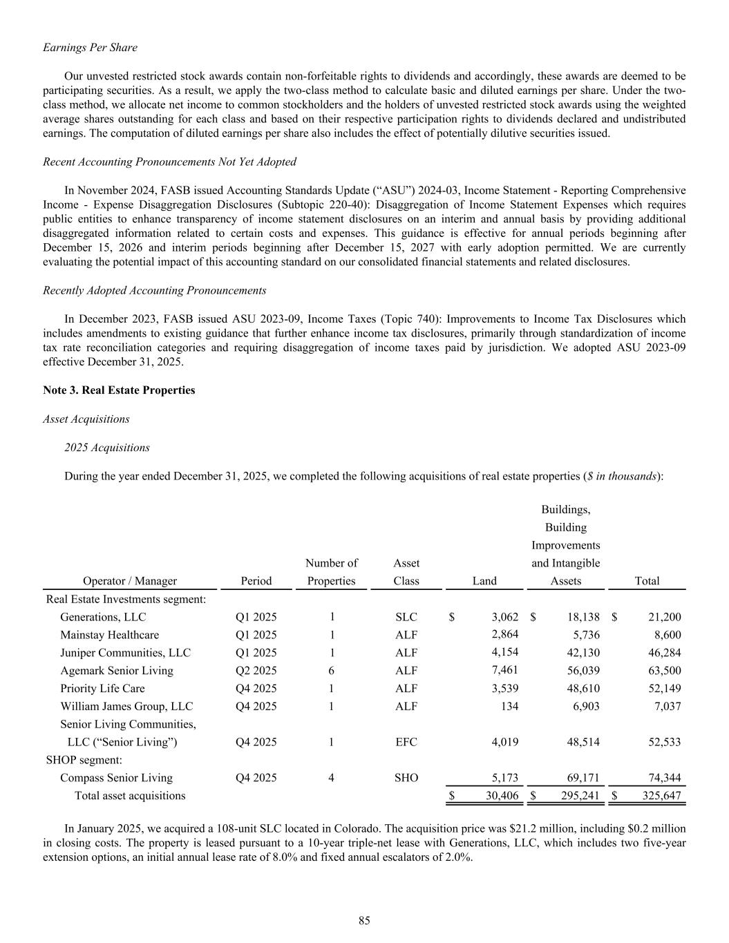 2025 Acquisitions During the year ended December 31, 2025, we completed the following acquisitions of real estate properties ($ in thousands): Buildings, Building Improvements Number of Asset and Intangible Operator / Manager Period Properties Class Land Assets Total Real Estate Investments segment: Generations, LLC Q1 2025 1 SLC $ 3,062 $ 18,138 $ 21,200 Mainstay Healthcare Q1 2025 1 ALF 2,864 5,736 8,600 Juniper Communities, LLC Q1 2025 1 ALF 4,154 42,130 46,284 Agemark Senior Living Q2 2025 6 ALF 7,461 56,039 63,500 Priority Life Care Q4 2025 1 ALF 3,539 48,610 52,149 William James Group, LLC Q4 2025 1 ALF 134 6,903 7,037 Senior Living Communities, LLC (“Senior Living”) Q4 2025 1 EFC 4,019 48,514 52,533 SHOP segment: Compass Senior Living Q4 2025 4 SHO 5,173 69,171 74,344 Total asset acquisitions $ 30,406 $ 295,241 $ 325,647 In January 2025, we acquired a 108-unit SLC located in Colorado. The acquisition price was $21.2 million, including $0.2 million in closing costs. The property is leased pursuant to a 10-year triple-net lease with Generations, LLC, which includes two five-year extension options, an initial annual lease rate of 8.0% and fixed annual escalators of 2.0%. Earnings Per Share Our unvested restricted stock awards contain non-forfeitable rights to dividends and accordingly, these awards are deemed to be participating securities. As a result, we apply the two-class method to calculate basic and diluted earnings per share. Under the two- class method, we allocate net income to common stockholders and the holders of unvested restricted stock awards using the weighted average shares outstanding for each class and based on their respective participation rights to dividends declared and undistributed earnings. The computation of diluted earnings per share also includes the effect of potentially dilutive securities issued. Recent Accounting Pronouncements Not Yet Adopted In November 2024, FASB issued Accounting Standards Update (“ASU”) 2024-03, Income Statement - Reporting Comprehensive Income - Expense Disaggregation Disclosures (Subtopic 220-40): Disaggregation of Income Statement Expenses which requires public entities to enhance transparency of income statement disclosures on an interim and annual basis by providing additional disaggregated information related to certain costs and expenses. This guidance is effective for annual periods beginning after December 15, 2026 and interim periods beginning after December 15, 2027 with early adoption permitted. We are currently evaluating the potential impact of this accounting standard on our consolidated financial statements and related disclosures. Recently Adopted Accounting Pronouncements In December 2023, FASB issued ASU 2023-09, Income Taxes (Topic 740): Improvements to Income Tax Disclosures which includes amendments to existing guidance that further enhance income tax disclosures, primarily through standardization of income tax rate reconciliation categories and requiring disaggregation of income taxes paid by jurisdiction. We adopted ASU 2023-09 effective December 31, 2025. Note 3. Real Estate Properties Asset Acquisitions 85