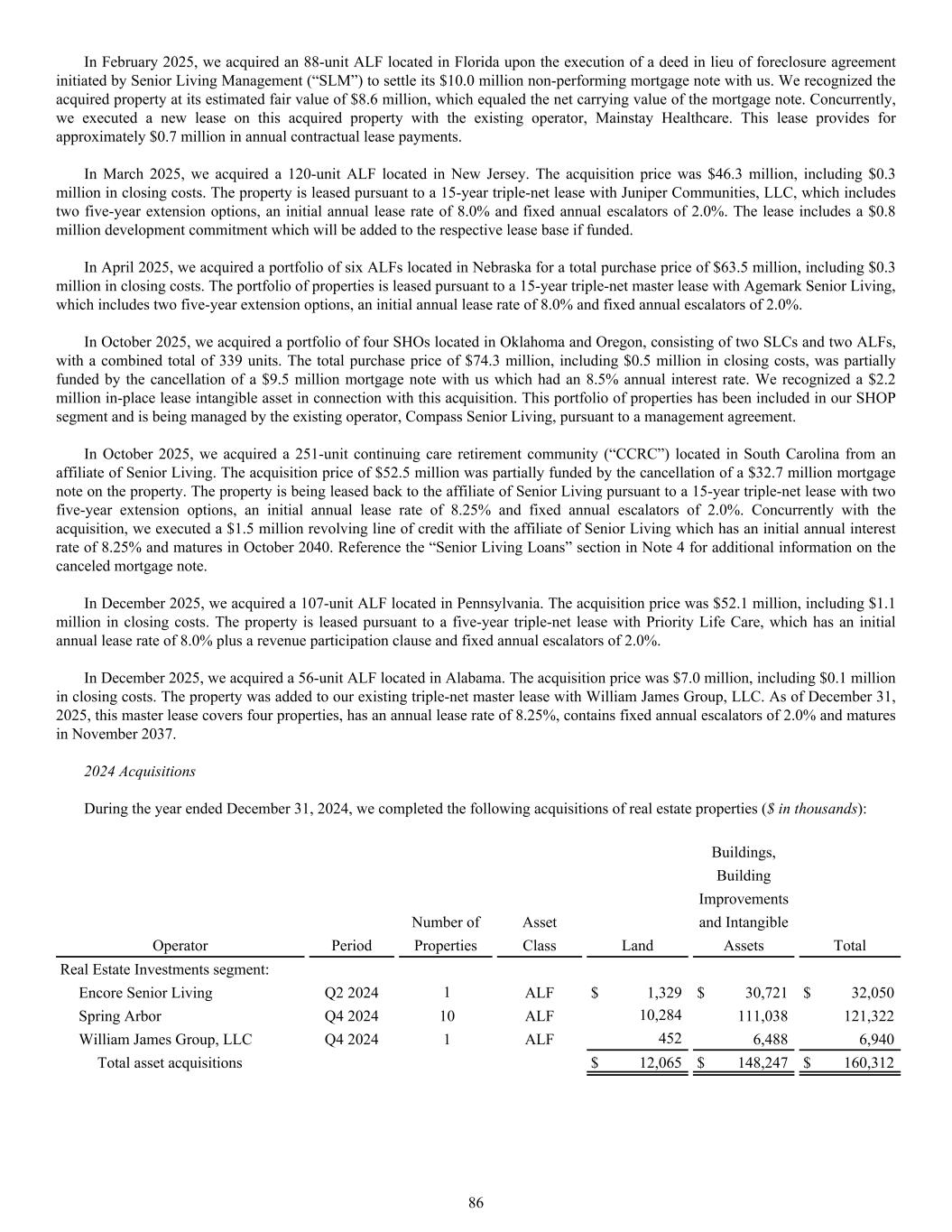 2024 Acquisitions During the year ended December 31, 2024, we completed the following acquisitions of real estate properties ($ in thousands): Buildings, Building Improvements Number of Asset and Intangible Operator Period Properties Class Land Assets Total Real Estate Investments segment: Encore Senior Living Q2 2024 1 ALF $ 1,329 $ 30,721 $ 32,050 Spring Arbor Q4 2024 10 ALF 10,284 111,038 121,322 William James Group, LLC Q4 2024 1 ALF 452 6,488 6,940 Total asset acquisitions $ 12,065 $ 148,247 $ 160,312 In February 2025, we acquired an 88-unit ALF located in Florida upon the execution of a deed in lieu of foreclosure agreement initiated by Senior Living Management (“SLM”) to settle its $10.0 million non-performing mortgage note with us. We recognized the acquired property at its estimated fair value of $8.6 million, which equaled the net carrying value of the mortgage note. Concurrently, we executed a new lease on this acquired property with the existing operator, Mainstay Healthcare. This lease provides for approximately $0.7 million in annual contractual lease payments. In March 2025, we acquired a 120-unit ALF located in New Jersey. The acquisition price was $46.3 million, including $0.3 million in closing costs. The property is leased pursuant to a 15-year triple-net lease with Juniper Communities, LLC, which includes two five-year extension options, an initial annual lease rate of 8.0% and fixed annual escalators of 2.0%. The lease includes a $0.8 million development commitment which will be added to the respective lease base if funded. In April 2025, we acquired a portfolio of six ALFs located in Nebraska for a total purchase price of $63.5 million, including $0.3 million in closing costs. The portfolio of properties is leased pursuant to a 15-year triple-net master lease with Agemark Senior Living, which includes two five-year extension options, an initial annual lease rate of 8.0% and fixed annual escalators of 2.0%. In October 2025, we acquired a portfolio of four SHOs located in Oklahoma and Oregon, consisting of two SLCs and two ALFs, with a combined total of 339 units. The total purchase price of $74.3 million, including $0.5 million in closing costs, was partially funded by the cancellation of a $9.5 million mortgage note with us which had an 8.5% annual interest rate. We recognized a $2.2 million in-place lease intangible asset in connection with this acquisition. This portfolio of properties has been included in our SHOP segment and is being managed by the existing operator, Compass Senior Living, pursuant to a management agreement. In October 2025, we acquired a 251-unit continuing care retirement community (“CCRC”) located in South Carolina from an affiliate of Senior Living. The acquisition price of $52.5 million was partially funded by the cancellation of a $32.7 million mortgage note on the property. The property is being leased back to the affiliate of Senior Living pursuant to a 15-year triple-net lease with two five-year extension options, an initial annual lease rate of 8.25% and fixed annual escalators of 2.0%. Concurrently with the acquisition, we executed a $1.5 million revolving line of credit with the affiliate of Senior Living which has an initial annual interest rate of 8.25% and matures in October 2040. Reference the “Senior Living Loans” section in Note 4 for additional information on the canceled mortgage note. In December 2025, we acquired a 107-unit ALF located in Pennsylvania. The acquisition price was $52.1 million, including $1.1 million in closing costs. The property is leased pursuant to a five-year triple-net lease with Priority Life Care, which has an initial annual lease rate of 8.0% plus a revenue participation clause and fixed annual escalators of 2.0%. In December 2025, we acquired a 56-unit ALF located in Alabama. The acquisition price was $7.0 million, including $0.1 million in closing costs. The property was added to our existing triple-net master lease with William James Group, LLC. As of December 31, 2025, this master lease covers four properties, has an annual lease rate of 8.25%, contains fixed annual escalators of 2.0% and matures in November 2037. 86