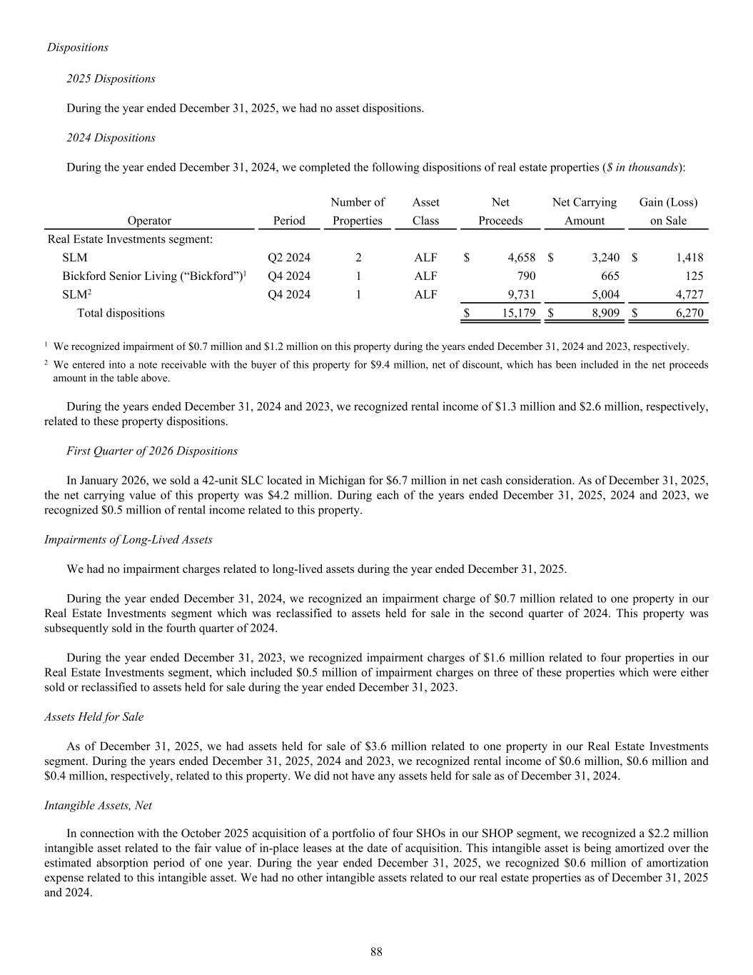 2025 Dispositions During the year ended December 31, 2025, we had no asset dispositions. 2024 Dispositions During the year ended December 31, 2024, we completed the following dispositions of real estate properties ($ in thousands): Number of Asset Net Net Carrying Gain (Loss) Operator Period Properties Class Proceeds Amount on Sale Real Estate Investments segment: SLM Q2 2024 2 ALF $ 4,658 $ 3,240 $ 1,418 Bickford Senior Living (“Bickford”)1 Q4 2024 1 ALF 790 665 125 SLM2 Q4 2024 1 ALF 9,731 5,004 4,727 Total dispositions $ 15,179 $ 8,909 $ 6,270 1 We recognized impairment of $0.7 million and $1.2 million on this property during the years ended December 31, 2024 and 2023, respectively. 2 We entered into a note receivable with the buyer of this property for $9.4 million, net of discount, which has been included in the net proceeds amount in the table above. During the years ended December 31, 2024 and 2023, we recognized rental income of $1.3 million and $2.6 million, respectively, related to these property dispositions. First Quarter of 2026 Dispositions In January 2026, we sold a 42-unit SLC located in Michigan for $6.7 million in net cash consideration. As of December 31, 2025, the net carrying value of this property was $4.2 million. During each of the years ended December 31, 2025, 2024 and 2023, we recognized $0.5 million of rental income related to this property. Impairments of Long-Lived Assets We had no impairment charges related to long-lived assets during the year ended December 31, 2025. During the year ended December 31, 2024, we recognized an impairment charge of $0.7 million related to one property in our Real Estate Investments segment which was reclassified to assets held for sale in the second quarter of 2024. This property was subsequently sold in the fourth quarter of 2024. During the year ended December 31, 2023, we recognized impairment charges of $1.6 million related to four properties in our Real Estate Investments segment, which included $0.5 million of impairment charges on three of these properties which were either sold or reclassified to assets held for sale during the year ended December 31, 2023. Assets Held for Sale As of December 31, 2025, we had assets held for sale of $3.6 million related to one property in our Real Estate Investments segment. During the years ended December 31, 2025, 2024 and 2023, we recognized rental income of $0.6 million, $0.6 million and $0.4 million, respectively, related to this property. We did not have any assets held for sale as of December 31, 2024. Intangible Assets, Net In connection with the October 2025 acquisition of a portfolio of four SHOs in our SHOP segment, we recognized a $2.2 million intangible asset related to the fair value of in-place leases at the date of acquisition. This intangible asset is being amortized over the estimated absorption period of one year. During the year ended December 31, 2025, we recognized $0.6 million of amortization expense related to this intangible asset. We had no other intangible assets related to our real estate properties as of December 31, 2025 and 2024. Dispositions 88