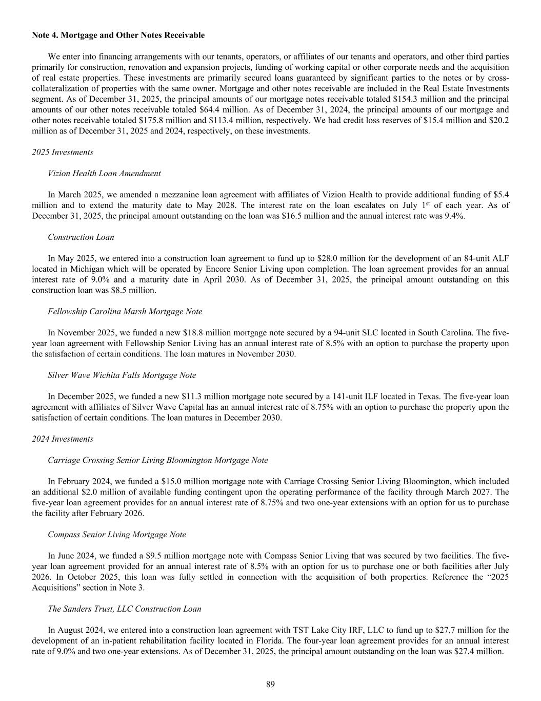 Note 4. Mortgage and Other Notes Receivable We enter into financing arrangements with our tenants, operators, or affiliates of our tenants and operators, and other third parties primarily for construction, renovation and expansion projects, funding of working capital or other corporate needs and the acquisition of real estate properties. These investments are primarily secured loans guaranteed by significant parties to the notes or by cross- collateralization of properties with the same owner. Mortgage and other notes receivable are included in the Real Estate Investments segment. As of December 31, 2025, the principal amounts of our mortgage notes receivable totaled $154.3 million and the principal amounts of our other notes receivable totaled $64.4 million. As of December 31, 2024, the principal amounts of our mortgage and other notes receivable totaled $175.8 million and $113.4 million, respectively. We had credit loss reserves of $15.4 million and $20.2 million as of December 31, 2025 and 2024, respectively, on these investments. 2025 Investments Vizion Health Loan Amendment In March 2025, we amended a mezzanine loan agreement with affiliates of Vizion Health to provide additional funding of $5.4 million and to extend the maturity date to May 2028. The interest rate on the loan escalates on July 1st of each year. As of December 31, 2025, the principal amount outstanding on the loan was $16.5 million and the annual interest rate was 9.4%. Construction Loan In May 2025, we entered into a construction loan agreement to fund up to $28.0 million for the development of an 84-unit ALF located in Michigan which will be operated by Encore Senior Living upon completion. The loan agreement provides for an annual interest rate of 9.0% and a maturity date in April 2030. As of December 31, 2025, the principal amount outstanding on this construction loan was $8.5 million. Fellowship Carolina Marsh Mortgage Note In November 2025, we funded a new $18.8 million mortgage note secured by a 94-unit SLC located in South Carolina. The five- year loan agreement with Fellowship Senior Living has an annual interest rate of 8.5% with an option to purchase the property upon the satisfaction of certain conditions. The loan matures in November 2030. Silver Wave Wichita Falls Mortgage Note In December 2025, we funded a new $11.3 million mortgage note secured by a 141-unit ILF located in Texas. The five-year loan agreement with affiliates of Silver Wave Capital has an annual interest rate of 8.75% with an option to purchase the property upon the satisfaction of certain conditions. The loan matures in December 2030. 2024 Investments Carriage Crossing Senior Living Bloomington Mortgage Note In February 2024, we funded a $15.0 million mortgage note with Carriage Crossing Senior Living Bloomington, which included an additional $2.0 million of available funding contingent upon the operating performance of the facility through March 2027. The five-year loan agreement provides for an annual interest rate of 8.75% and two one-year extensions with an option for us to purchase the facility after February 2026. Compass Senior Living Mortgage Note In June 2024, we funded a $9.5 million mortgage note with Compass Senior Living that was secured by two facilities. The five- year loan agreement provided for an annual interest rate of 8.5% with an option for us to purchase one or both facilities after July 2026. In October 2025, this loan was fully settled in connection with the acquisition of both properties. Reference the “2025 Acquisitions” section in Note 3. The Sanders Trust, LLC Construction Loan In August 2024, we entered into a construction loan agreement with TST Lake City IRF, LLC to fund up to $27.7 million for the development of an in-patient rehabilitation facility located in Florida. The four-year loan agreement provides for an annual interest rate of 9.0% and two one-year extensions. As of December 31, 2025, the principal amount outstanding on the loan was $27.4 million. 89