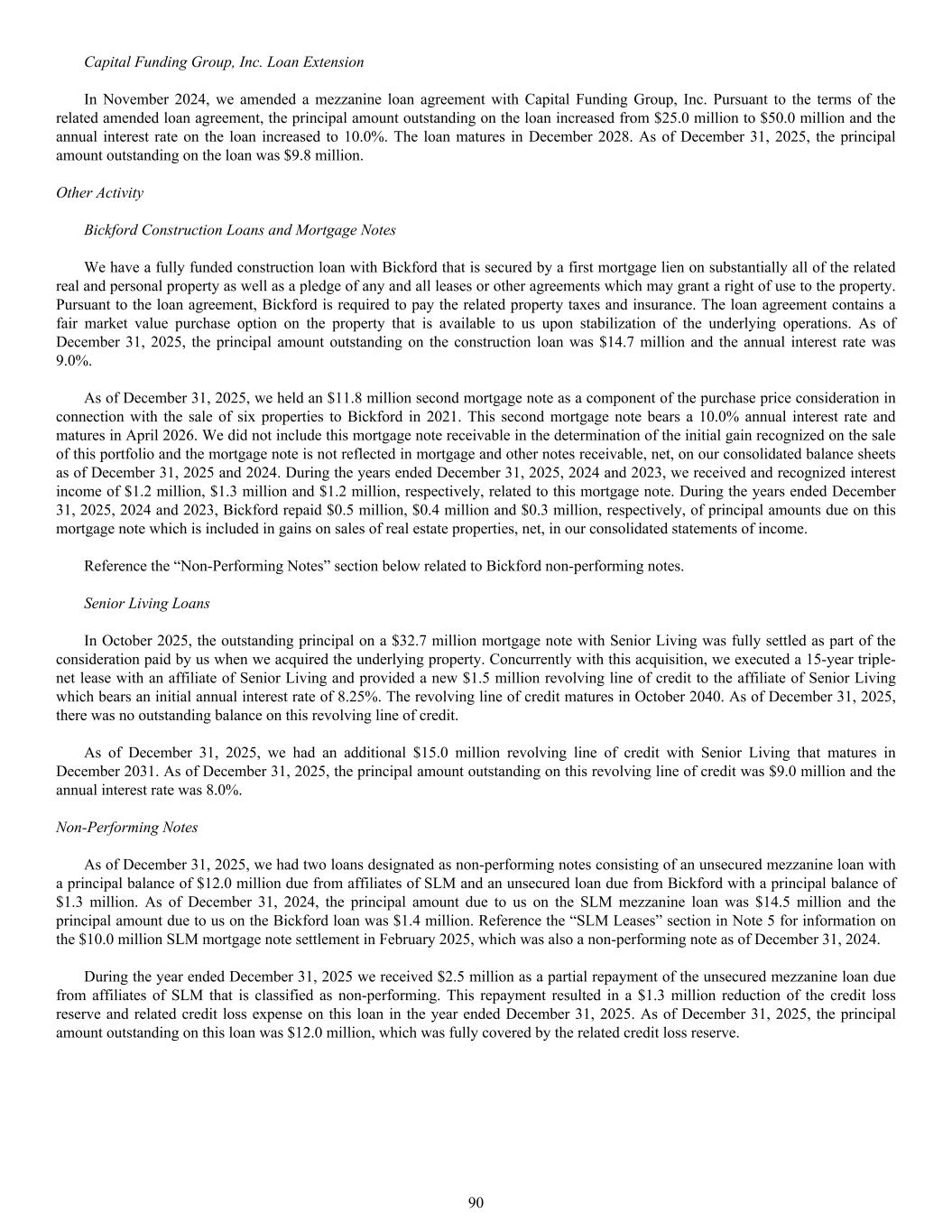 Reference the “Non-Performing Notes” section below related to Bickford non-performing notes. Senior Living Loans In October 2025, the outstanding principal on a $32.7 million mortgage note with Senior Living was fully settled as part of the consideration paid by us when we acquired the underlying property. Concurrently with this acquisition, we executed a 15-year triple- net lease with an affiliate of Senior Living and provided a new $1.5 million revolving line of credit to the affiliate of Senior Living which bears an initial annual interest rate of 8.25%. The revolving line of credit matures in October 2040. As of December 31, 2025, there was no outstanding balance on this revolving line of credit. As of December 31, 2025, we had an additional $15.0 million revolving line of credit with Senior Living that matures in December 2031. As of December 31, 2025, the principal amount outstanding on this revolving line of credit was $9.0 million and the annual interest rate was 8.0%. Non-Performing Notes As of December 31, 2025, we had two loans designated as non-performing notes consisting of an unsecured mezzanine loan with a principal balance of $12.0 million due from affiliates of SLM and an unsecured loan due from Bickford with a principal balance of $1.3 million. As of December 31, 2024, the principal amount due to us on the SLM mezzanine loan was $14.5 million and the principal amount due to us on the Bickford loan was $1.4 million. Reference the “SLM Leases” section in Note 5 for information on the $10.0 million SLM mortgage note settlement in February 2025, which was also a non-performing note as of December 31, 2024. During the year ended December 31, 2025 we received $2.5 million as a partial repayment of the unsecured mezzanine loan due from affiliates of SLM that is classified as non-performing. This repayment resulted in a $1.3 million reduction of the credit loss reserve and related credit loss expense on this loan in the year ended December 31, 2025. As of December 31, 2025, the principal amount outstanding on this loan was $12.0 million, which was fully covered by the related credit loss reserve. Capital Funding Group, Inc. Loan Extension In November 2024, we amended a mezzanine loan agreement with Capital Funding Group, Inc. Pursuant to the terms of the related amended loan agreement, the principal amount outstanding on the loan increased from $25.0 million to $50.0 million and the annual interest rate on the loan increased to 10.0%. The loan matures in December 2028. As of December 31, 2025, the principal amount outstanding on the loan was $9.8 million. Other Activity Bickford Construction Loans and Mortgage Notes We have a fully funded construction loan with Bickford that is secured by a first mortgage lien on substantially all of the related real and personal property as well as a pledge of any and all leases or other agreements which may grant a right of use to the property. Pursuant to the loan agreement, Bickford is required to pay the related property taxes and insurance. The loan agreement contains a fair market value purchase option on the property that is available to us upon stabilization of the underlying operations. As of December 31, 2025, the principal amount outstanding on the construction loan was $14.7 million and the annual interest rate was 9.0%. As of December 31, 2025, we held an $11.8 million second mortgage note as a component of the purchase price consideration in connection with the sale of six properties to Bickford in 2021. This second mortgage note bears a 10.0% annual interest rate and matures in April 2026. We did not include this mortgage note receivable in the determination of the initial gain recognized on the sale of this portfolio and the mortgage note is not reflected in mortgage and other notes receivable, net, on our consolidated balance sheets as of December 31, 2025 and 2024. During the years ended December 31, 2025, 2024 and 2023, we received and recognized interest income of $1.2 million, $1.3 million and $1.2 million, respectively, related to this mortgage note. During the years ended December 31, 2025, 2024 and 2023, Bickford repaid $0.5 million, $0.4 million and $0.3 million, respectively, of principal amounts due on this mortgage note which is included in gains on sales of real estate properties, net, in our consolidated statements of income. 90