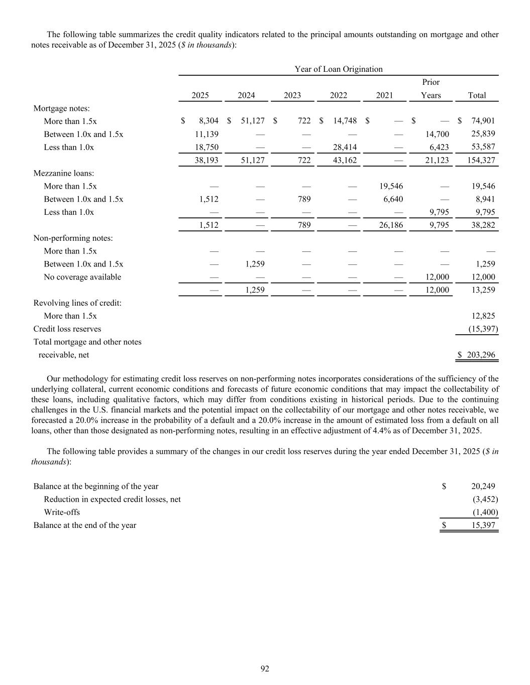 Year of Loan Origination Prior 2025 2024 2023 2022 2021 Years Total Mortgage notes: More than 1.5x $ 8,304 $ 51,127 $ 722 $ 14,748 $ — $ — $ 74,901 Between 1.0x and 1.5x 11,139 — — — — 14,700 25,839 Less than 1.0x 18,750 — — 28,414 — 6,423 53,587 38,193 51,127 722 43,162 — 21,123 154,327 Mezzanine loans: More than 1.5x — — — — 19,546 — 19,546 Between 1.0x and 1.5x 1,512 — 789 — 6,640 — 8,941 Less than 1.0x — — — — — 9,795 9,795 1,512 — 789 — 26,186 9,795 38,282 Non-performing notes: More than 1.5x — — — — — — — Between 1.0x and 1.5x — 1,259 — — — — 1,259 No coverage available — — — — — 12,000 12,000 — 1,259 — — — 12,000 13,259 Revolving lines of credit: More than 1.5x 12,825 Credit loss reserves (15,397) Total mortgage and other notes receivable, net $ 203,296 Our methodology for estimating credit loss reserves on non-performing notes incorporates considerations of the sufficiency of the underlying collateral, current economic conditions and forecasts of future economic conditions that may impact the collectability of these loans, including qualitative factors, which may differ from conditions existing in historical periods. Due to the continuing challenges in the U.S. financial markets and the potential impact on the collectability of our mortgage and other notes receivable, we forecasted a 20.0% increase in the probability of a default and a 20.0% increase in the amount of estimated loss from a default on all loans, other than those designated as non-performing notes, resulting in an effective adjustment of 4.4% as of December 31, 2025. The following table provides a summary of the changes in our credit loss reserves during the year ended December 31, 2025 ($ in thousands): Balance at the beginning of the year $ 20,249 Reduction in expected credit losses, net (3,452) Write-offs (1,400) Balance at the end of the year $ 15,397 The following table summarizes the credit quality indicators related to the principal amounts outstanding on mortgage and other notes receivable as of December 31, 2025 ($ in thousands): 92