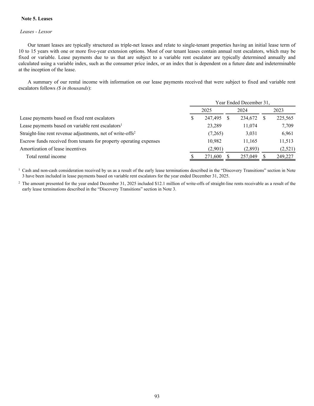 Our tenant leases are typically structured as triple-net leases and relate to single-tenant properties having an initial lease term of 10 to 15 years with one or more five-year extension options. Most of our tenant leases contain annual rent escalators, which may be fixed or variable. Lease payments due to us that are subject to a variable rent escalator are typically determined annually and calculated using a variable index, such as the consumer price index, or an index that is dependent on a future date and indeterminable at the inception of the lease. A summary of our rental income with information on our lease payments received that were subject to fixed and variable rent escalators follows ($ in thousands): Year Ended December 31, 2025 2024 2023 Lease payments based on fixed rent escalators $ 247,495 $ 234,672 $ 225,565 Lease payments based on variable rent escalators1 23,289 11,074 7,709 Straight-line rent revenue adjustments, net of write-offs2 (7,265) 3,031 6,961 Escrow funds received from tenants for property operating expenses 10,982 11,165 11,513 Amortization of lease incentives (2,901) (2,893) (2,521) Total rental income $ 271,600 $ 257,049 $ 249,227 1 Cash and non-cash consideration received by us as a result of the early lease terminations described in the “Discovery Transitions” section in Note 3 have been included in lease payments based on variable rent escalators for the year ended December 31, 2025. 2 The amount presented for the year ended December 31, 2025 included $12.1 million of write-offs of straight-line rents receivable as a result of the early lease terminations described in the “Discovery Transitions” section in Note 3. Note 5. Leases Leases - Lessor 93