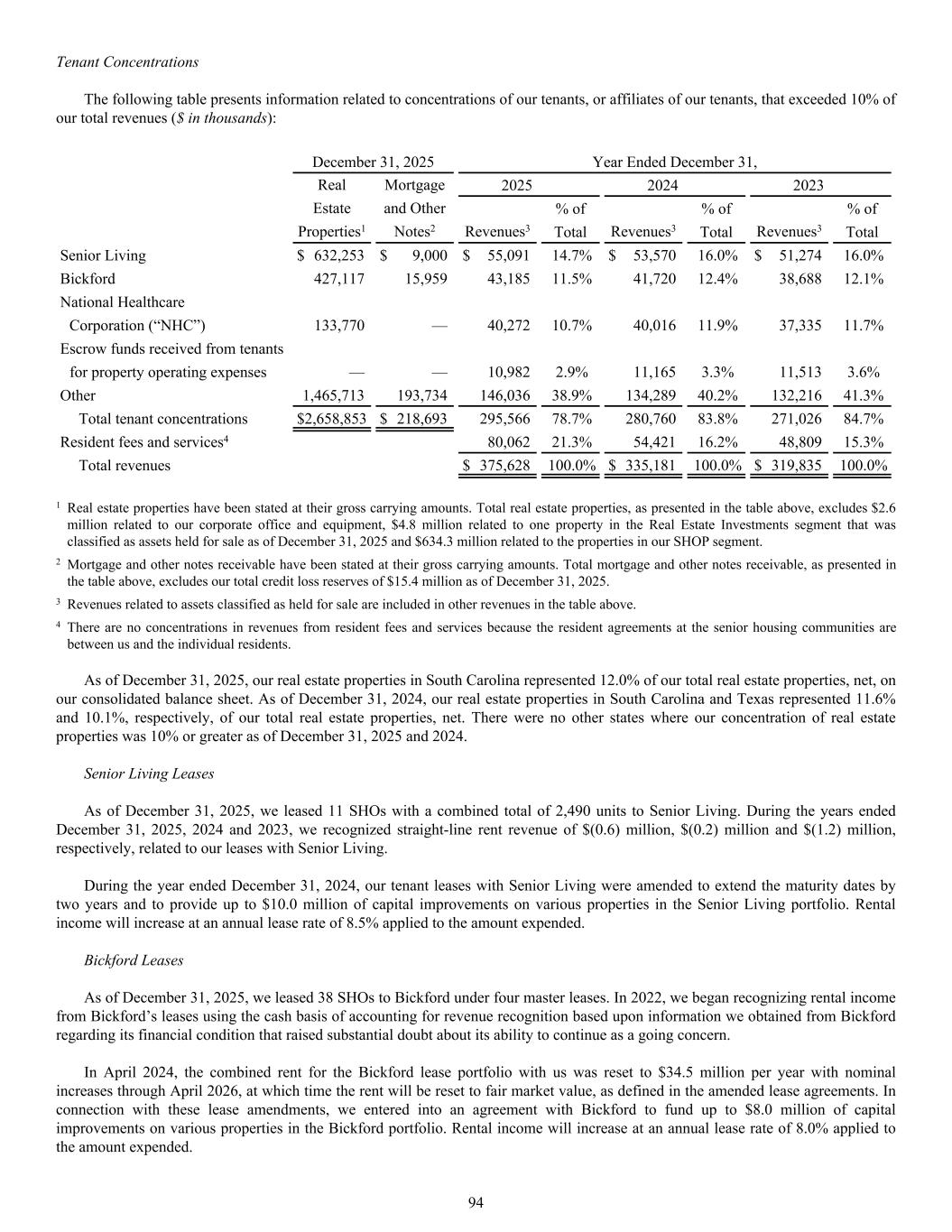 December 31, 2025 Year Ended December 31, Real Mortgage 2025 2024 2023 Estate and Other % of % of % of Properties1 Notes2 Revenues3 Total Revenues3 Total Revenues3 Total Senior Living $ 632,253 $ 9,000 $ 55,091 14.7% $ 53,570 16.0% $ 51,274 16.0% Bickford 427,117 15,959 43,185 11.5% 41,720 12.4% 38,688 12.1% National Healthcare Corporation (“NHC”) 133,770 — 40,272 10.7% 40,016 11.9% 37,335 11.7% Escrow funds received from tenants for property operating expenses — — 10,982 2.9% 11,165 3.3% 11,513 3.6% Other 1,465,713 193,734 146,036 38.9% 134,289 40.2% 132,216 41.3% Total tenant concentrations $ 2,658,853 $ 218,693 295,566 78.7% 280,760 83.8% 271,026 84.7% Resident fees and services4 80,062 21.3% 54,421 16.2% 48,809 15.3% Total revenues $ 375,628 100.0% $ 335,181 100.0% $ 319,835 100.0% 1 Real estate properties have been stated at their gross carrying amounts. Total real estate properties, as presented in the table above, excludes $2.6 million related to our corporate office and equipment, $4.8 million related to one property in the Real Estate Investments segment that was classified as assets held for sale as of December 31, 2025 and $634.3 million related to the properties in our SHOP segment. 2 Mortgage and other notes receivable have been stated at their gross carrying amounts. Total mortgage and other notes receivable, as presented in the table above, excludes our total credit loss reserves of $15.4 million as of December 31, 2025. 3 Revenues related to assets classified as held for sale are included in other revenues in the table above. 4 There are no concentrations in revenues from resident fees and services because the resident agreements at the senior housing communities are between us and the individual residents. As of December 31, 2025, our real estate properties in South Carolina represented 12.0% of our total real estate properties, net, on our consolidated balance sheet. As of December 31, 2024, our real estate properties in South Carolina and Texas represented 11.6% and 10.1%, respectively, of our total real estate properties, net. There were no other states where our concentration of real estate properties was 10% or greater as of December 31, 2025 and 2024. Senior Living Leases As of December 31, 2025, we leased 11 SHOs with a combined total of 2,490 units to Senior Living. During the years ended December 31, 2025, 2024 and 2023, we recognized straight-line rent revenue of $(0.6) million, $(0.2) million and $(1.2) million, respectively, related to our leases with Senior Living. During the year ended December 31, 2024, our tenant leases with Senior Living were amended to extend the maturity dates by two years and to provide up to $10.0 million of capital improvements on various properties in the Senior Living portfolio. Rental income will increase at an annual lease rate of 8.5% applied to the amount expended. Bickford Leases As of December 31, 2025, we leased 38 SHOs to Bickford under four master leases. In 2022, we began recognizing rental income from Bickford’s leases using the cash basis of accounting for revenue recognition based upon information we obtained from Bickford regarding its financial condition that raised substantial doubt about its ability to continue as a going concern. In April 2024, the combined rent for the Bickford lease portfolio with us was reset to $34.5 million per year with nominal increases through April 2026, at which time the rent will be reset to fair market value, as defined in the amended lease agreements. In connection with these lease amendments, we entered into an agreement with Bickford to fund up to $8.0 million of capital improvements on various properties in the Bickford portfolio. Rental income will increase at an annual lease rate of 8.0% applied to the amount expended. Tenant Concentrations The following table presents information related to concentrations of our tenants, or affiliates of our tenants, that exceeded 10% of our total revenues ($ in thousands): 94