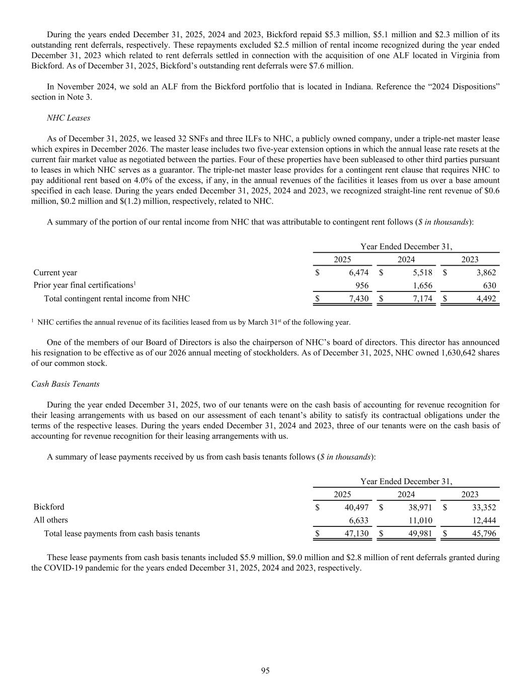 A summary of the portion of our rental income from NHC that was attributable to contingent rent follows ($ in thousands): Year Ended December 31, 2025 2024 2023 Current year $ 6,474 $ 5,518 $ 3,862 Prior year final certifications1 956 1,656 630 Total contingent rental income from NHC $ 7,430 $ 7,174 $ 4,492 1 NHC certifies the annual revenue of its facilities leased from us by March 31st of the following year. One of the members of our Board of Directors is also the chairperson of NHC’s board of directors. This director has announced his resignation to be effective as of our 2026 annual meeting of stockholders. As of December 31, 2025, NHC owned 1,630,642 shares of our common stock. Cash Basis Tenants During the year ended December 31, 2025, two of our tenants were on the cash basis of accounting for revenue recognition for their leasing arrangements with us based on our assessment of each tenant’s ability to satisfy its contractual obligations under the terms of the respective leases. During the years ended December 31, 2024 and 2023, three of our tenants were on the cash basis of accounting for revenue recognition for their leasing arrangements with us. A summary of lease payments received by us from cash basis tenants follows ($ in thousands): Year Ended December 31, 2025 2024 2023 Bickford $ 40,497 $ 38,971 $ 33,352 All others 6,633 11,010 12,444 Total lease payments from cash basis tenants $ 47,130 $ 49,981 $ 45,796 These lease payments from cash basis tenants included $5.9 million, $9.0 million and $2.8 million of rent deferrals granted during the COVID-19 pandemic for the years ended December 31, 2025, 2024 and 2023, respectively. During the years ended December 31, 2025, 2024 and 2023, Bickford repaid $5.3 million, $5.1 million and $2.3 million of its outstanding rent deferrals, respectively. These repayments excluded $2.5 million of rental income recognized during the year ended December 31, 2023 which related to rent deferrals settled in connection with the acquisition of one ALF located in Virginia from Bickford. As of December 31, 2025, Bickford’s outstanding rent deferrals were $7.6 million. In November 2024, we sold an ALF from the Bickford portfolio that is located in Indiana. Reference the “2024 Dispositions” section in Note 3. NHC Leases As of December 31, 2025, we leased 32 SNFs and three ILFs to NHC, a publicly owned company, under a triple-net master lease which expires in December 2026. The master lease includes two five-year extension options in which the annual lease rate resets at the current fair market value as negotiated between the parties. Four of these properties have been subleased to other third parties pursuant to leases in which NHC serves as a guarantor. The triple-net master lease provides for a contingent rent clause that requires NHC to pay additional rent based on 4.0% of the excess, if any, in the annual revenues of the facilities it leases from us over a base amount specified in each lease. During the years ended December 31, 2025, 2024 and 2023, we recognized straight-line rent revenue of $0.6 million, $0.2 million and $(1.2) million, respectively, related to NHC. 95