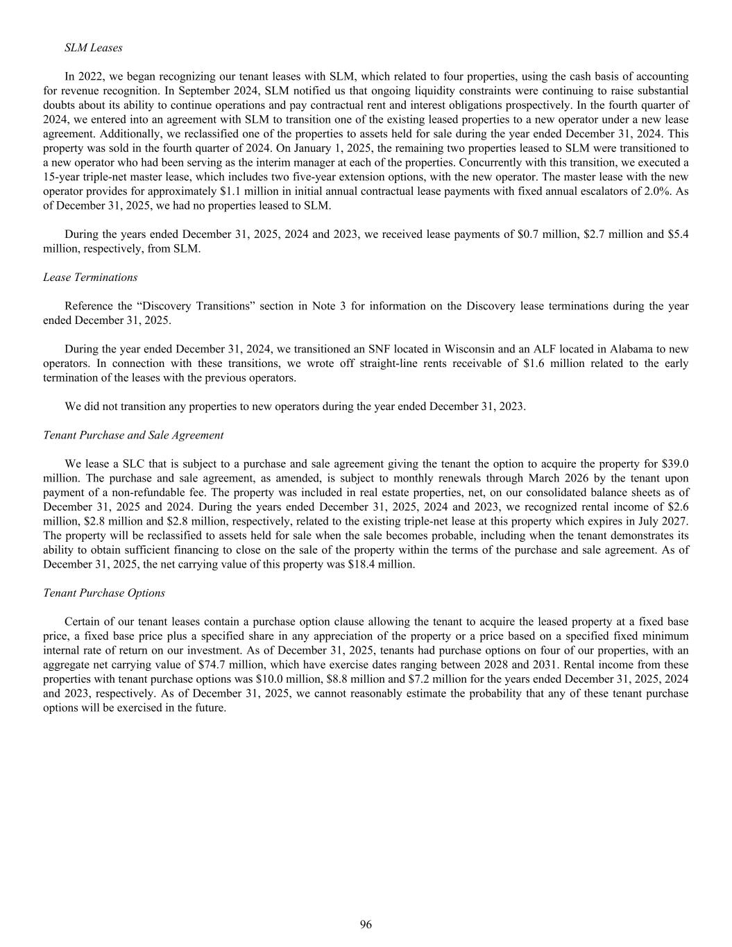 SLM Leases In 2022, we began recognizing our tenant leases with SLM, which related to four properties, using the cash basis of accounting for revenue recognition. In September 2024, SLM notified us that ongoing liquidity constraints were continuing to raise substantial doubts about its ability to continue operations and pay contractual rent and interest obligations prospectively. In the fourth quarter of 2024, we entered into an agreement with SLM to transition one of the existing leased properties to a new operator under a new lease agreement. Additionally, we reclassified one of the properties to assets held for sale during the year ended December 31, 2024. This property was sold in the fourth quarter of 2024. On January 1, 2025, the remaining two properties leased to SLM were transitioned to a new operator who had been serving as the interim manager at each of the properties. Concurrently with this transition, we executed a 15-year triple-net master lease, which includes two five-year extension options, with the new operator. The master lease with the new operator provides for approximately $1.1 million in initial annual contractual lease payments with fixed annual escalators of 2.0%. As of December 31, 2025, we had no properties leased to SLM. During the years ended December 31, 2025, 2024 and 2023, we received lease payments of $0.7 million, $2.7 million and $5.4 million, respectively, from SLM. Lease Terminations Reference the “Discovery Transitions” section in Note 3 for information on the Discovery lease terminations during the year ended December 31, 2025. During the year ended December 31, 2024, we transitioned an SNF located in Wisconsin and an ALF located in Alabama to new operators. In connection with these transitions, we wrote off straight-line rents receivable of $1.6 million related to the early termination of the leases with the previous operators. We did not transition any properties to new operators during the year ended December 31, 2023. Tenant Purchase and Sale Agreement We lease a SLC that is subject to a purchase and sale agreement giving the tenant the option to acquire the property for $39.0 million. The purchase and sale agreement, as amended, is subject to monthly renewals through March 2026 by the tenant upon payment of a non-refundable fee. The property was included in real estate properties, net, on our consolidated balance sheets as of December 31, 2025 and 2024. During the years ended December 31, 2025, 2024 and 2023, we recognized rental income of $2.6 million, $2.8 million and $2.8 million, respectively, related to the existing triple-net lease at this property which expires in July 2027. The property will be reclassified to assets held for sale when the sale becomes probable, including when the tenant demonstrates its ability to obtain sufficient financing to close on the sale of the property within the terms of the purchase and sale agreement. As of December 31, 2025, the net carrying value of this property was $18.4 million. Tenant Purchase Options Certain of our tenant leases contain a purchase option clause allowing the tenant to acquire the leased property at a fixed base price, a fixed base price plus a specified share in any appreciation of the property or a price based on a specified fixed minimum internal rate of return on our investment. As of December 31, 2025, tenants had purchase options on four of our properties, with an aggregate net carrying value of $74.7 million, which have exercise dates ranging between 2028 and 2031. Rental income from these properties with tenant purchase options was $10.0 million, $8.8 million and $7.2 million for the years ended December 31, 2025, 2024 and 2023, respectively. As of December 31, 2025, we cannot reasonably estimate the probability that any of these tenant purchase options will be exercised in the future. 96