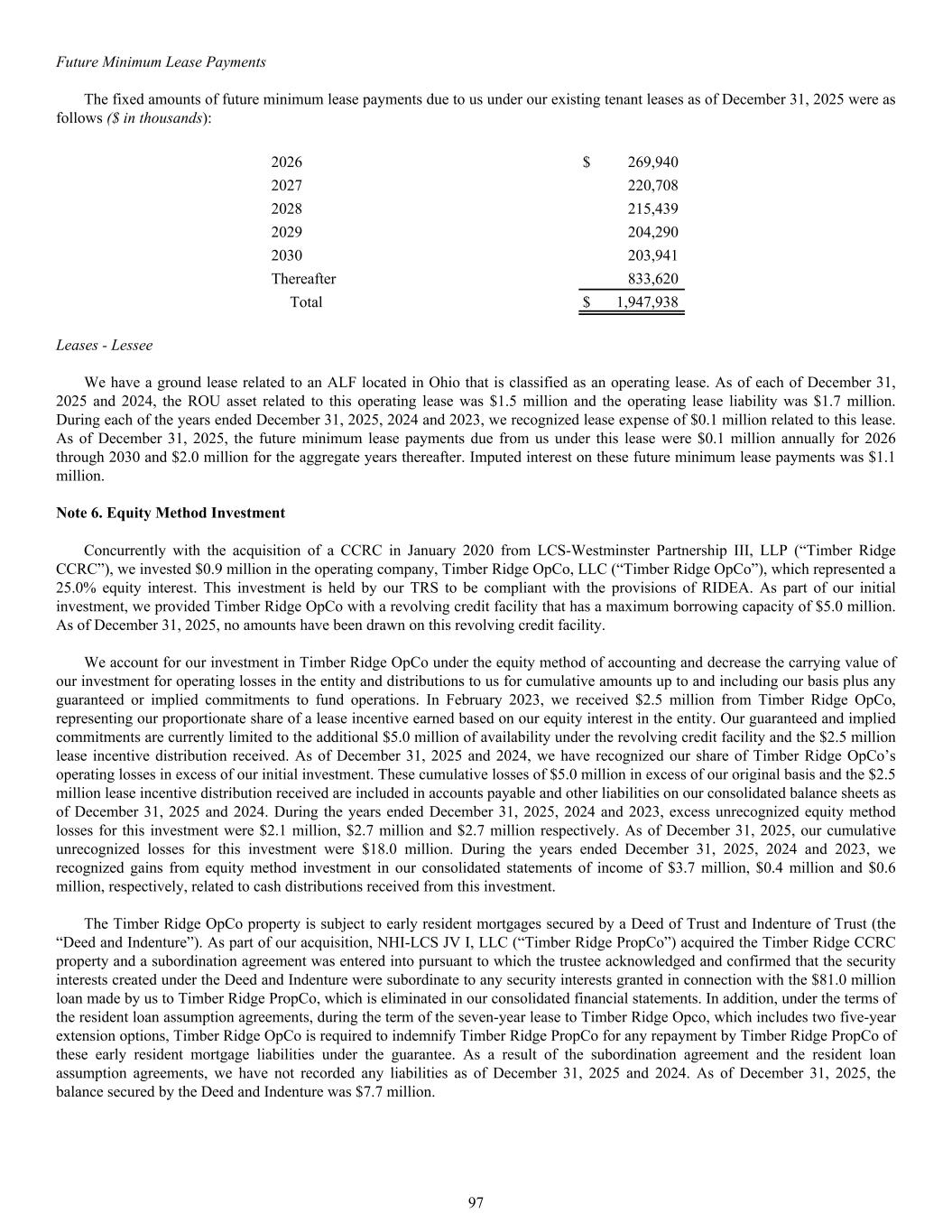 2026 $ 269,940 2027 220,708 2028 215,439 2029 204,290 2030 203,941 Thereafter 833,620 Total $ 1,947,938 Leases - Lessee We have a ground lease related to an ALF located in Ohio that is classified as an operating lease. As of each of December 31, 2025 and 2024, the ROU asset related to this operating lease was $1.5 million and the operating lease liability was $1.7 million. During each of the years ended December 31, 2025, 2024 and 2023, we recognized lease expense of $0.1 million related to this lease. As of December 31, 2025, the future minimum lease payments due from us under this lease were $0.1 million annually for 2026 through 2030 and $2.0 million for the aggregate years thereafter. Imputed interest on these future minimum lease payments was $1.1 million. Note 6. Equity Method Investment Concurrently with the acquisition of a CCRC in January 2020 from LCS-Westminster Partnership III, LLP (“Timber Ridge CCRC”), we invested $0.9 million in the operating company, Timber Ridge OpCo, LLC (“Timber Ridge OpCo”), which represented a 25.0% equity interest. This investment is held by our TRS to be compliant with the provisions of RIDEA. As part of our initial investment, we provided Timber Ridge OpCo with a revolving credit facility that has a maximum borrowing capacity of $5.0 million. As of December 31, 2025, no amounts have been drawn on this revolving credit facility. We account for our investment in Timber Ridge OpCo under the equity method of accounting and decrease the carrying value of our investment for operating losses in the entity and distributions to us for cumulative amounts up to and including our basis plus any guaranteed or implied commitments to fund operations. In February 2023, we received $2.5 million from Timber Ridge OpCo, representing our proportionate share of a lease incentive earned based on our equity interest in the entity. Our guaranteed and implied commitments are currently limited to the additional $5.0 million of availability under the revolving credit facility and the $2.5 million lease incentive distribution received. As of December 31, 2025 and 2024, we have recognized our share of Timber Ridge OpCo’s operating losses in excess of our initial investment. These cumulative losses of $5.0 million in excess of our original basis and the $2.5 million lease incentive distribution received are included in accounts payable and other liabilities on our consolidated balance sheets as of December 31, 2025 and 2024. During the years ended December 31, 2025, 2024 and 2023, excess unrecognized equity method losses for this investment were $2.1 million, $2.7 million and $2.7 million respectively. As of December 31, 2025, our cumulative unrecognized losses for this investment were $18.0 million. During the years ended December 31, 2025, 2024 and 2023, we recognized gains from equity method investment in our consolidated statements of income of $3.7 million, $0.4 million and $0.6 million, respectively, related to cash distributions received from this investment. The Timber Ridge OpCo property is subject to early resident mortgages secured by a Deed of Trust and Indenture of Trust (the “Deed and Indenture”). As part of our acquisition, NHI-LCS JV I, LLC (“Timber Ridge PropCo”) acquired the Timber Ridge CCRC property and a subordination agreement was entered into pursuant to which the trustee acknowledged and confirmed that the security interests created under the Deed and Indenture were subordinate to any security interests granted in connection with the $81.0 million loan made by us to Timber Ridge PropCo, which is eliminated in our consolidated financial statements. In addition, under the terms of the resident loan assumption agreements, during the term of the seven-year lease to Timber Ridge Opco, which includes two five-year extension options, Timber Ridge OpCo is required to indemnify Timber Ridge PropCo for any repayment by Timber Ridge PropCo of these early resident mortgage liabilities under the guarantee. As a result of the subordination agreement and the resident loan assumption agreements, we have not recorded any liabilities as of December 31, 2025 and 2024. As of December 31, 2025, the balance secured by the Deed and Indenture was $7.7 million. Future Minimum Lease Payments The fixed amounts of future minimum lease payments due to us under our existing tenant leases as of December 31, 2025 were as follows ($ in thousands): 97