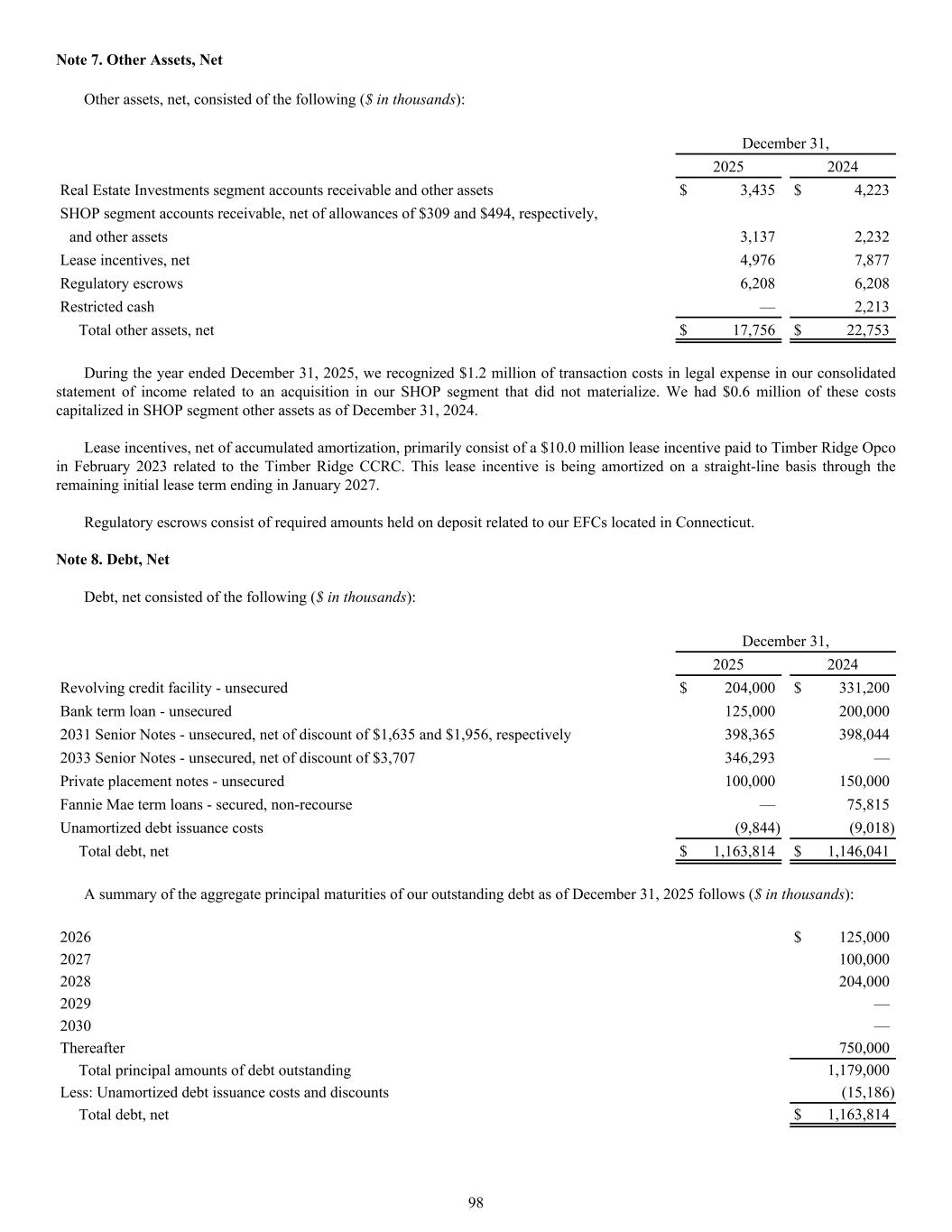 Other assets, net, consisted of the following ($ in thousands): December 31, 2025 2024 Real Estate Investments segment accounts receivable and other assets $ 3,435 $ 4,223 SHOP segment accounts receivable, net of allowances of $309 and $494, respectively, and other assets 3,137 2,232 Lease incentives, net 4,976 7,877 Regulatory escrows 6,208 6,208 Restricted cash — 2,213 Total other assets, net $ 17,756 $ 22,753 During the year ended December 31, 2025, we recognized $1.2 million of transaction costs in legal expense in our consolidated statement of income related to an acquisition in our SHOP segment that did not materialize. We had $0.6 million of these costs capitalized in SHOP segment other assets as of December 31, 2024. Lease incentives, net of accumulated amortization, primarily consist of a $10.0 million lease incentive paid to Timber Ridge Opco in February 2023 related to the Timber Ridge CCRC. This lease incentive is being amortized on a straight-line basis through the remaining initial lease term ending in January 2027. Regulatory escrows consist of required amounts held on deposit related to our EFCs located in Connecticut. Note 8. Debt, Net Debt, net consisted of the following ($ in thousands): December 31, 2025 2024 Revolving credit facility - unsecured $ 204,000 $ 331,200 Bank term loan - unsecured 125,000 200,000 2031 Senior Notes - unsecured, net of discount of $1,635 and $1,956, respectively 398,365 398,044 2033 Senior Notes - unsecured, net of discount of $3,707 346,293 — Private placement notes - unsecured 100,000 150,000 Fannie Mae term loans - secured, non-recourse — 75,815 Unamortized debt issuance costs (9,844) (9,018) Total debt, net $ 1,163,814 $ 1,146,041 A summary of the aggregate principal maturities of our outstanding debt as of December 31, 2025 follows ($ in thousands): 2026 $ 125,000 2027 100,000 2028 204,000 2029 — 2030 — Thereafter 750,000 Total principal amounts of debt outstanding 1,179,000 Less: Unamortized debt issuance costs and discounts (15,186) Total debt, net $ 1,163,814 Note 7. Other Assets, Net 98